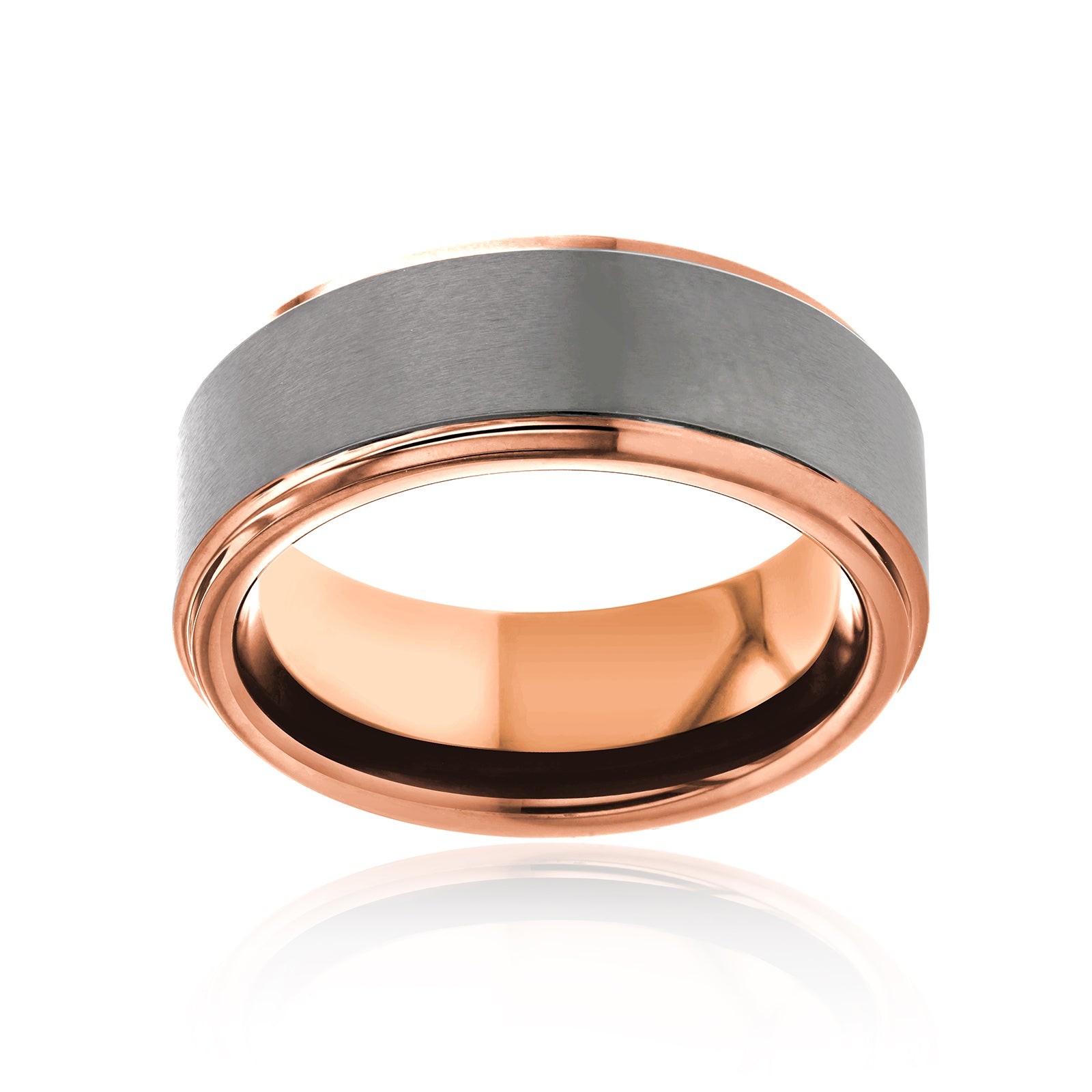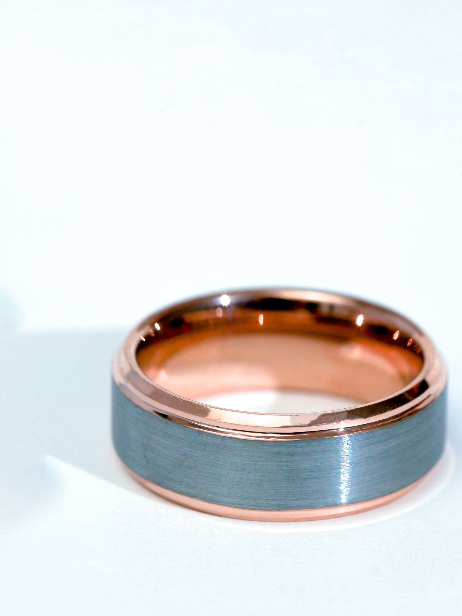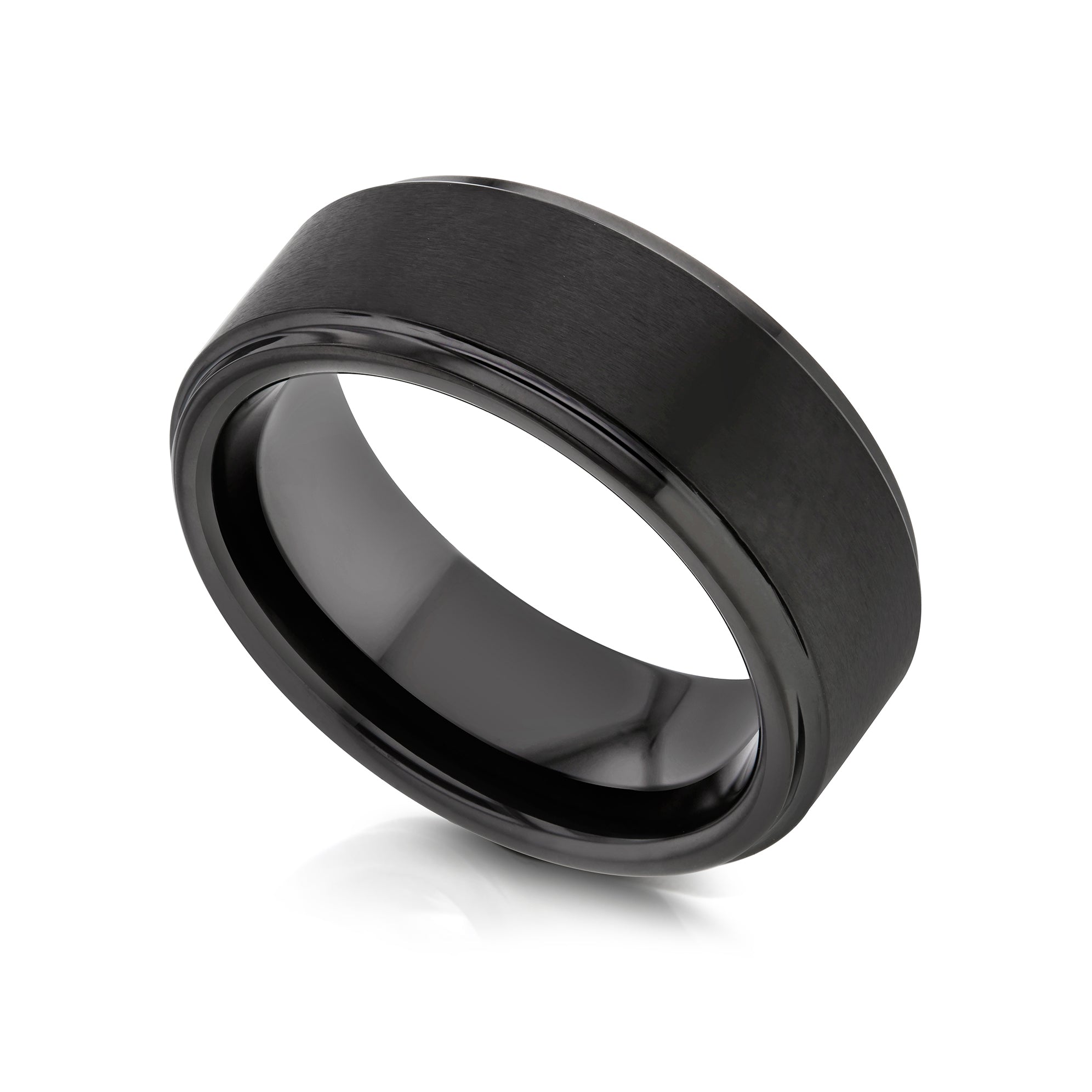 A brushed matte texture wraps the exterior of the ring with a stepped polished edge. A glossy sleeve ensures a comfortable fit to be easily worn all day.