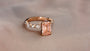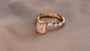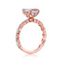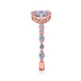 Intensely pink and charmingly feminine, this emerald-cut diamond is set to go down in history. Lining the band are alternating round and marquise-cut white diamonds in scalloped bead-prong settings. This unique bubble-like setting allows for your diamonds to truly stand out, as opposed to more metal-heavy settings where your sparkling diamonds would need to share the attention and be dimmed down.