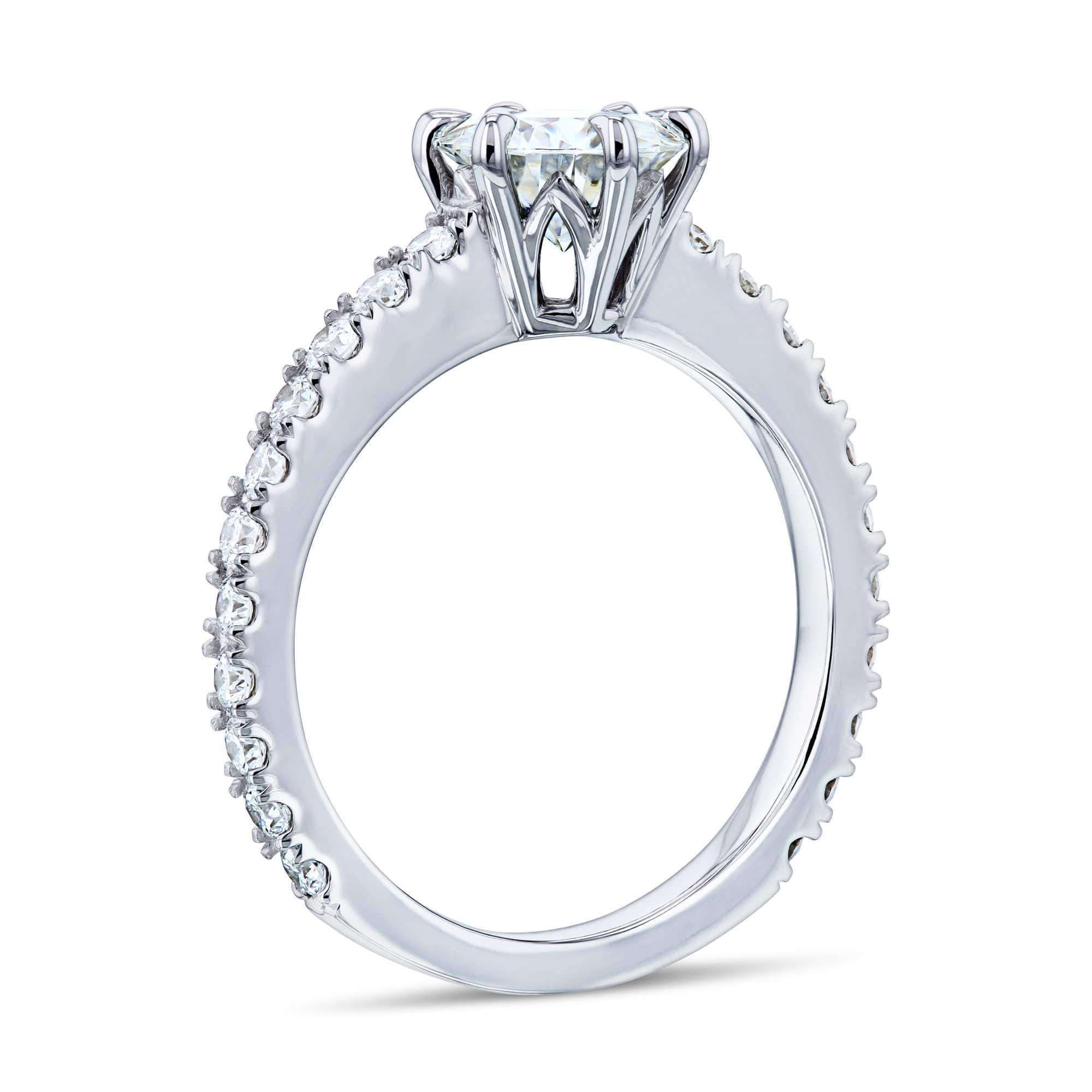 Our ring carries a one carat moissanite center stone (6.5mm round) at the center. All lab grown white diamonds comprise the side stones. And solid 14-karat white gold creates the base for this classic design (contact us if you would rather have this ring made in platinum!).