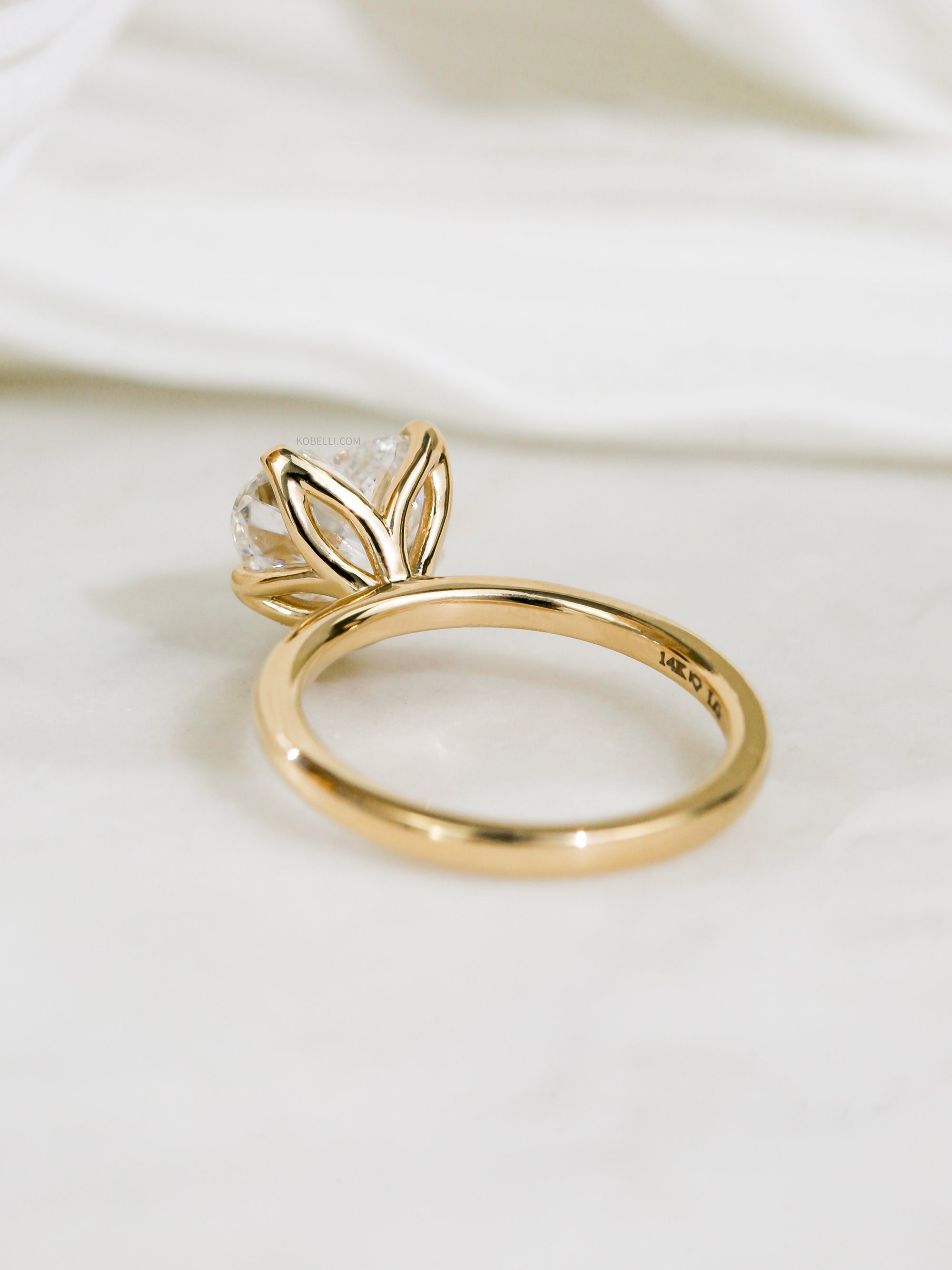 Kobelli's floating settings showcase center settings that stand entirely above the band, allowing for a flat Kobelli wedding band of similar widths to fit beside it. The rised setting is also a technique to invite the brightest sparkles with the un-interrupted space.