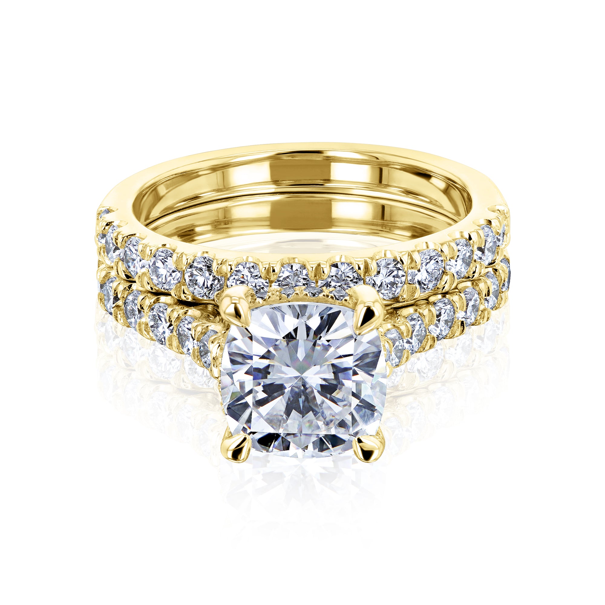 Designed to create a perfect fit, our Moissanite Cushion Hidden Halo Bridal Set carries a 14K gold engagement ring with a 14K solid gold matching band to bring the promise and union to completion. The head ring carries a 2-carat cushion-cut moissanite center stone mounted in a custom cathedral setting. 30 lab-grown diamond side stones march from the gallery rail down to the shoulder and extend halfway to the shank, mirroring the wedding band with 13 encrusted lab-grown diamonds. This bridal set has elegance and sophistication comparable to none.