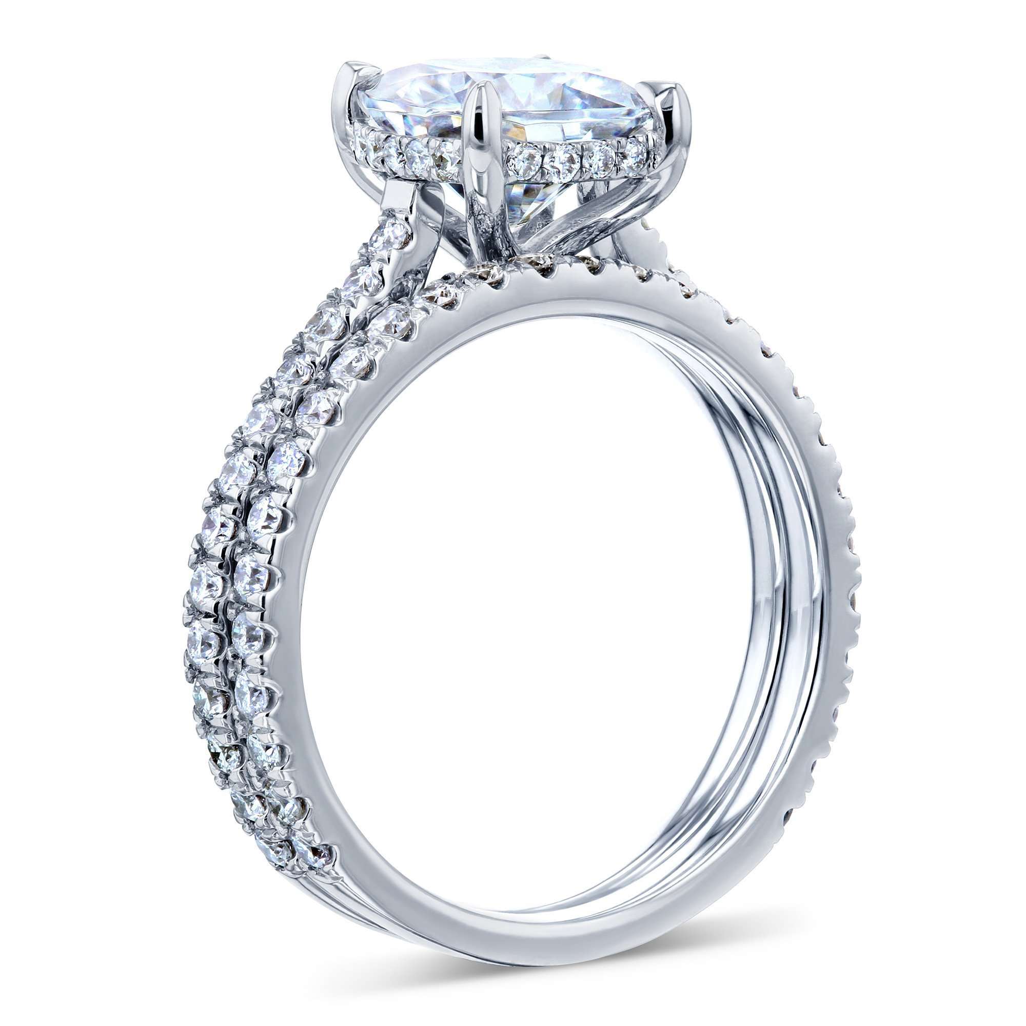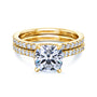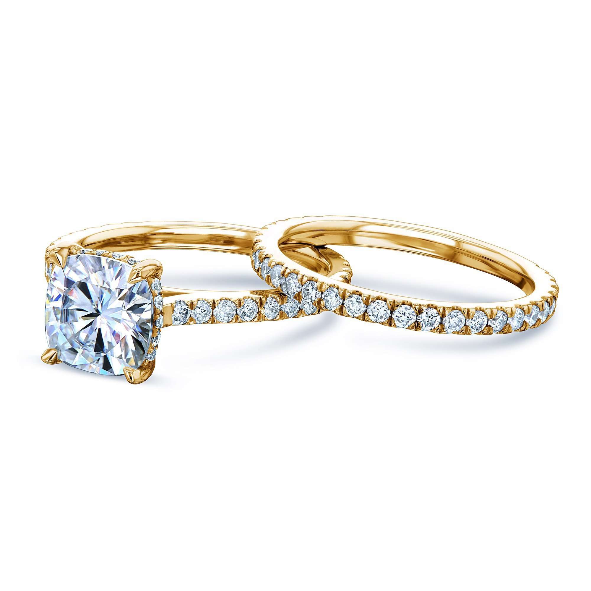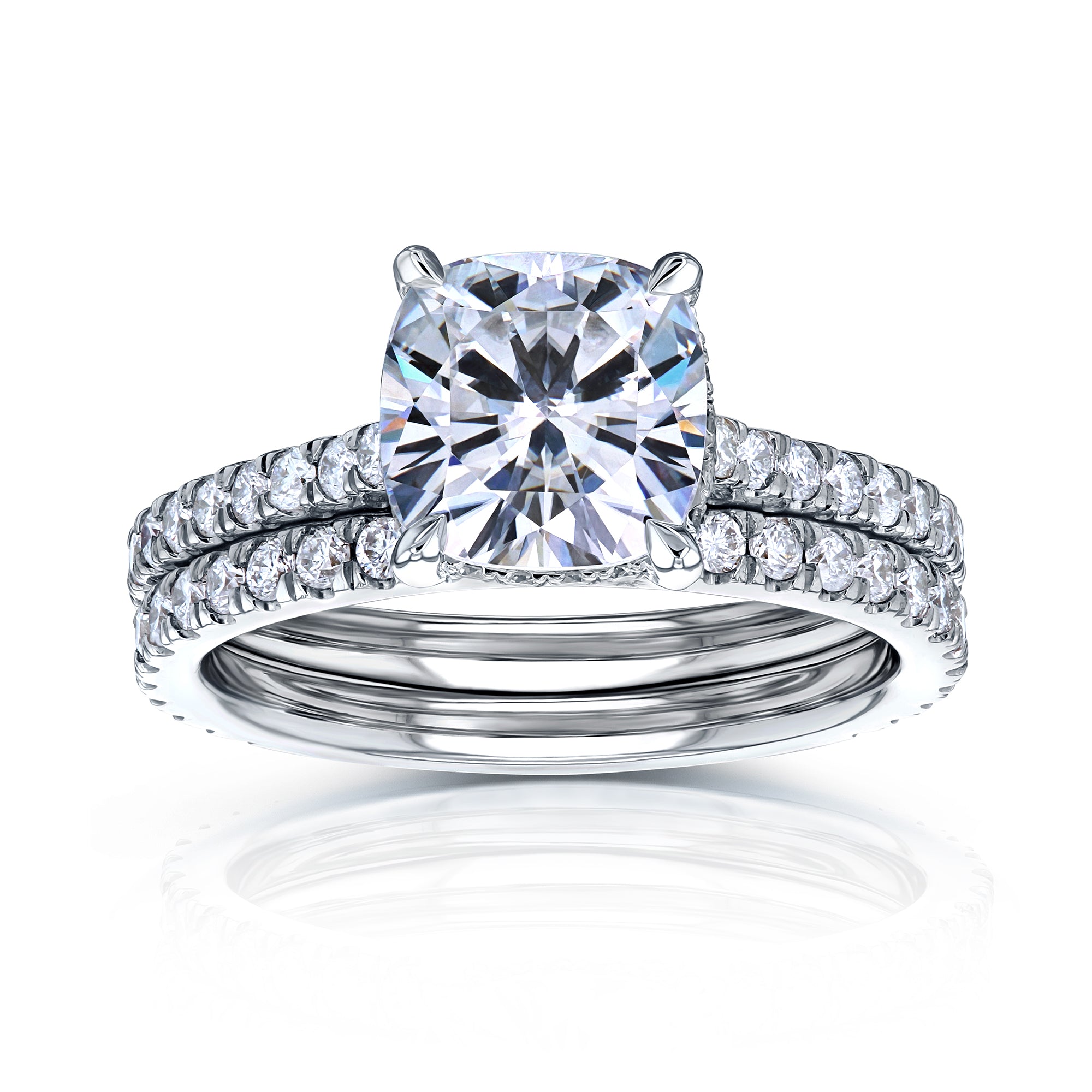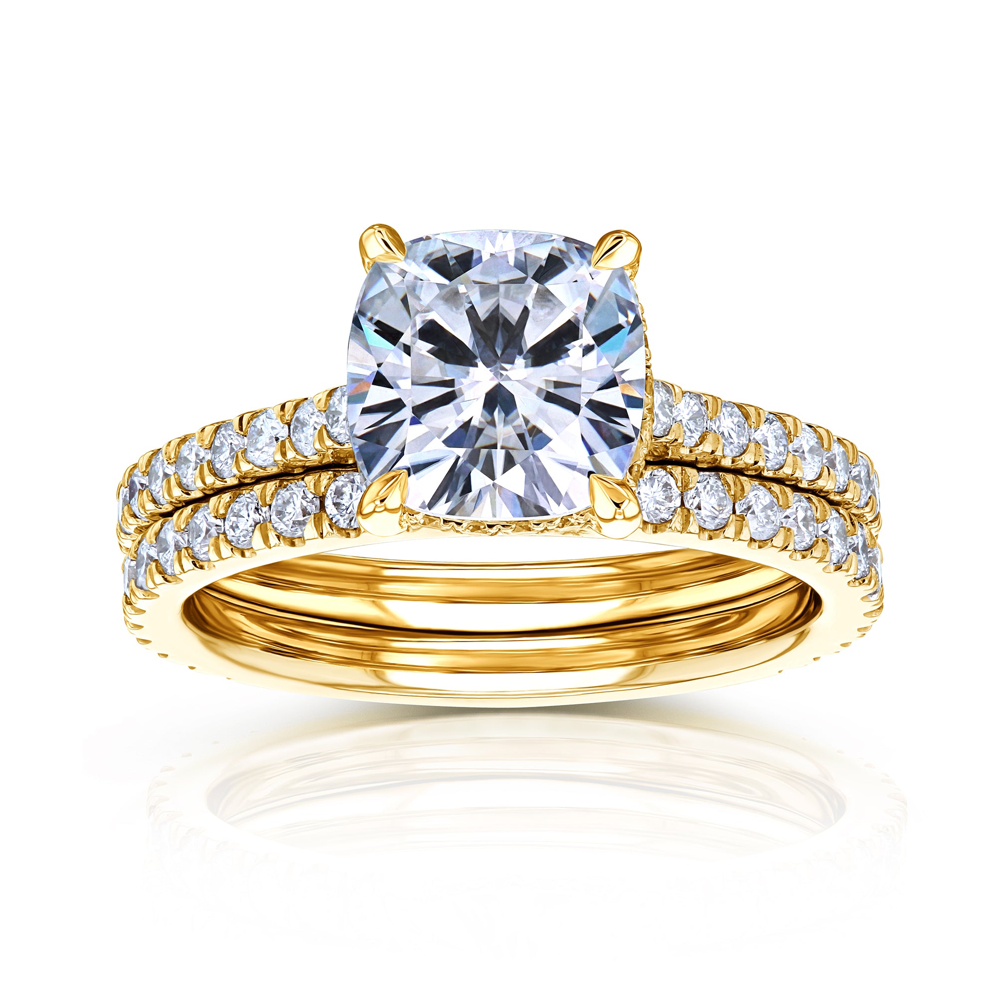 A large 2 carat (7.5mm) cushion-cut moissanite tops this pavé diamond bridal set in solid 14-karat gold.