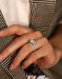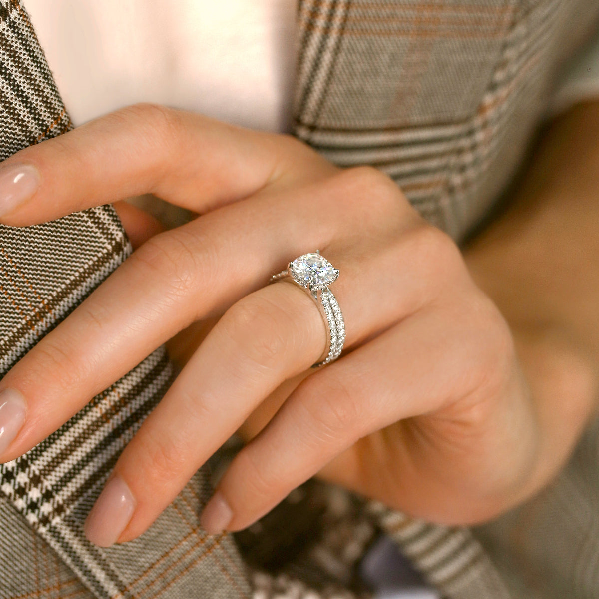Pairing the lab-created center stone with the earth-mined side stones makes for ideal use of both these stone types. Moissanite is best displayed in larger sizes to showcase its highly esteemed trait of brilliance and fire with an inclusion free core. The 2 carat does exactly that without being at all gaudy. The smaller white diamonds line together in pavé settings for a glittering visual enhancing the ring in both sparkling beauty and luxurious rarity.