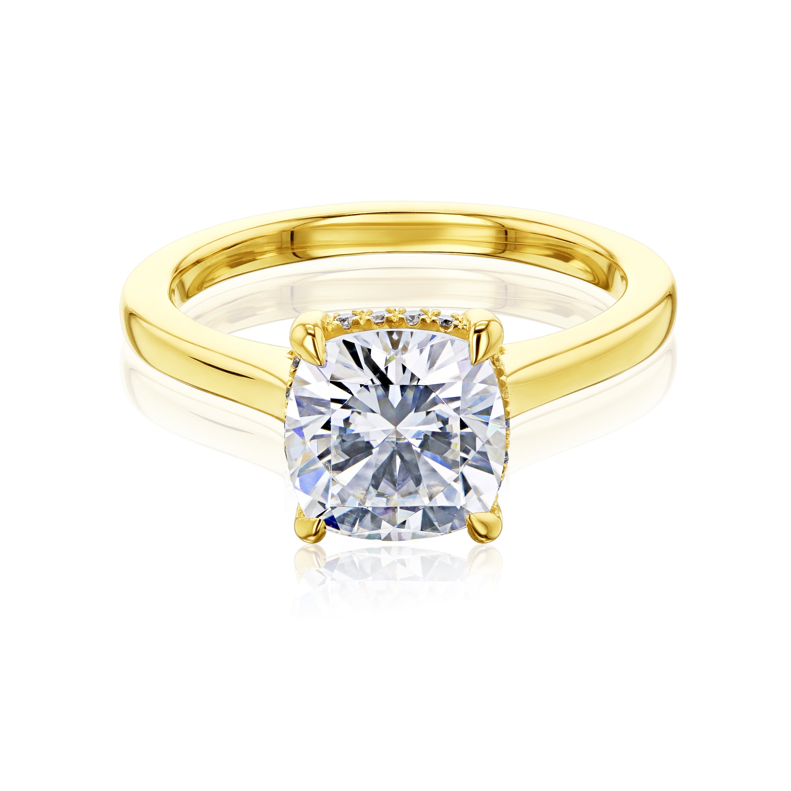 Adding to the design’s classic cathedral look is its bridge optionally illuminated with six diamonds on each side of the engagement ring. Select from a pavé diamond shank or keep it minimally chic with a solid gold style.