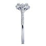 A cathedral trellis setting carries this dazzling cushion-cut moissanite gemstone alongside natural earth mined diamonds on this mixed stone engagement ring. The stones are all carefully placed into 14-karat gold, which is the most popular metal type for bridal jewelry. The diamonds form to a halo around the center stone and outlines the top of the band in a half circle of shimmering glamour. With crisp facets and ritzy unclouded sparkles, moissanite makes the ideal center stone for anyone who is looking for pristine visual impact.