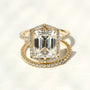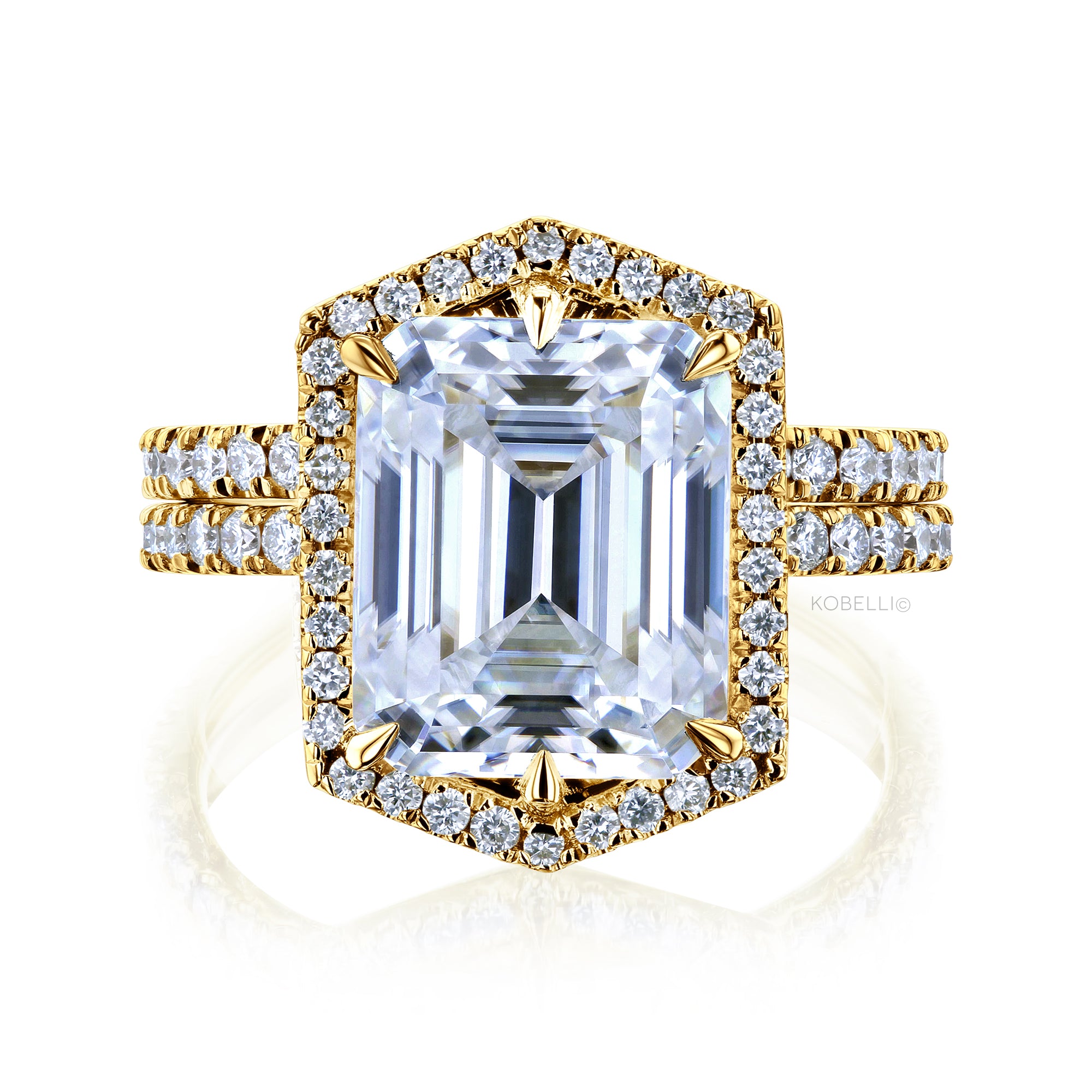 Statement Sized Hexagon Halo 4.9ct Emerald Moissanite & 0.94ct Diamond Vintage Style Bridal Rings Set - 5.84ct.tw in 14k Gold