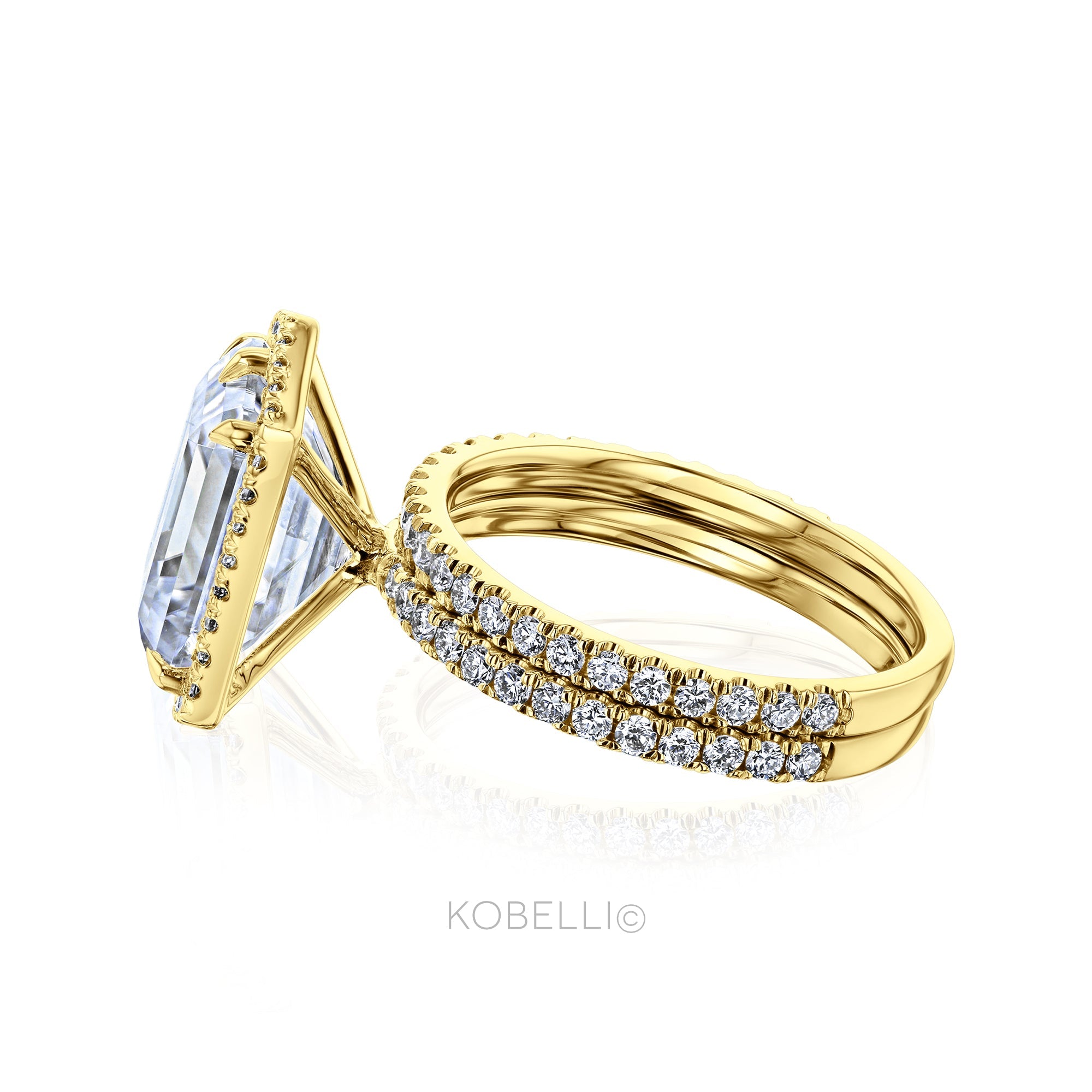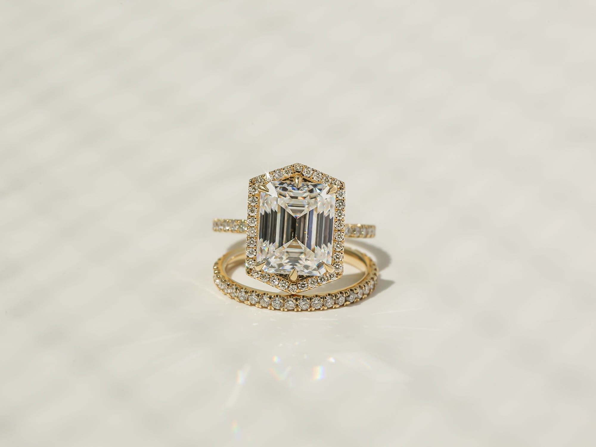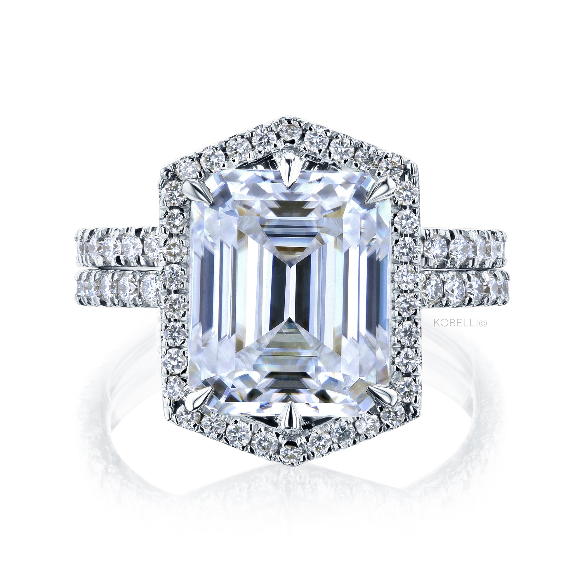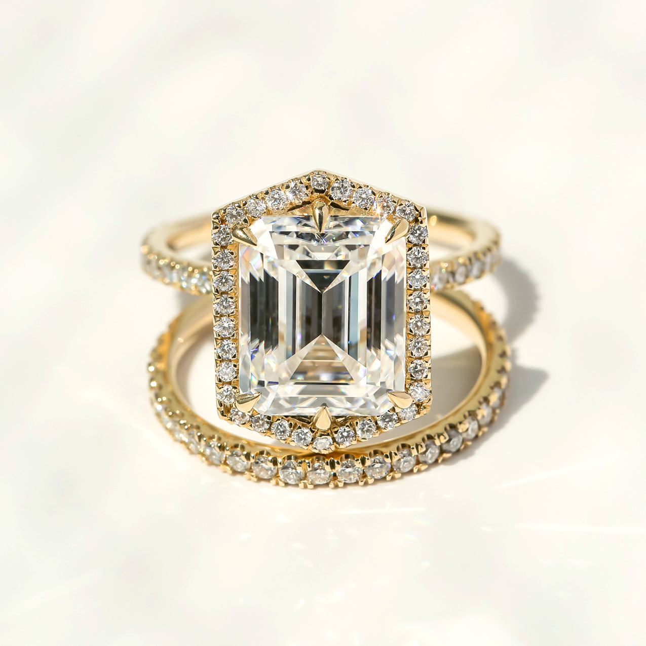A colossal 4.90 carat emerald step-cut moissanite is centered in an extra high floating setting. Lab-grown white diamonds line the halo as well as both bands in micro-prong pavé settings.