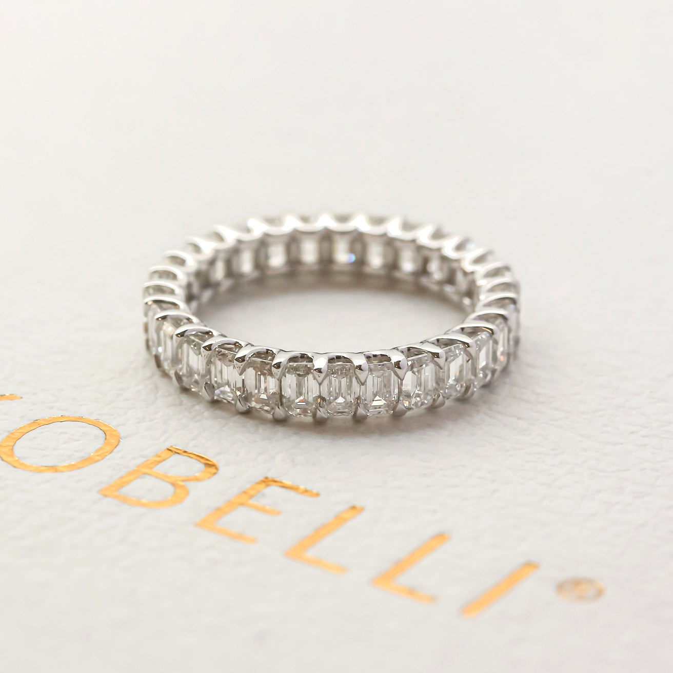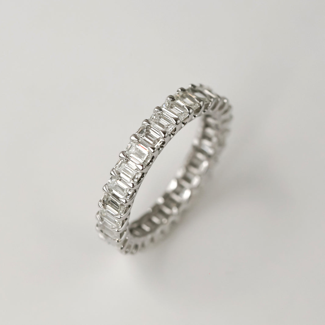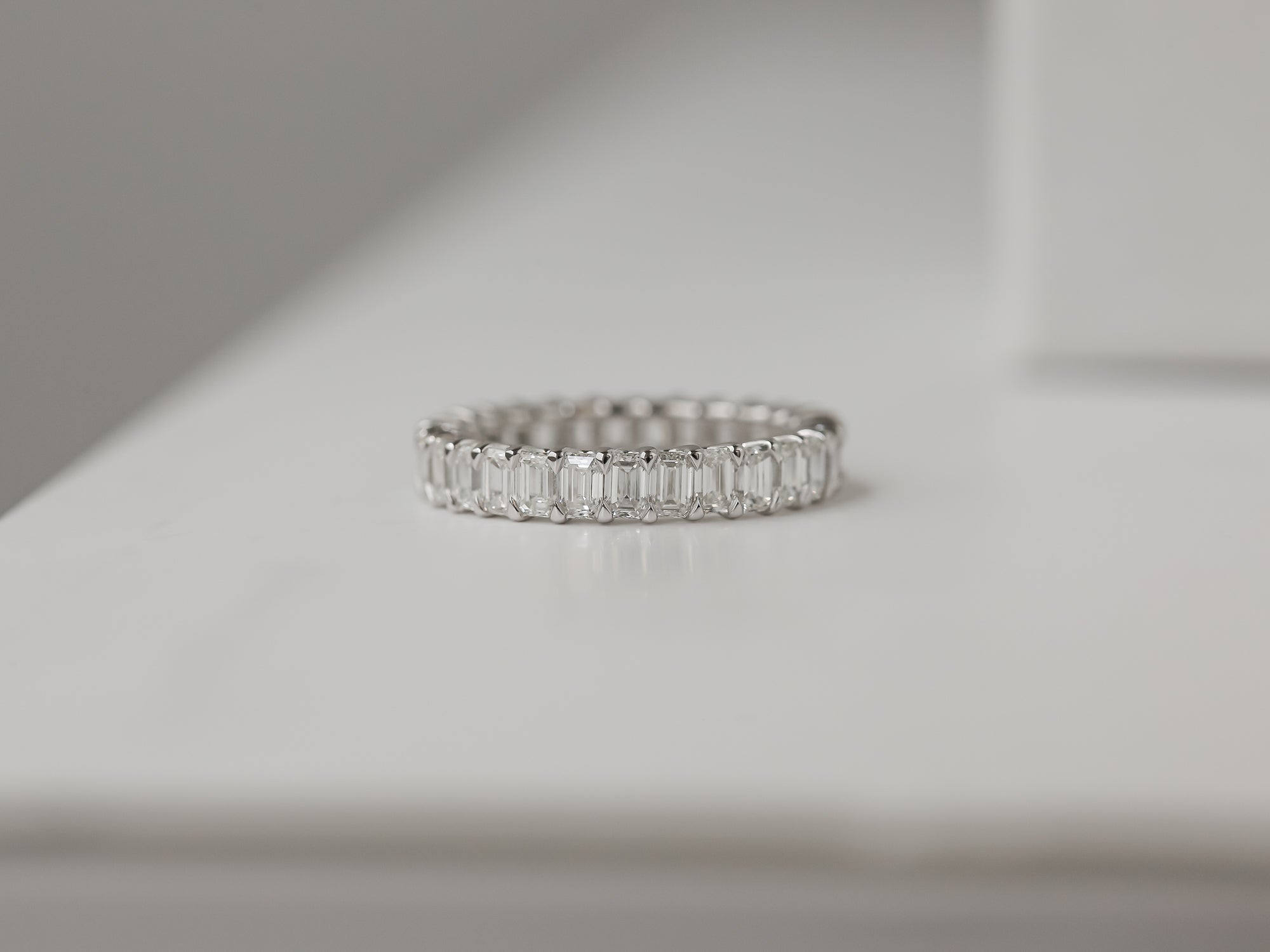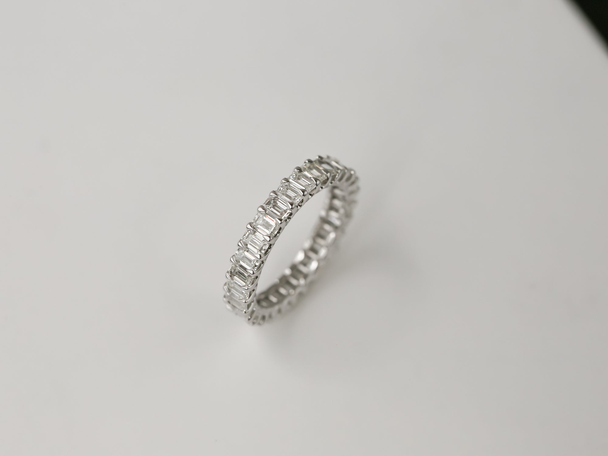 The piece in the photos is a size 5 in 14-karat white gold and carries 29 lab-grown diamonds totaling to 2.42 carats of DEF color and VS clarity.