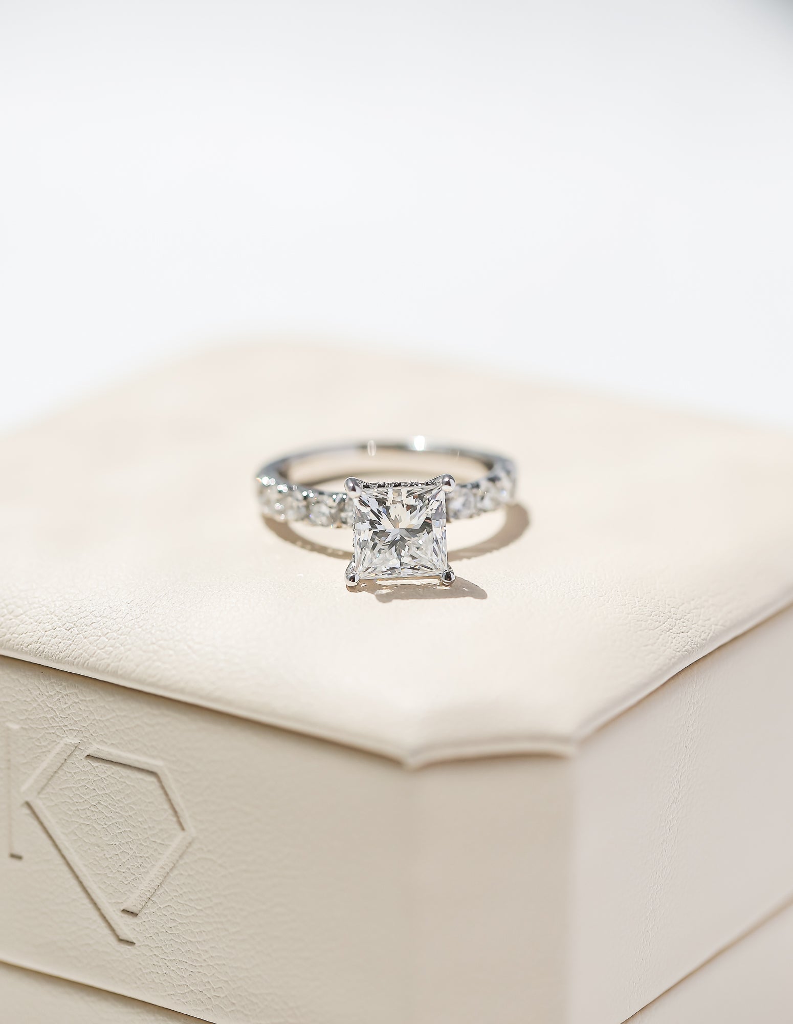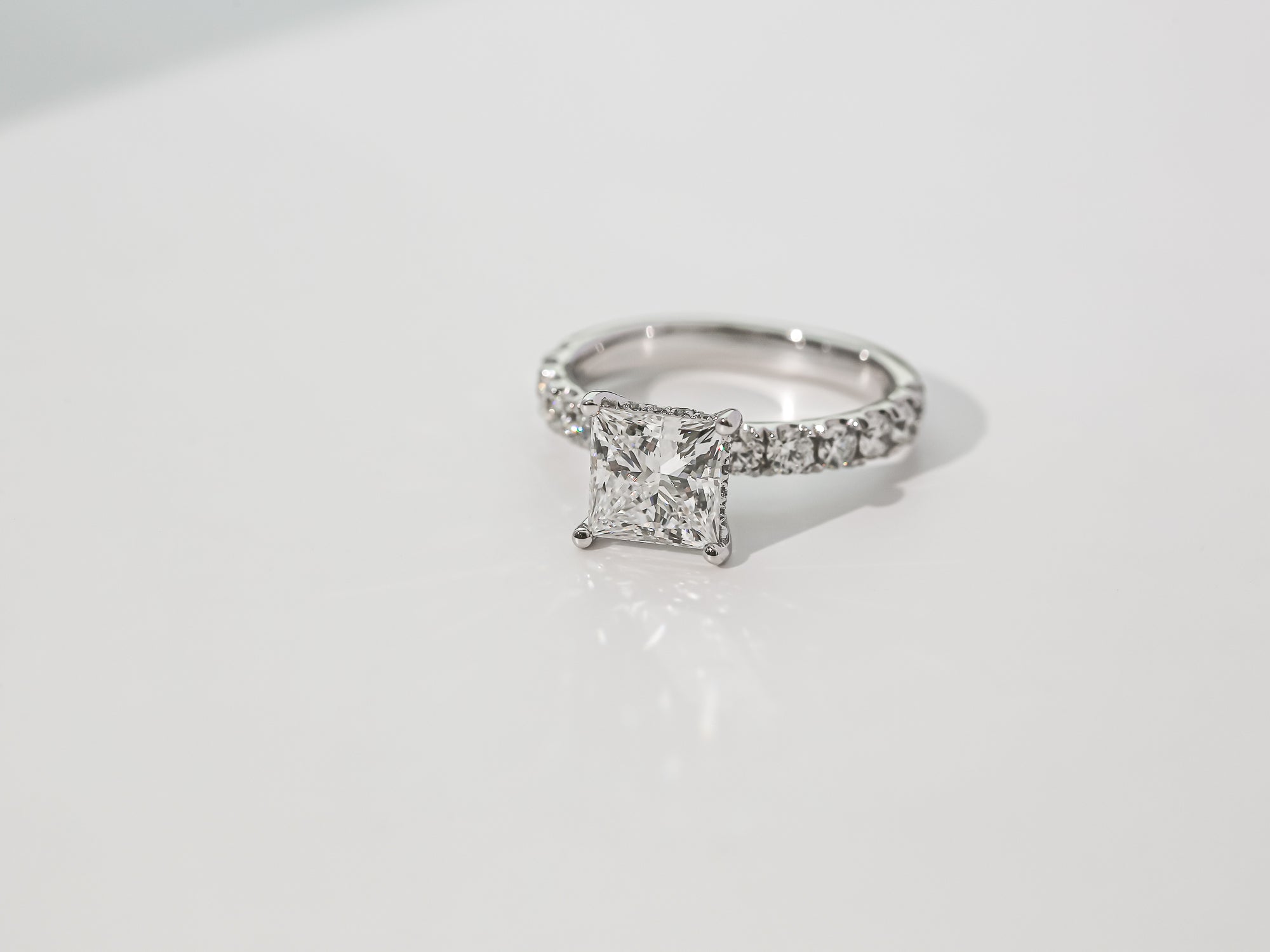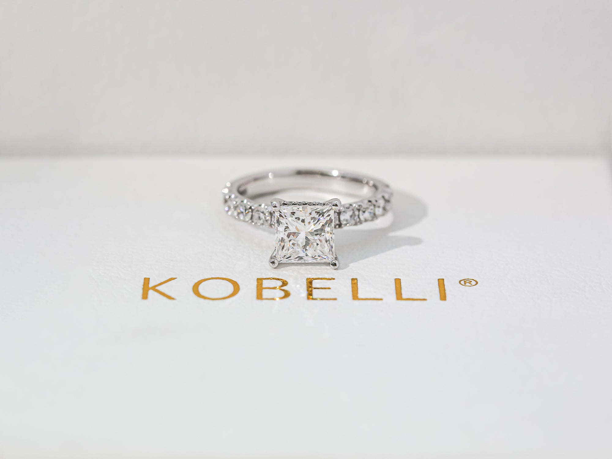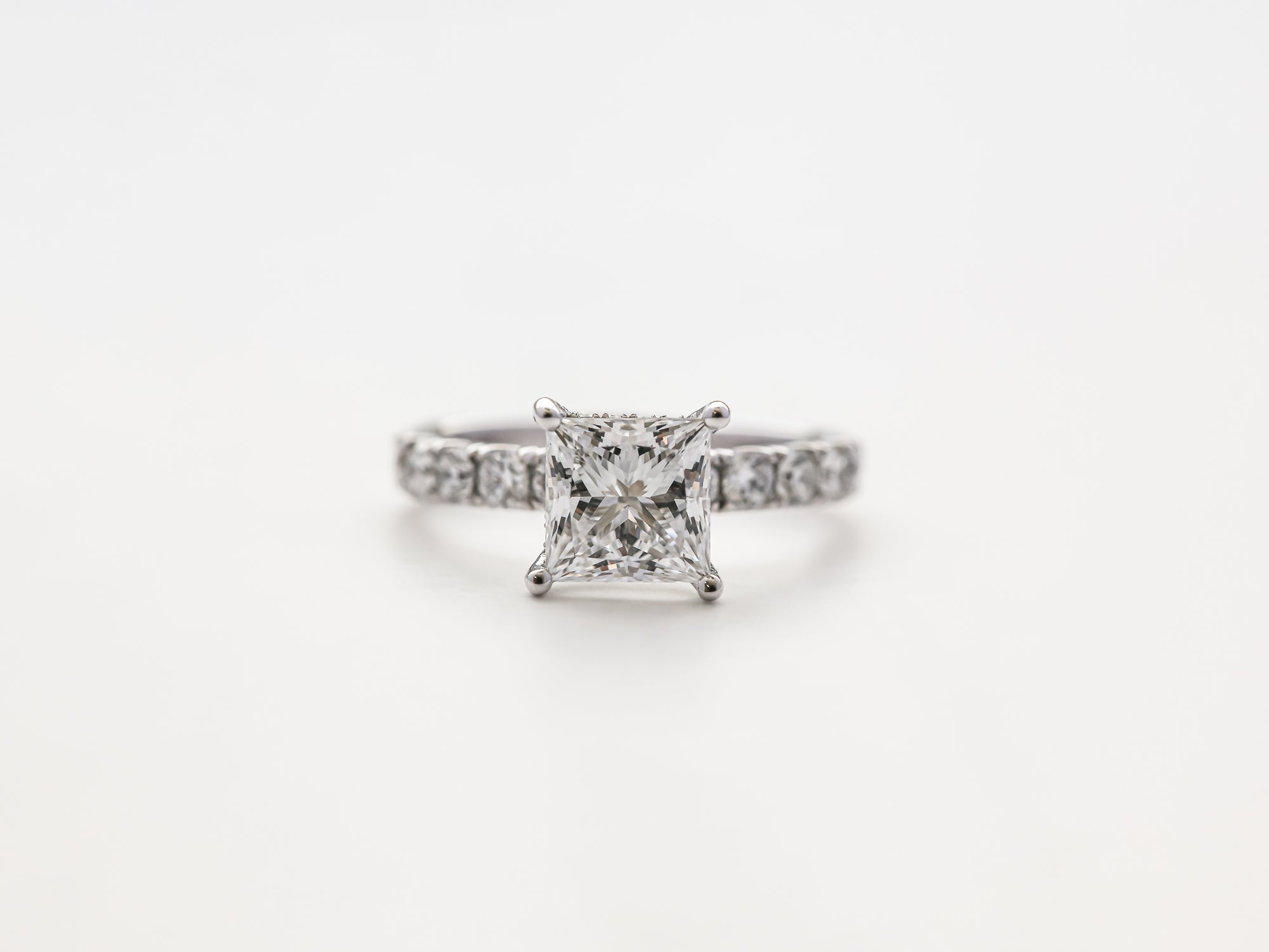 A 2.20 carat princess lab diamond tops this classic engagement ring over a row of 28 additional lab diamonds in Kobelli's unique Flame French Pavé prongs.