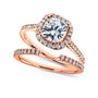 Kobelli's top selling halo engagement ring carries a 1.10 carat center gemstone surrounded by entirely natural white diamond side stones. The piece is set into solid 14-karat gold. A cathedral setting raises the top to an ideal engagement ring position to capture the full brilliance of the stones.