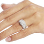 Strong and elegant, this wide 14-karat white gold bridal set will add breathtaking appeal to your style. The engagement ring features a center clusters of 4 princess-cut diamonds, set together in a square with a pave-set halo. Accompanying this center feature to each side is a smaller series of pave halo princess-cut diamonds. The wide band features three rows of round-cut diamonds that add texture and flair to the ring. Round-cut white diamonds are pave-set into the matching wedding band, fitting to the engagement ring in a glittering display.