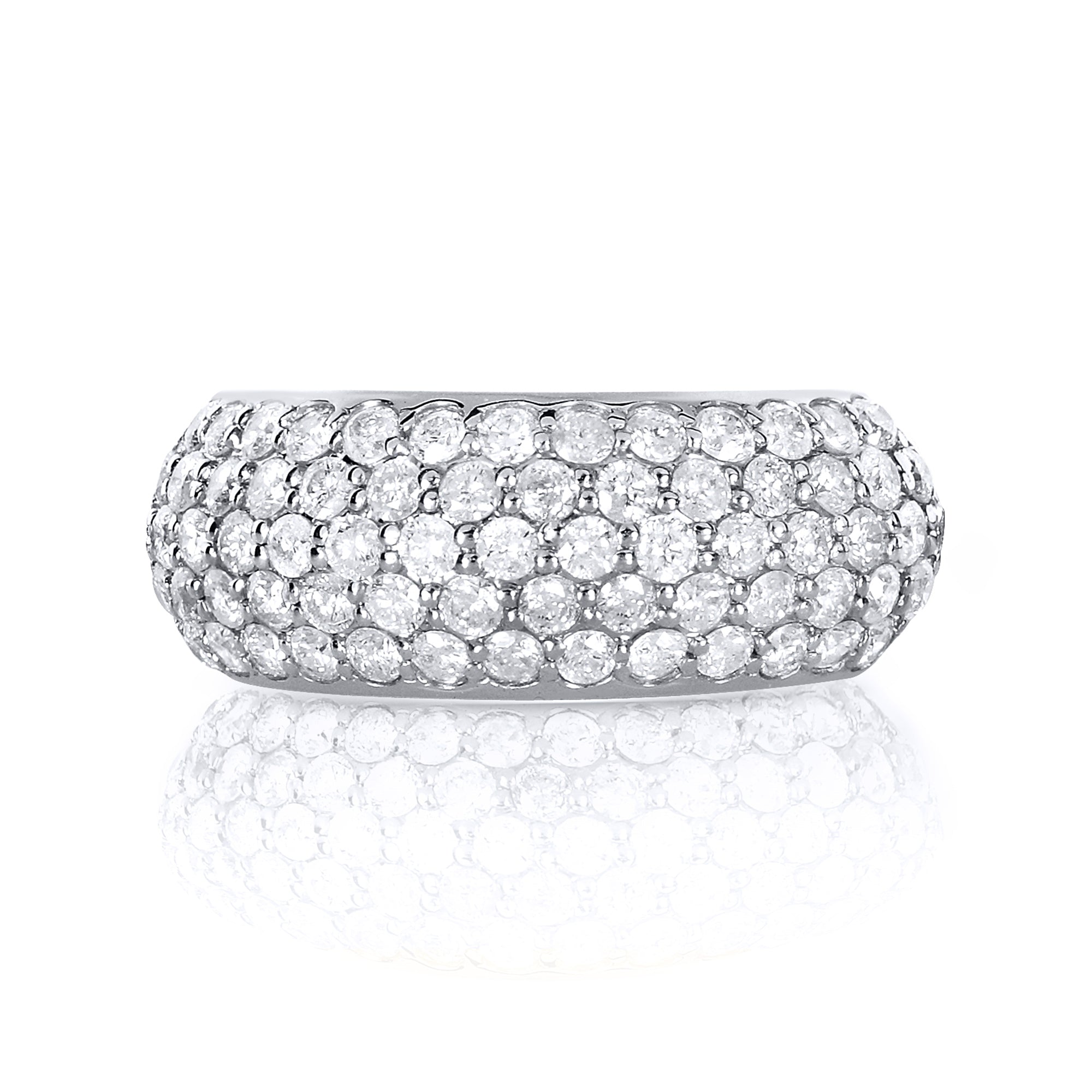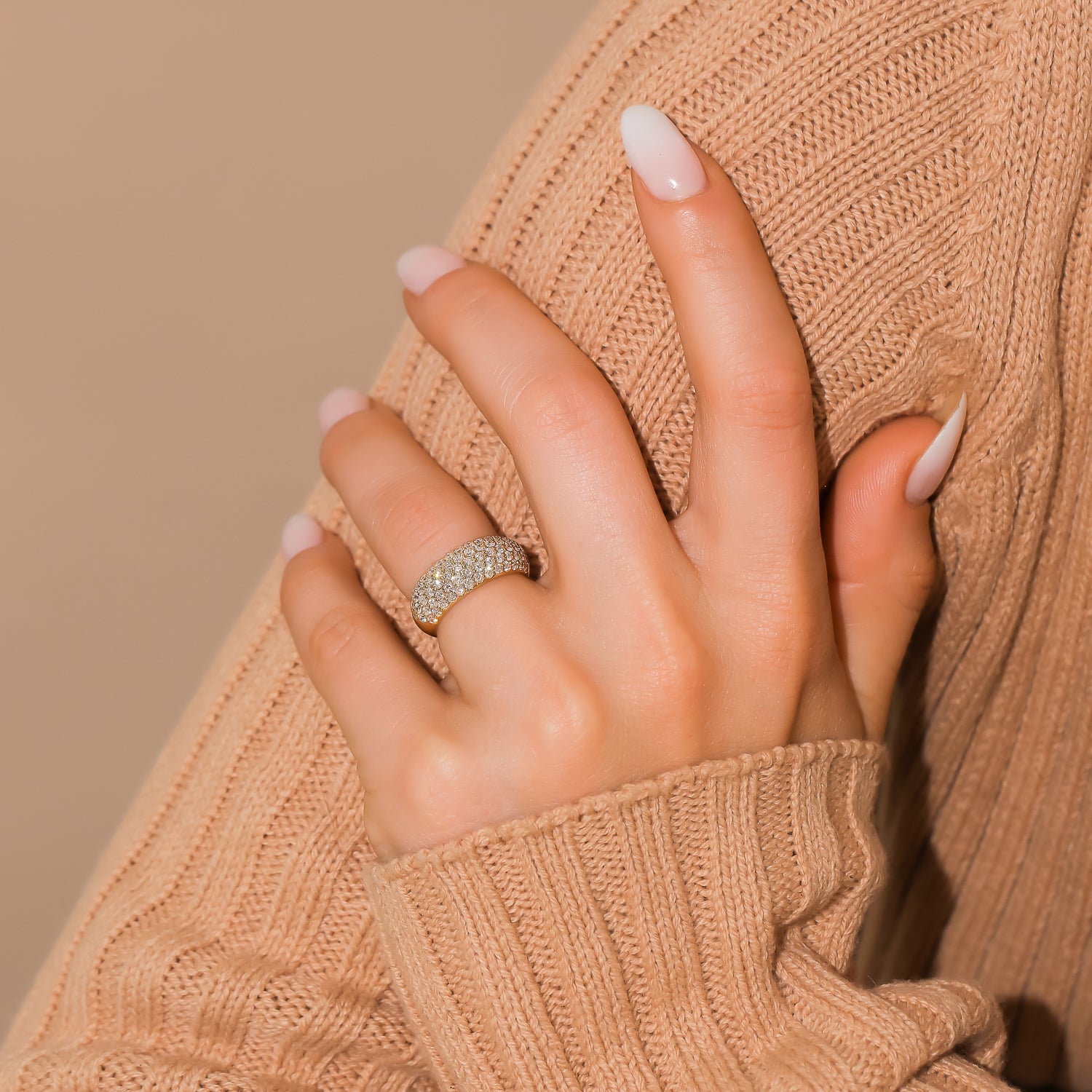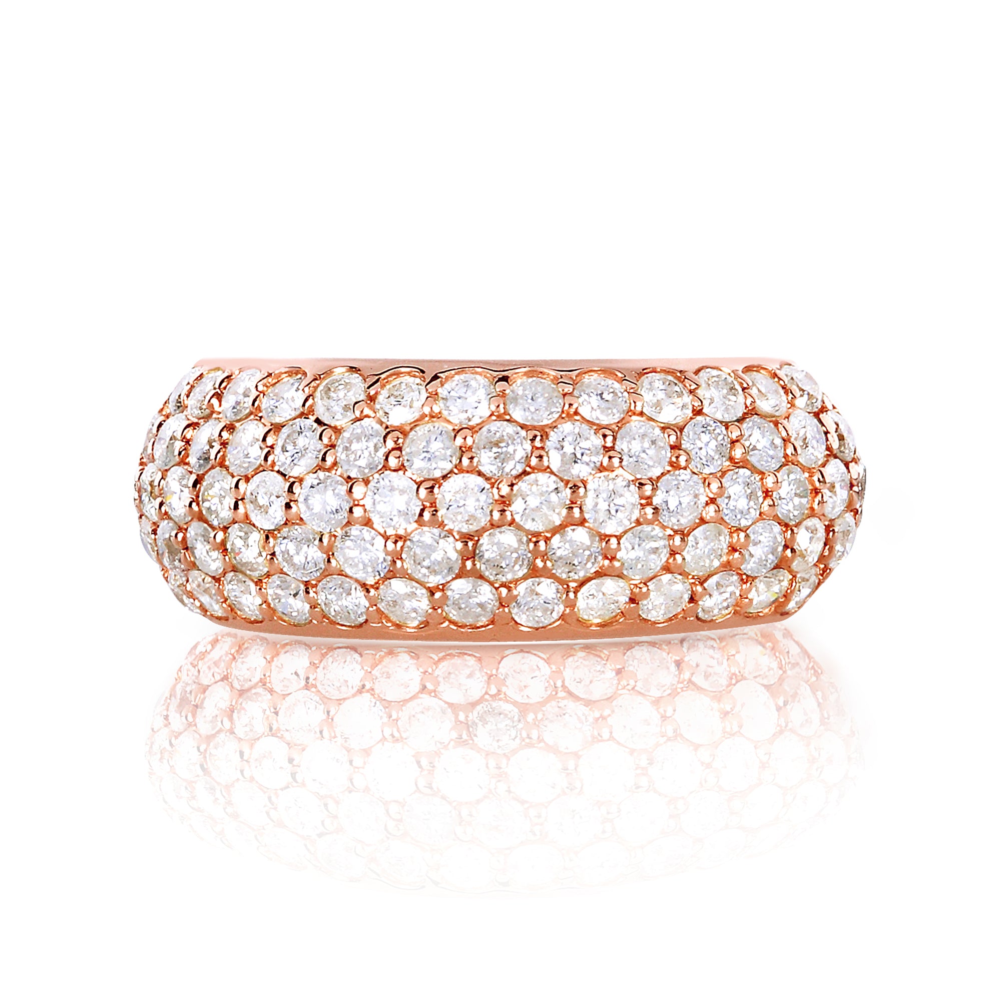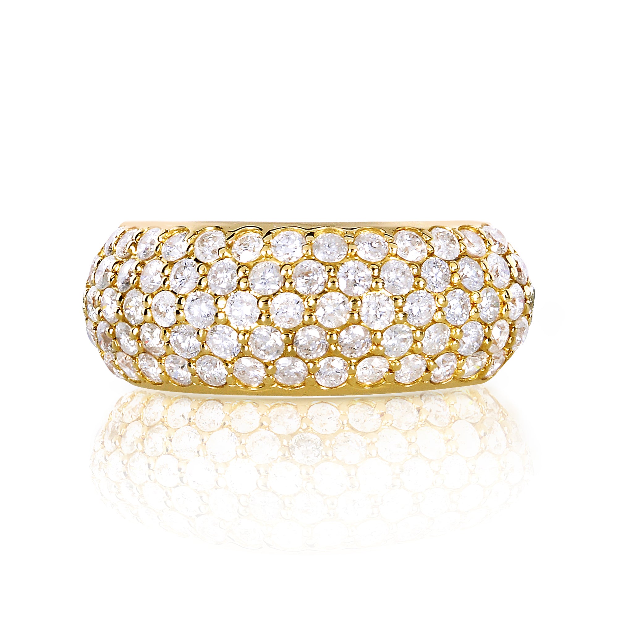 The beloved French pavé setting exudes glamour on high fashion jewelry like no other. Our Domed Pavé Diamond Puff Band in 14K Gold showcases exactly that, designed in the most popular cut for diamond rings – the round cut. This ring features 69 dazzling precious round diamonds and takes pride in showcasing extraordinary levels of beauty and brilliance.