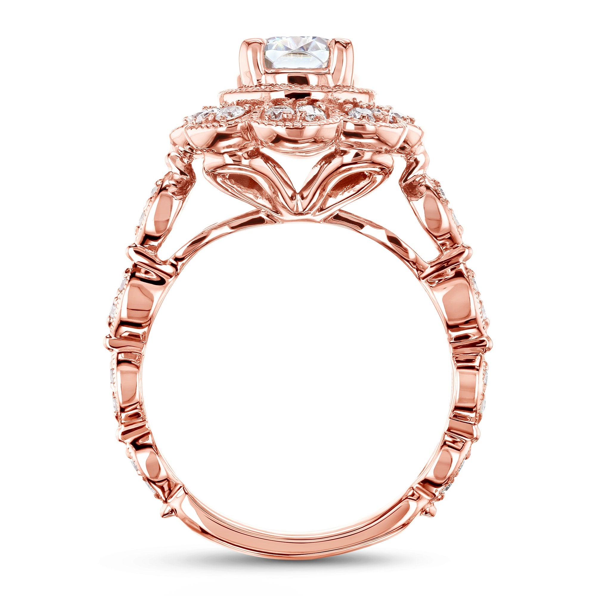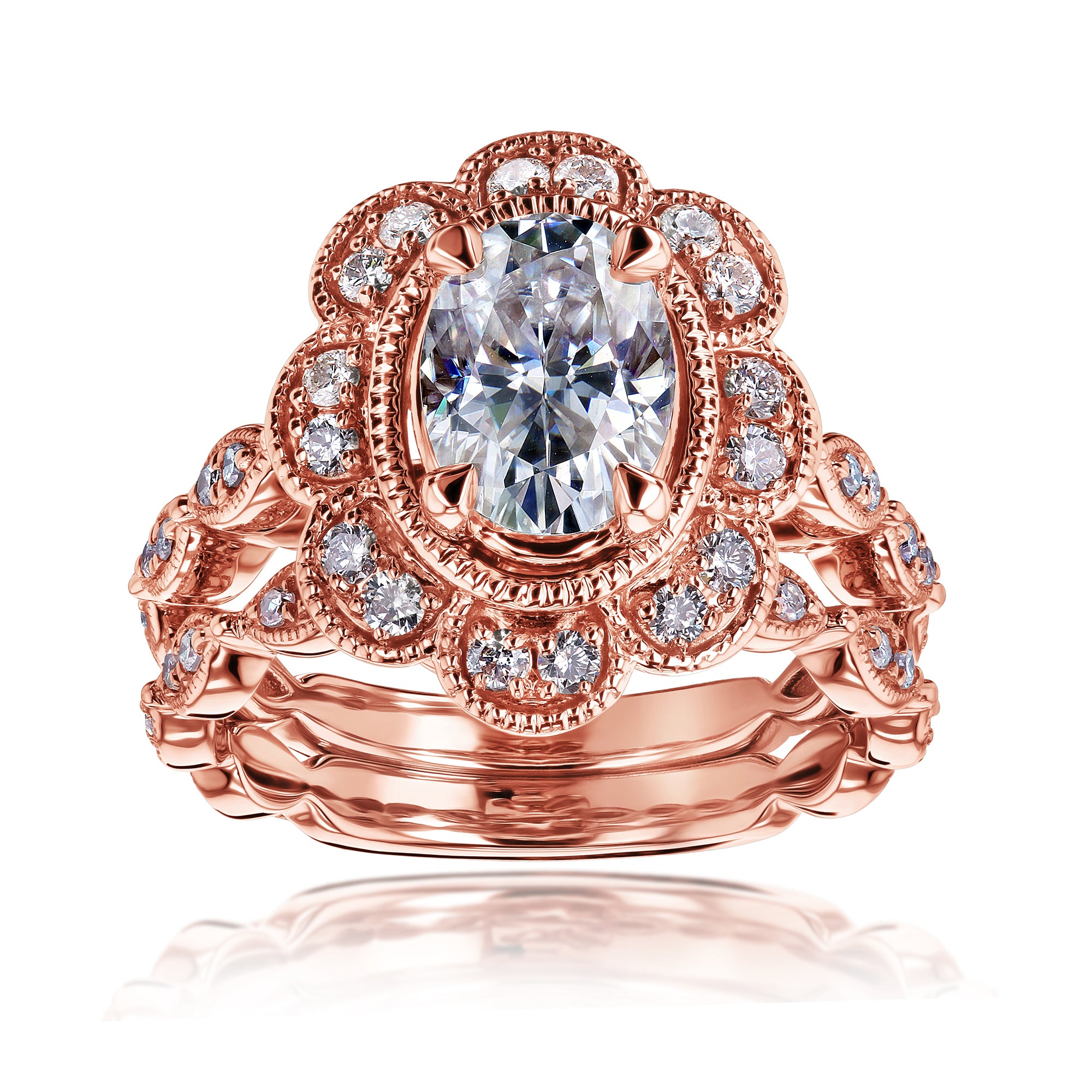 An 8x6 mm oval moissanite rises over this floral vintage mounting in solid rose gold metal. Milgrain etching traces the formation of the design for an ornate finish reminiscent to old-time royalty. The two-piece set comes complete with your lovely engagement ring and perfectly matching wedding band.