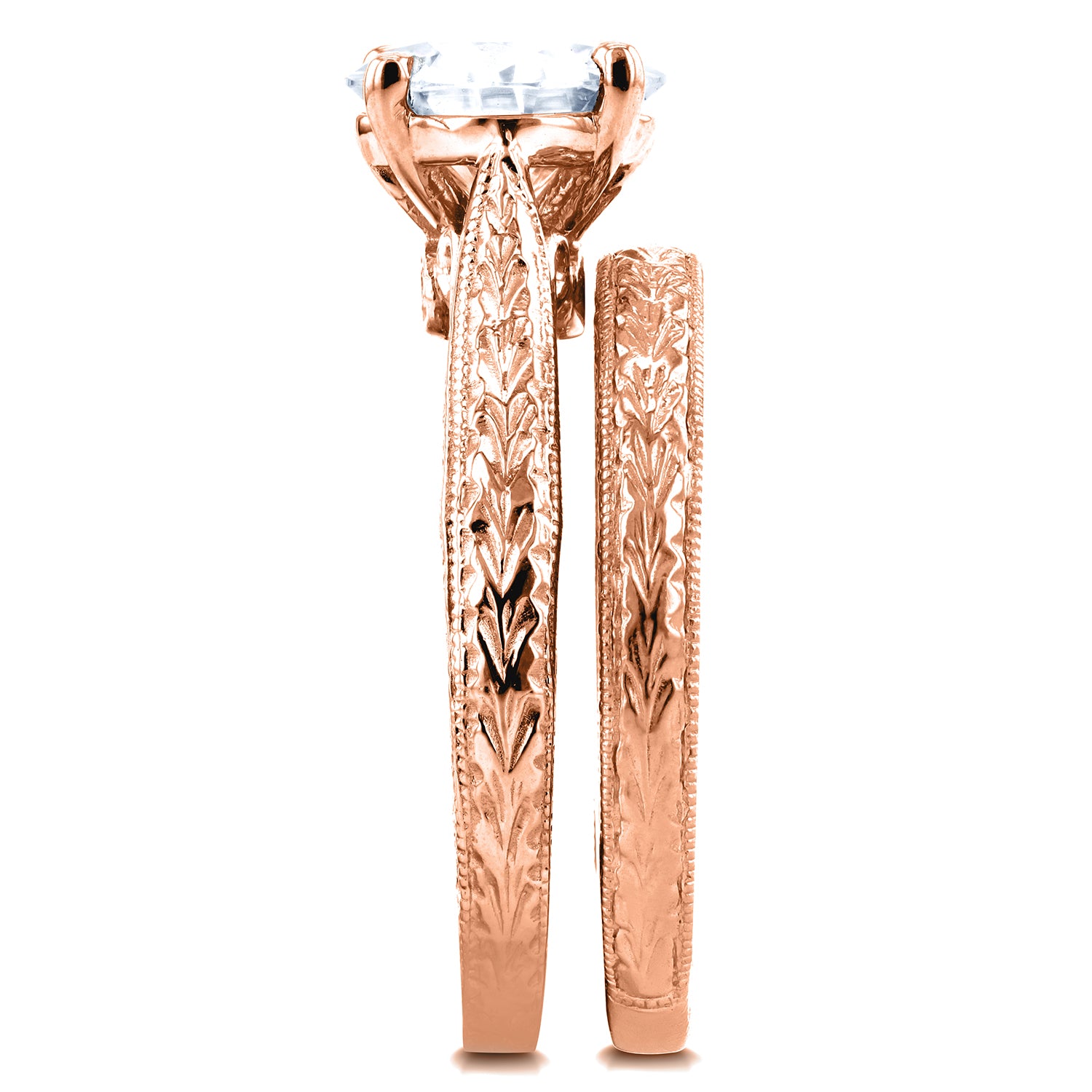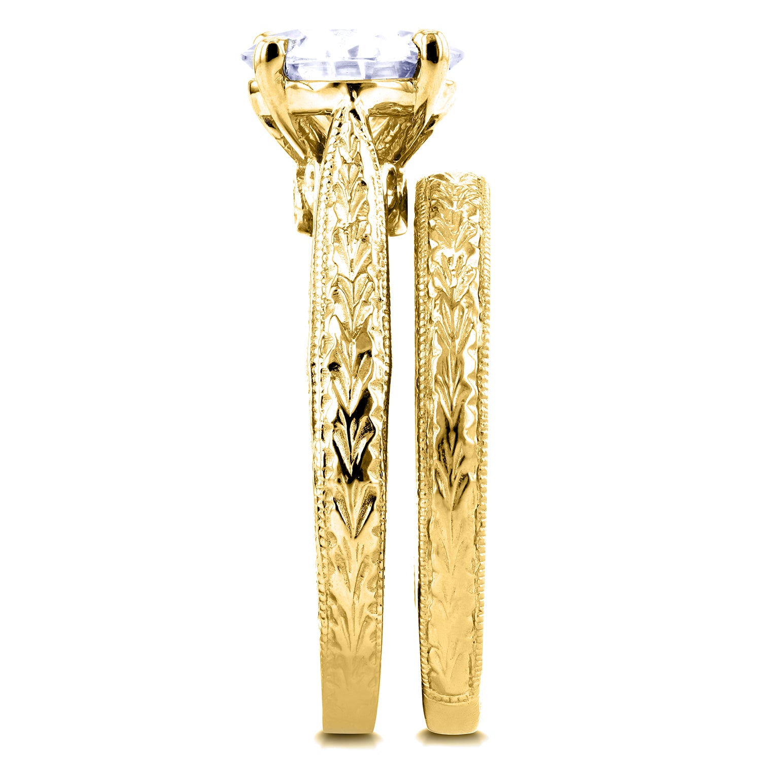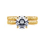 Gold etched engravings with a moissanite topper and diamond accents define this regally antique bridal set. Your world will change with this looming 7.5 mm center stone that will undoubtedly catch attention at any social scene. The massively twinkling rock is held above the band at a flattering height to fully capture light on a cathedral curve. As far as colorless gemstones go, you cannot choose a better center stone than moissanite thanks to its exceedingly high refractive qualities surpassing even diamonds in glittering brilliance. Handpicked by Kobelli jewelers, you will see a flawlessly cut gemstone with VS clarity. Choose from Kobelli Moissanite for natural undertones of GH color or Charles and Colvard's Forever One Moissanite for the brightest white.
