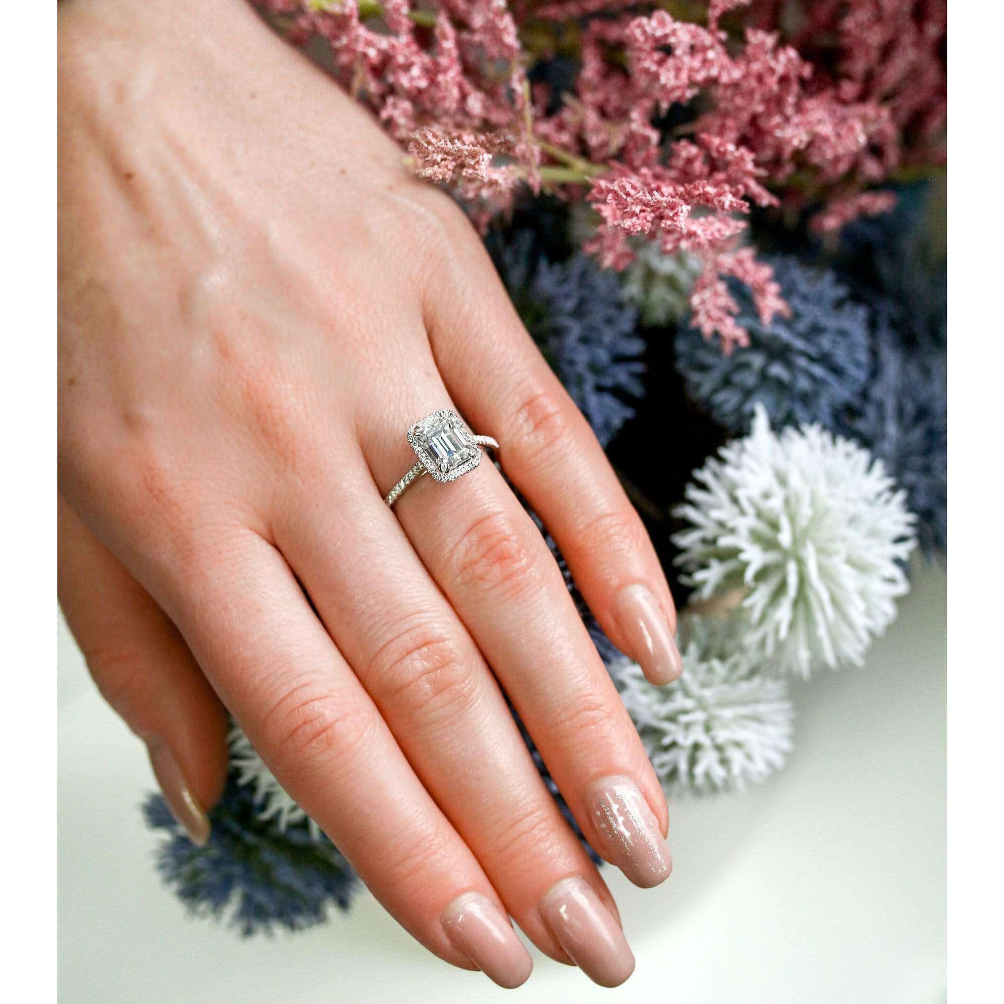 A slender 1.5mm diamond-lined band contrasts your halo center setting with an emerald-cut moissanite at the very center.