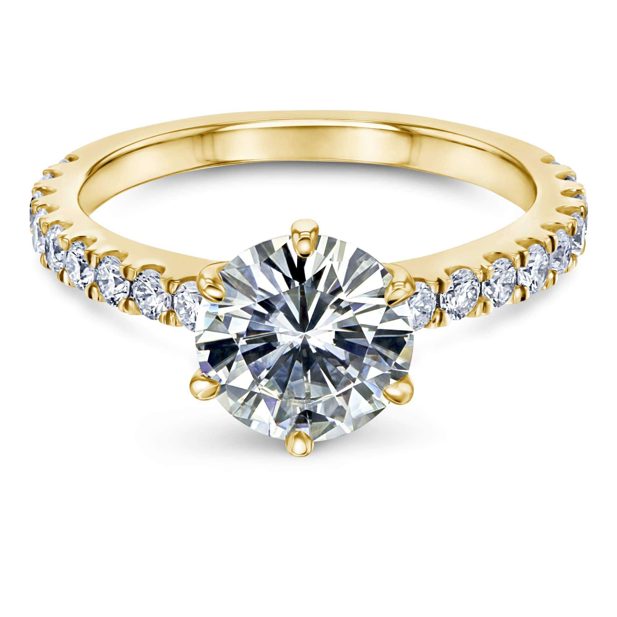 Crowned with a 1.9ct moissanite gemstone, this simple yet majestic design shoulders 18 diamonds across the band. The ring is made with solid 14-karat gold with a high polished finish. Every stone on this ring from the moissanite center stone to the diamond side stones are lab grown to perfection.