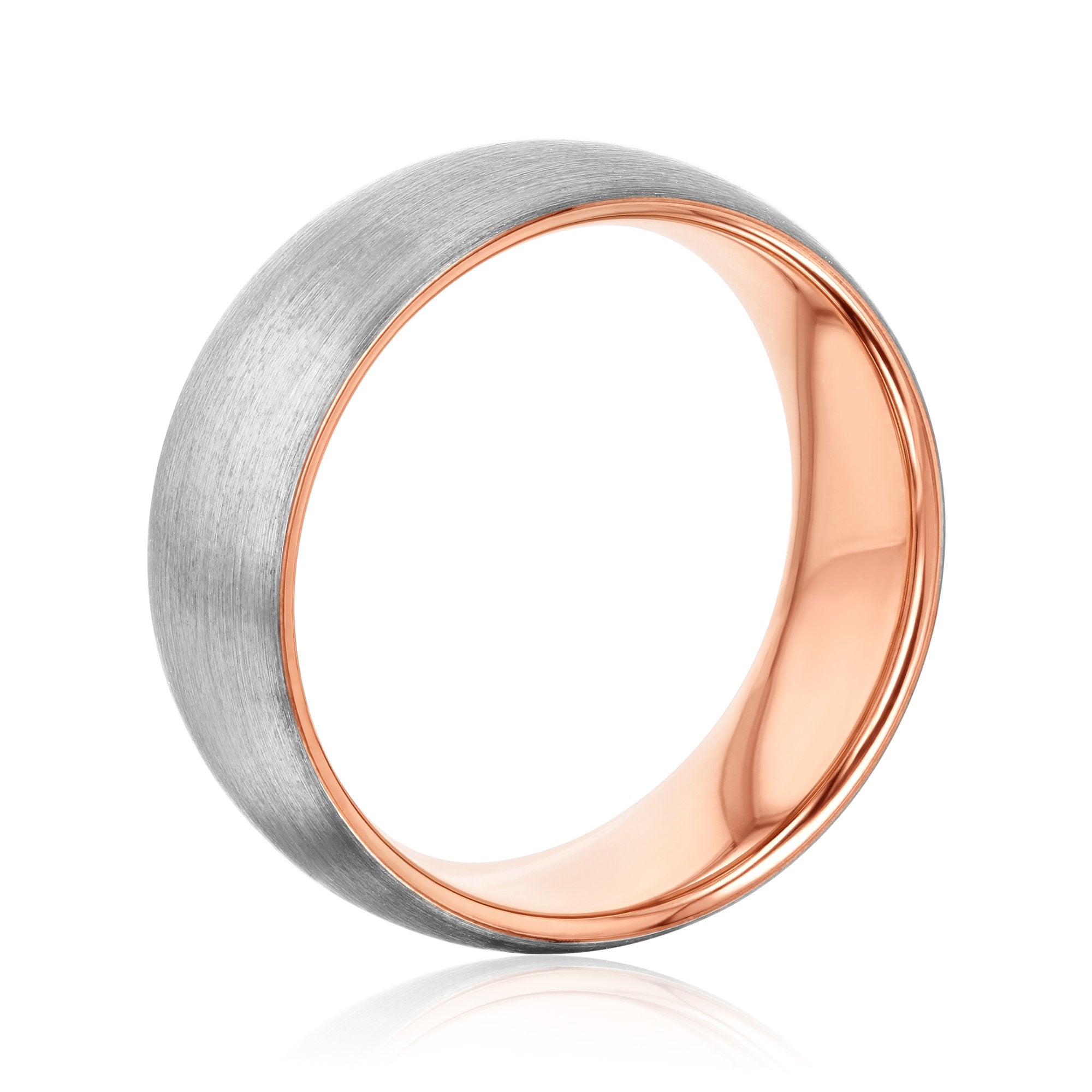This 8mm domed band features a gunmetal brushed finish exterior and a rose gold interior in high polish. This scratch resistant ring is highly durable and made to last a lifetime.