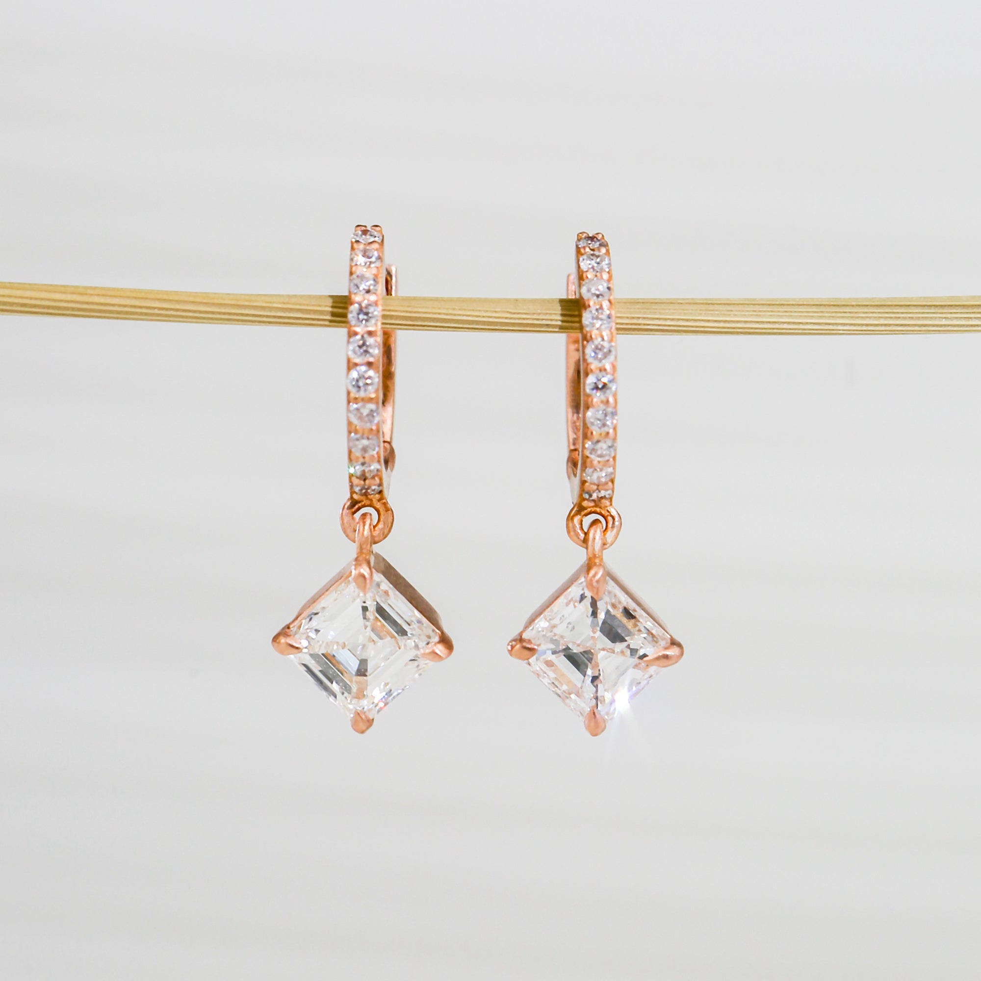 Compass prongs set two rare Asscher-cut white diamonds on this dangling pair of earrings. The one-of-a-kind set is as pictured.