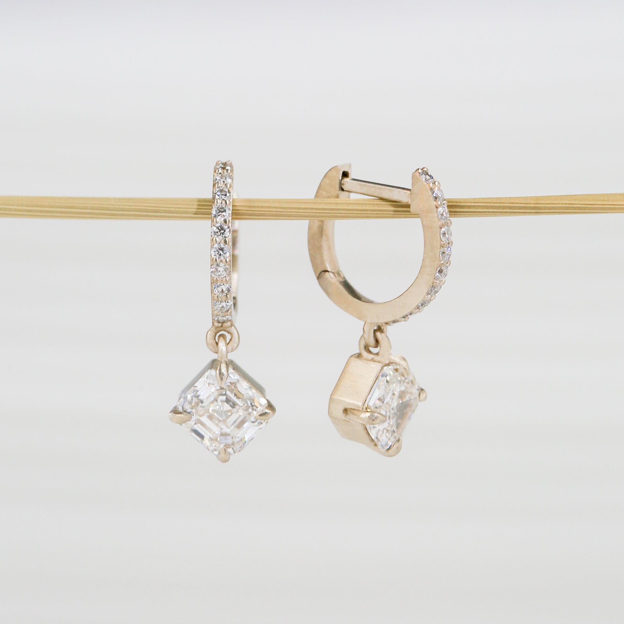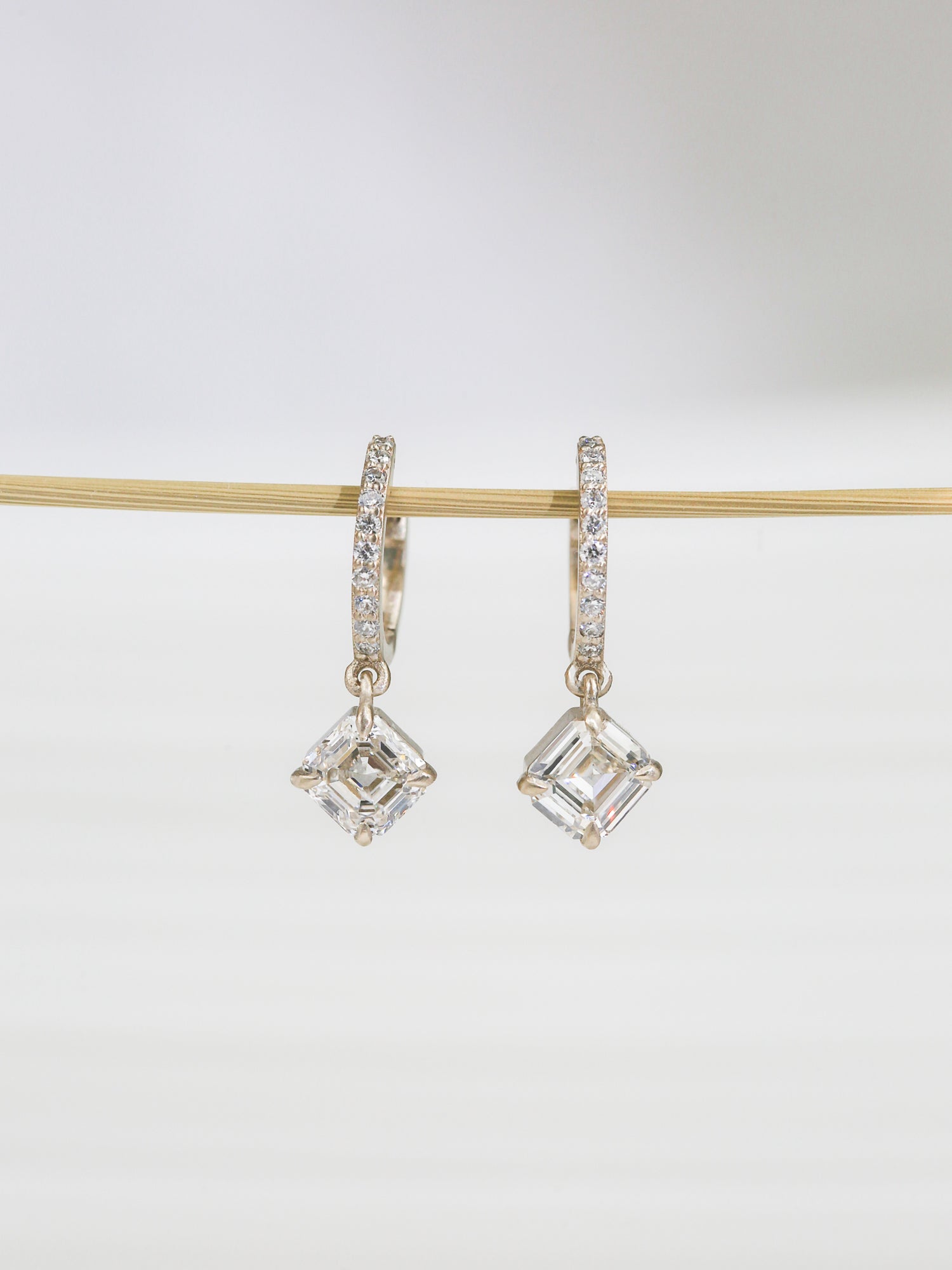 Compass prongs set two rare Asscher-cut white diamonds on this dangling pair of earrings. The one-of-a-kind set is as pictured.