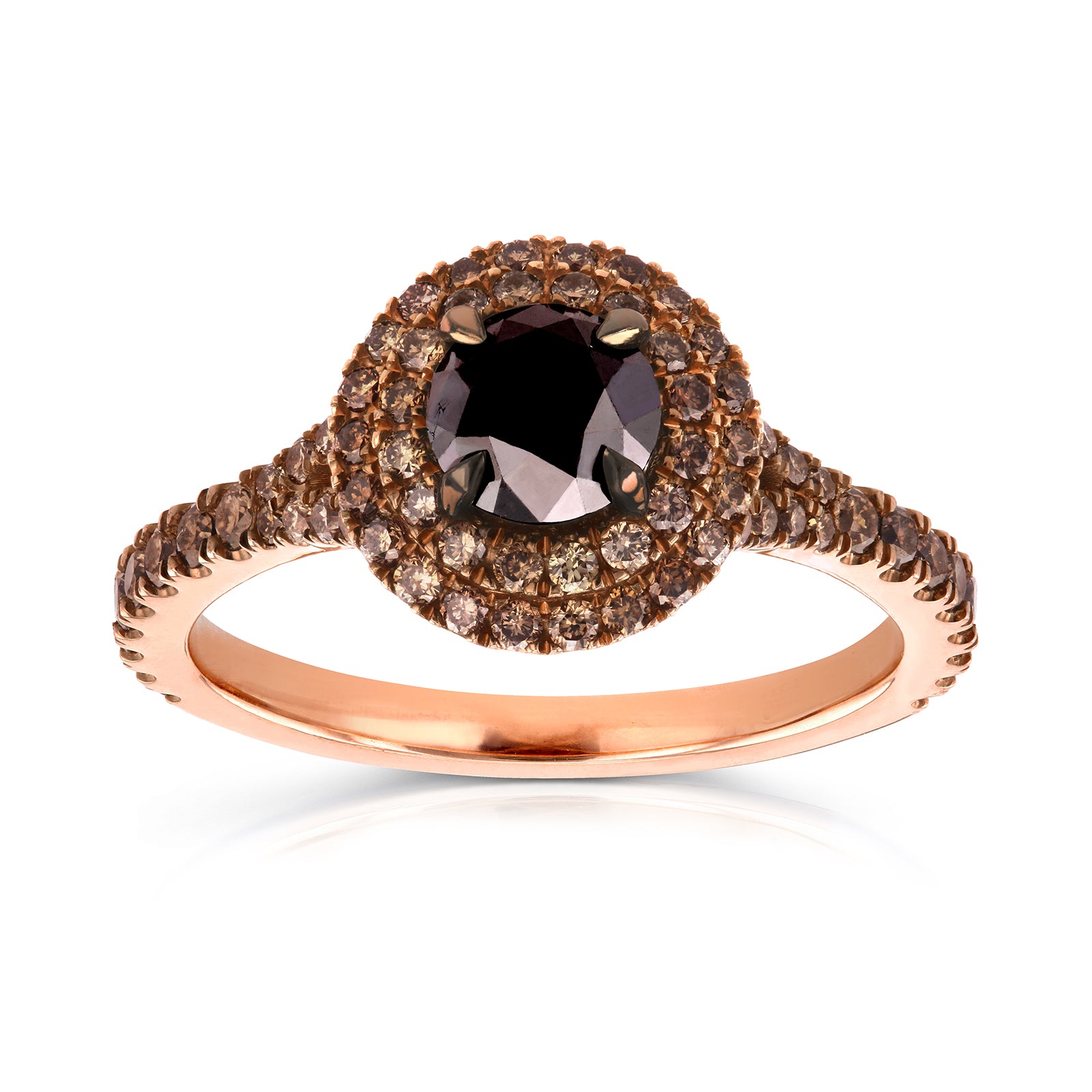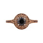This gorgeous black diamond and brown champagne diamond ring features a double halo in 18-karat rose gold over a cathedral center setting.