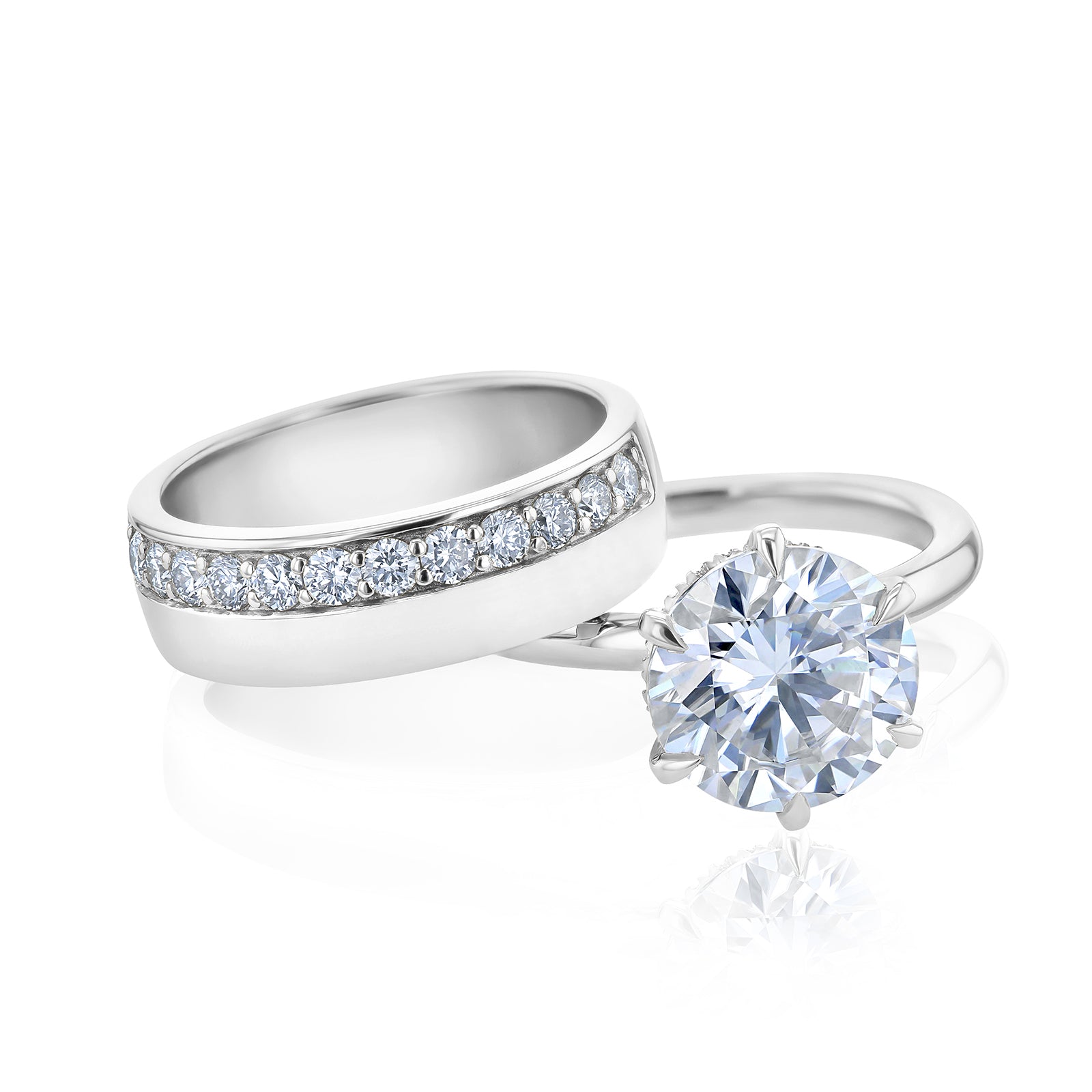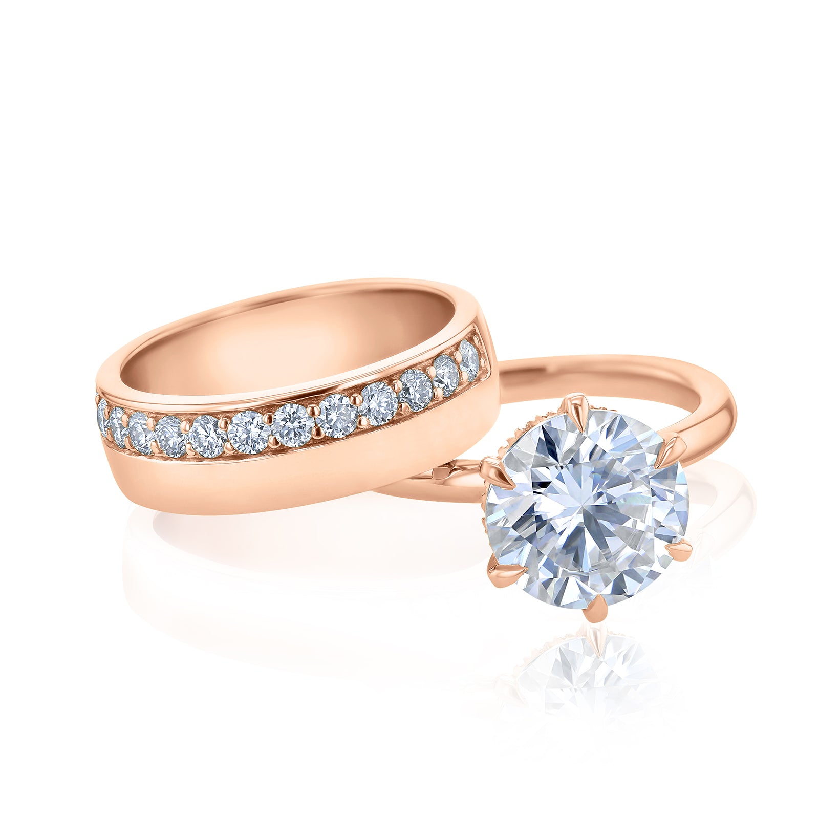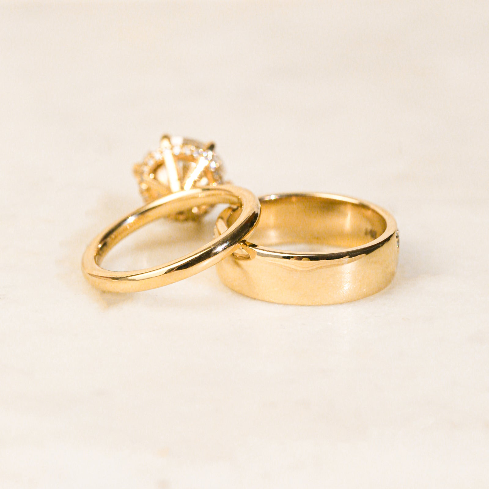 Matched to complete this as a bridal set is the 5.75 mm solid gold and diamond wedding band, similarly designed with a smooth and glossy comfort fit sleeve. The stylish band can be easily worn as a bridal set or on its own, making it hard not to love.