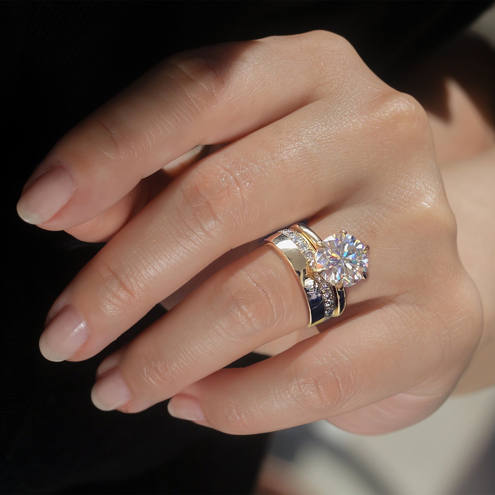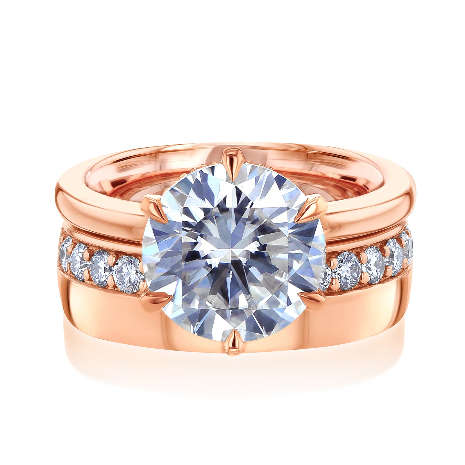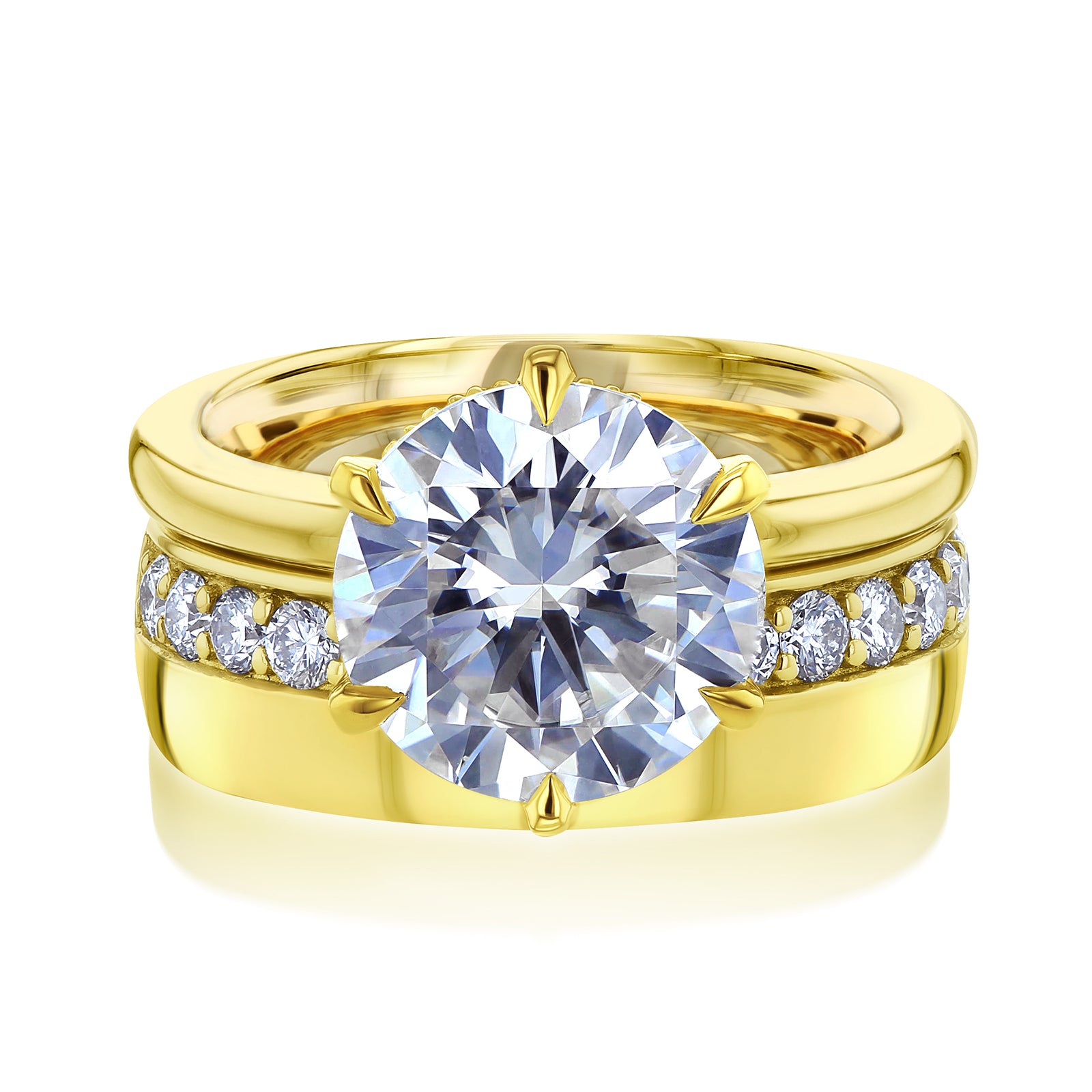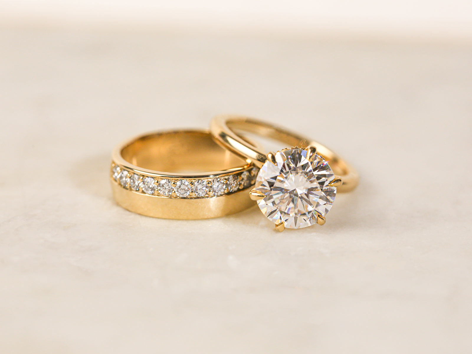 Matched to complete this as a bridal set is the 5.75 mm solid gold and diamond wedding band, similarly designed with a smooth and glossy comfort fit sleeve. The stylish band can be easily worn as a bridal set or on its own, making it hard not to love.