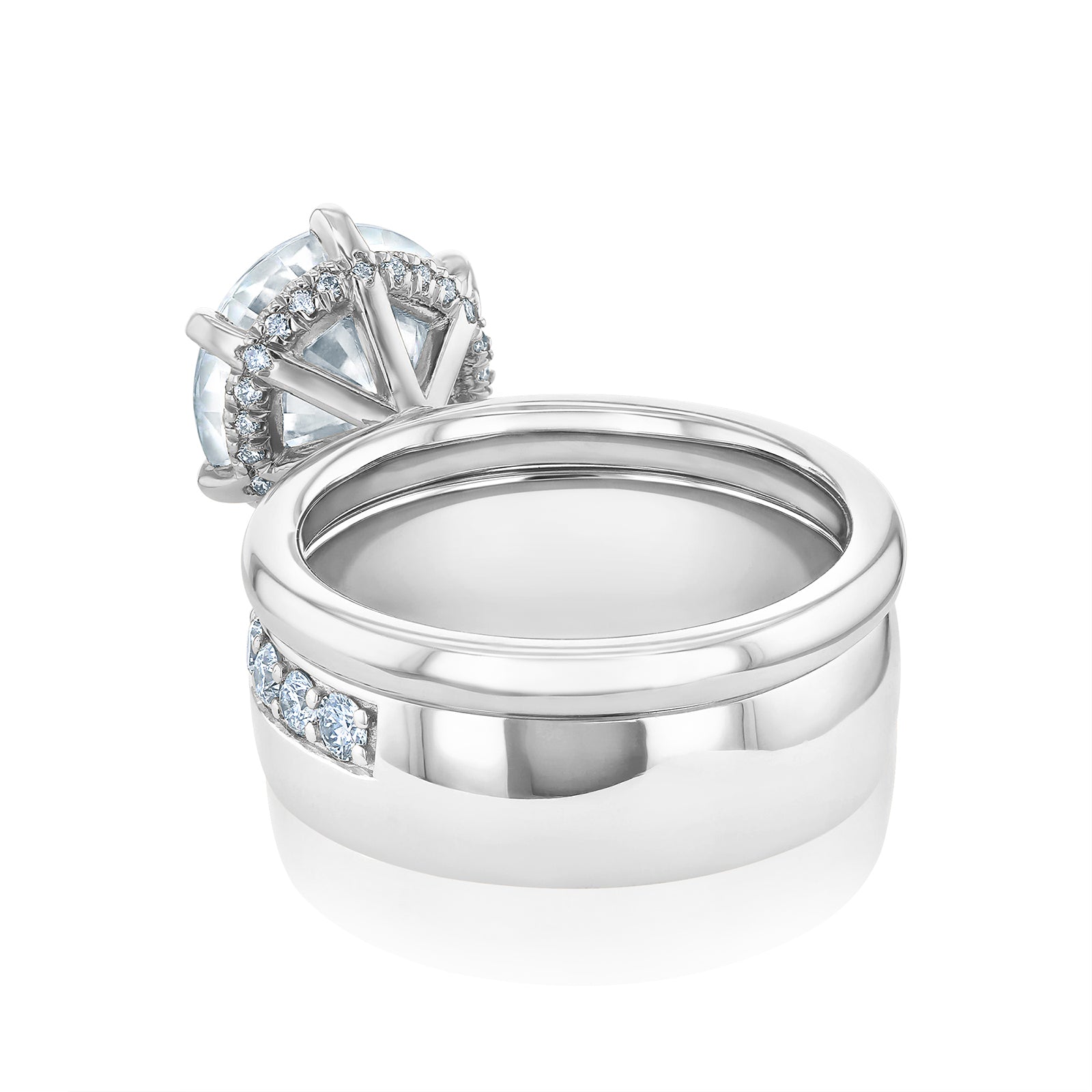 The Dorado Bridal Set features a 3 carat round diamond center stone with a hidden eternity halo of diamonds in a slim basket setting. The solid gold engagement band is finished in a high polish with no extra accents for a clean look that brings attention directly to the breathtaking center stone on the engagement ring.