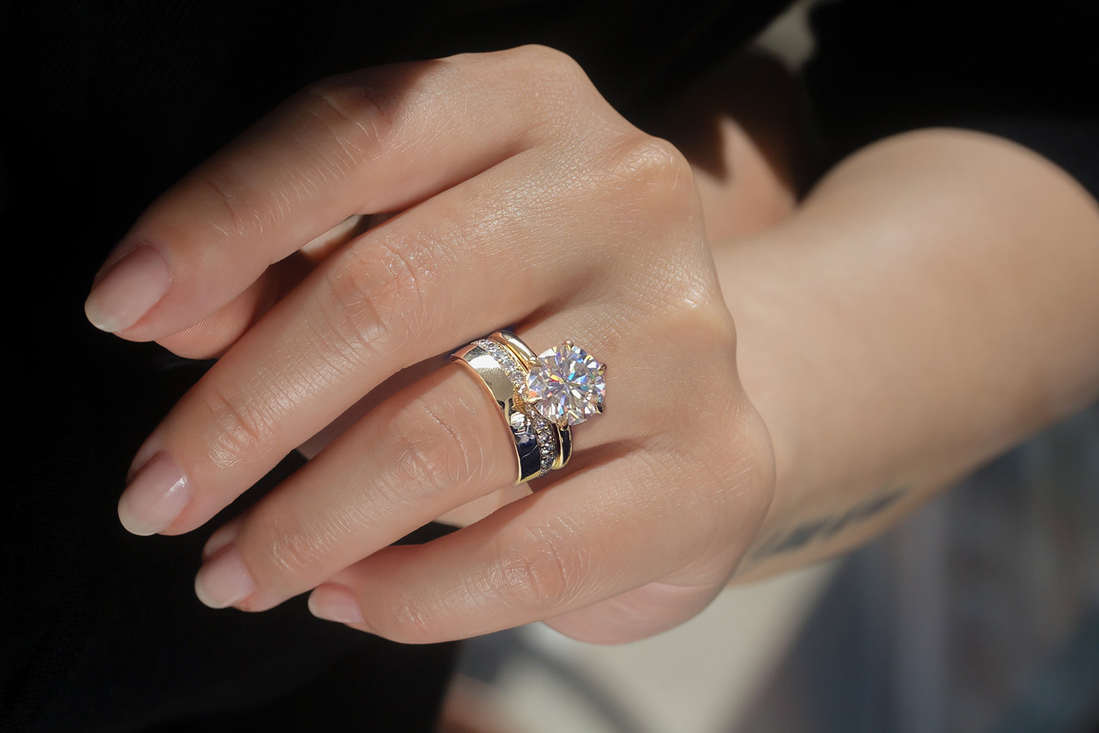All photos on this product are taken in-house with real stock. The model is wearing size 5.5. The rings in the other photos are size 6.