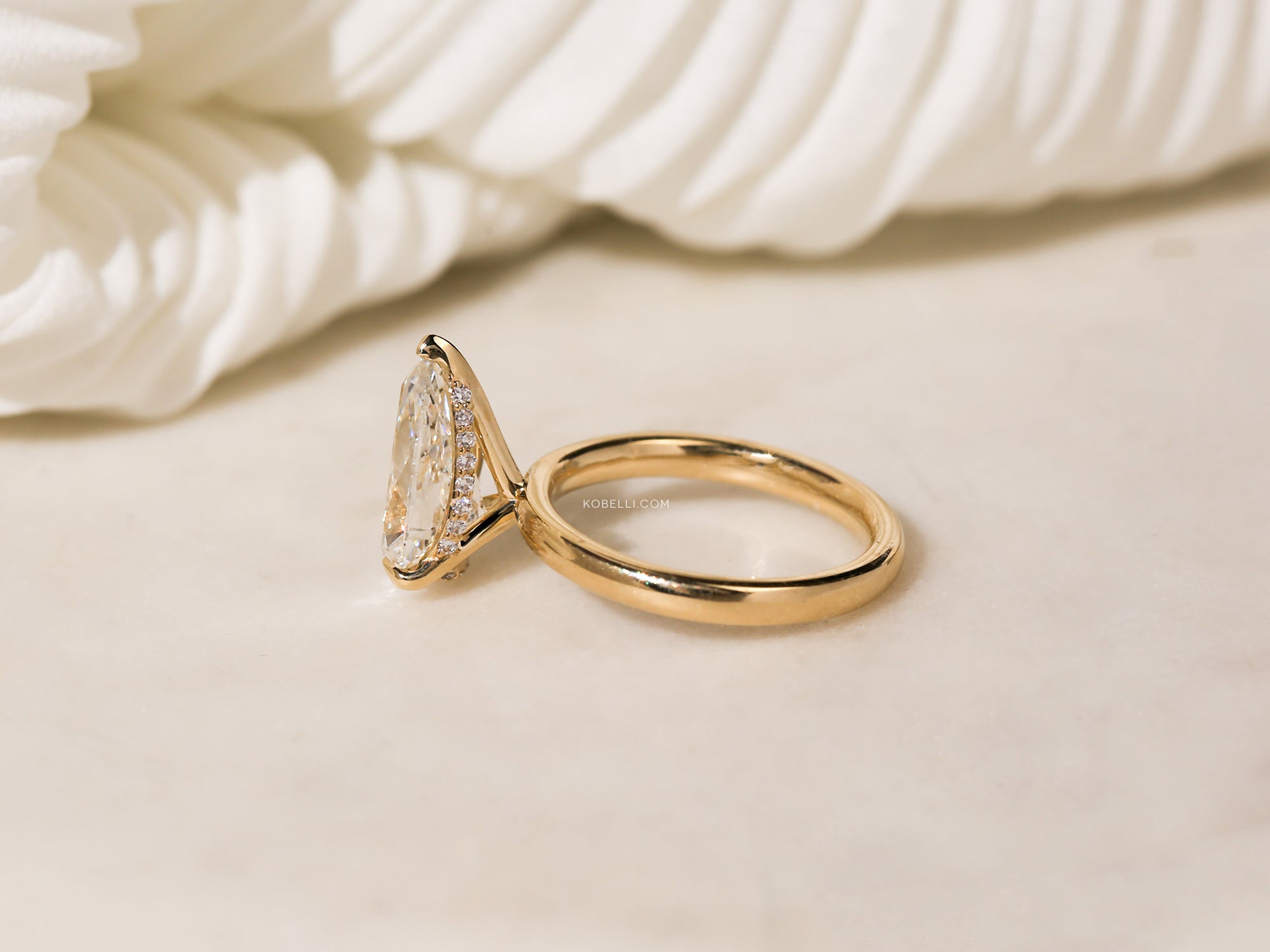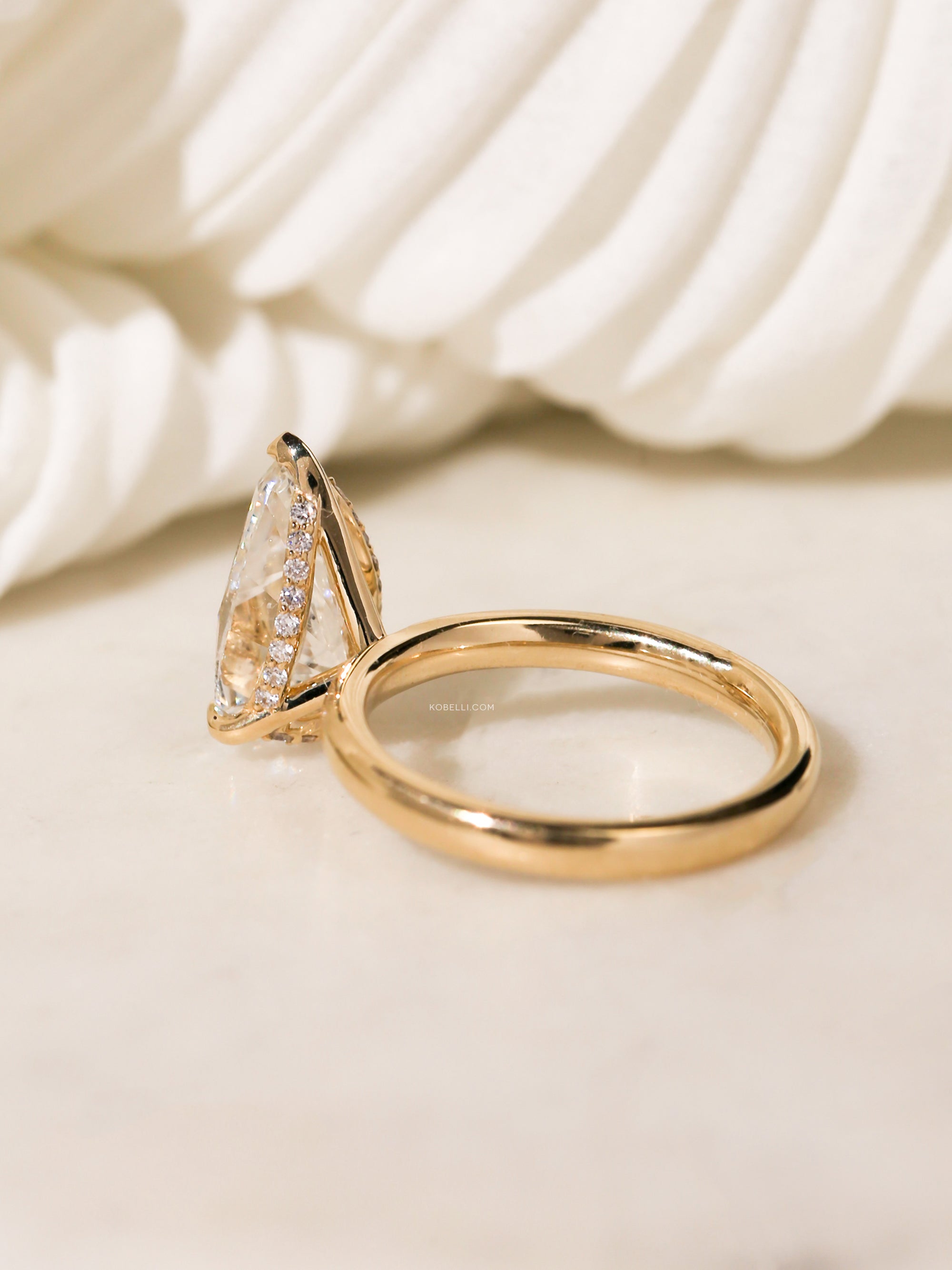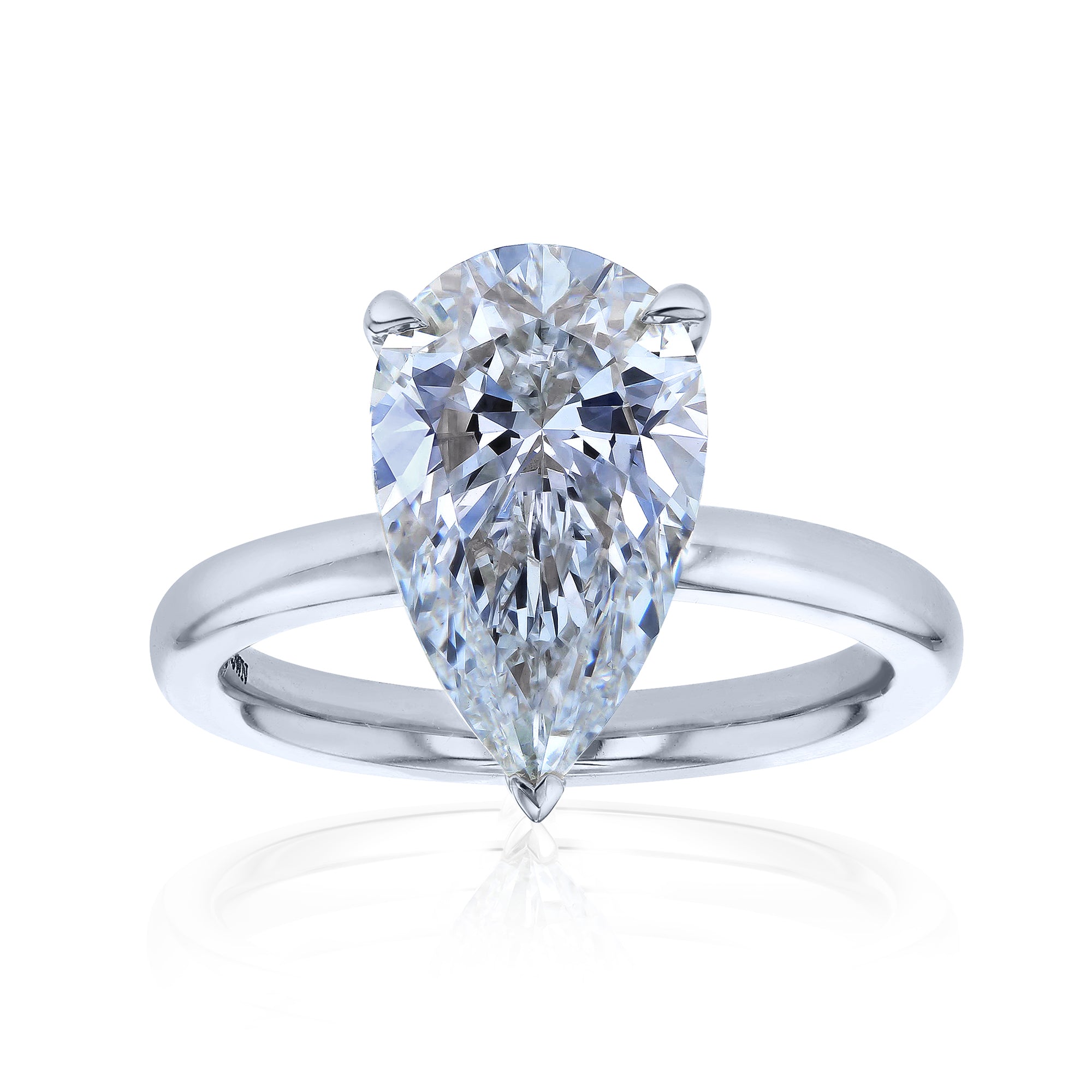 The Dublin Ring features a large pear shaped brilliant-cut diamond center over a drape halo in a floating ring setting. The "floating" feature is carried over a solid plain gold or platinum band with a rounded comfort fit sleeve for all-day wear.