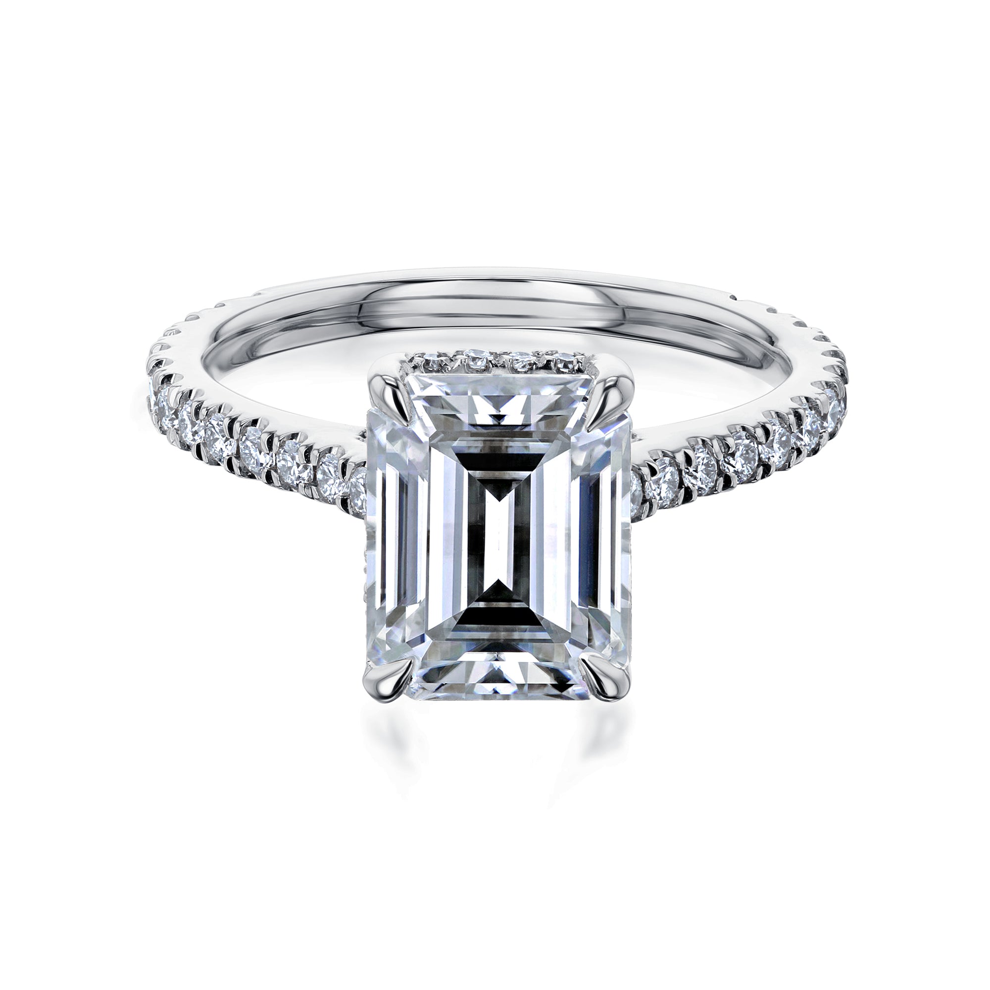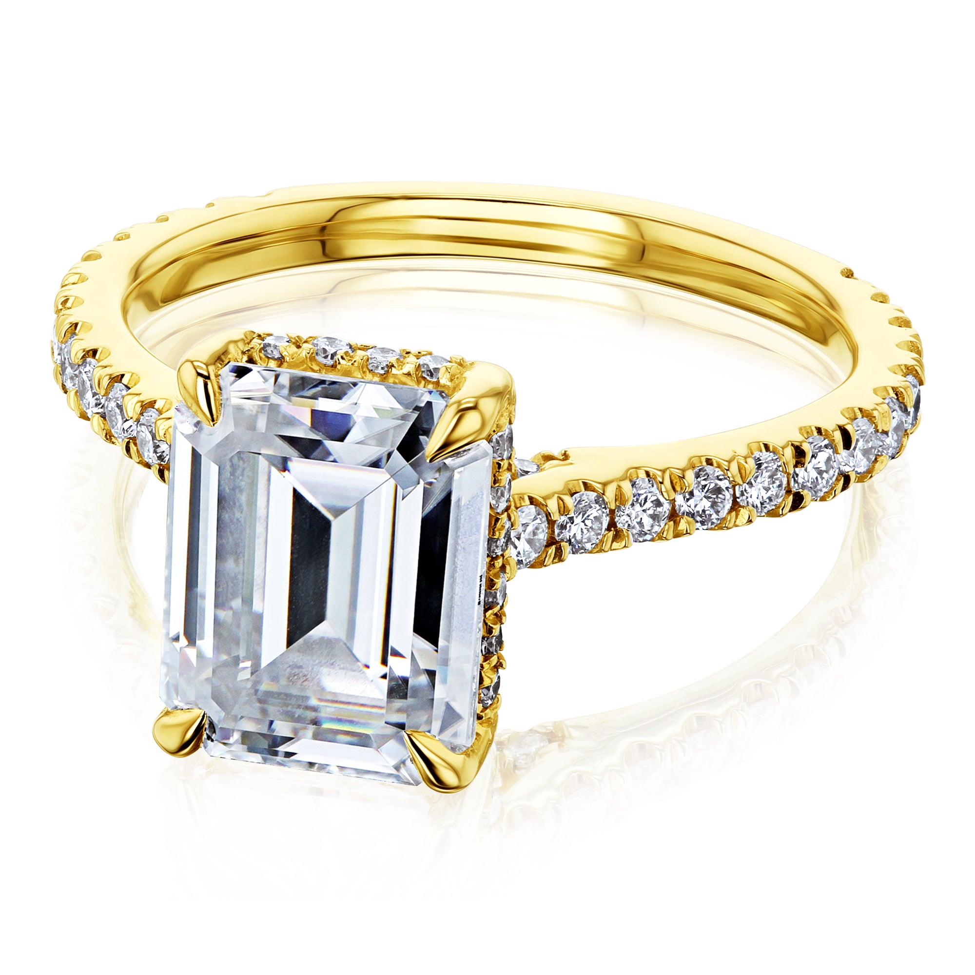 Sparks fly when you are presented with a dazzling emerald-cut moissanite engagement ring. Our 2.45-carat Elaine Moissanite Engagement Ring in 14k solid gold metal and set in a cathedral setting with a hidden halo has a mesmerizing geometric faceting presented in a cascading pattern that transcends timeless brilliance and clarity. 58 round diamond side stones adorn the head ring, extending to the shoulder and all the way down the shank in a semi-eternity fashion.