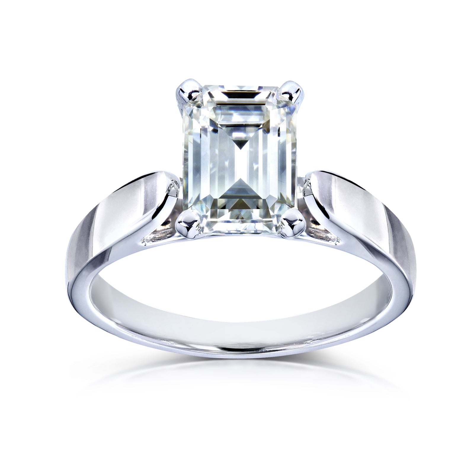 A solo 5x7 mm emerald-cut moissanite is carried to the top of this solitaire engagement ring in classic peg head prongs. The band features an open solitaire setting in solid 14-karat white gold and a high polish finish.