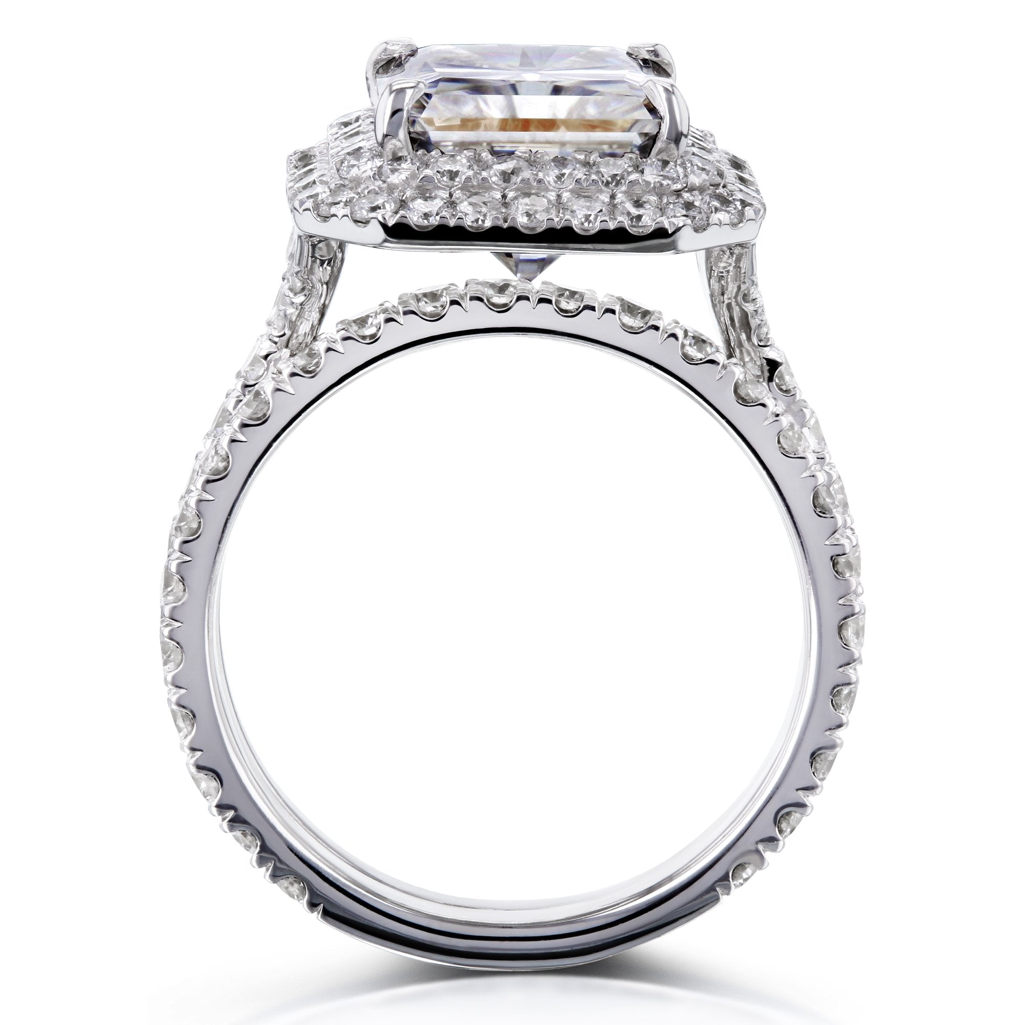 This beautiful 2-piece bridal set features an emerald-cut perfection in solid white gold. The center stone is a highly remarkable lab-created moissanite gemstone weighing 3.5 carats diamond equivalent weight. All stones surrounding the moissanite are in fact natural real white diamonds totaling to over 1 carat in diamond weight. The engagement ring design showcases a semi-split shank right along the top of the ring and an expansive double halo rim icing the center. Diamonds wrap both the bands in a three-quarter eternity ensuring a vision of diamonds galore any way you look at it.