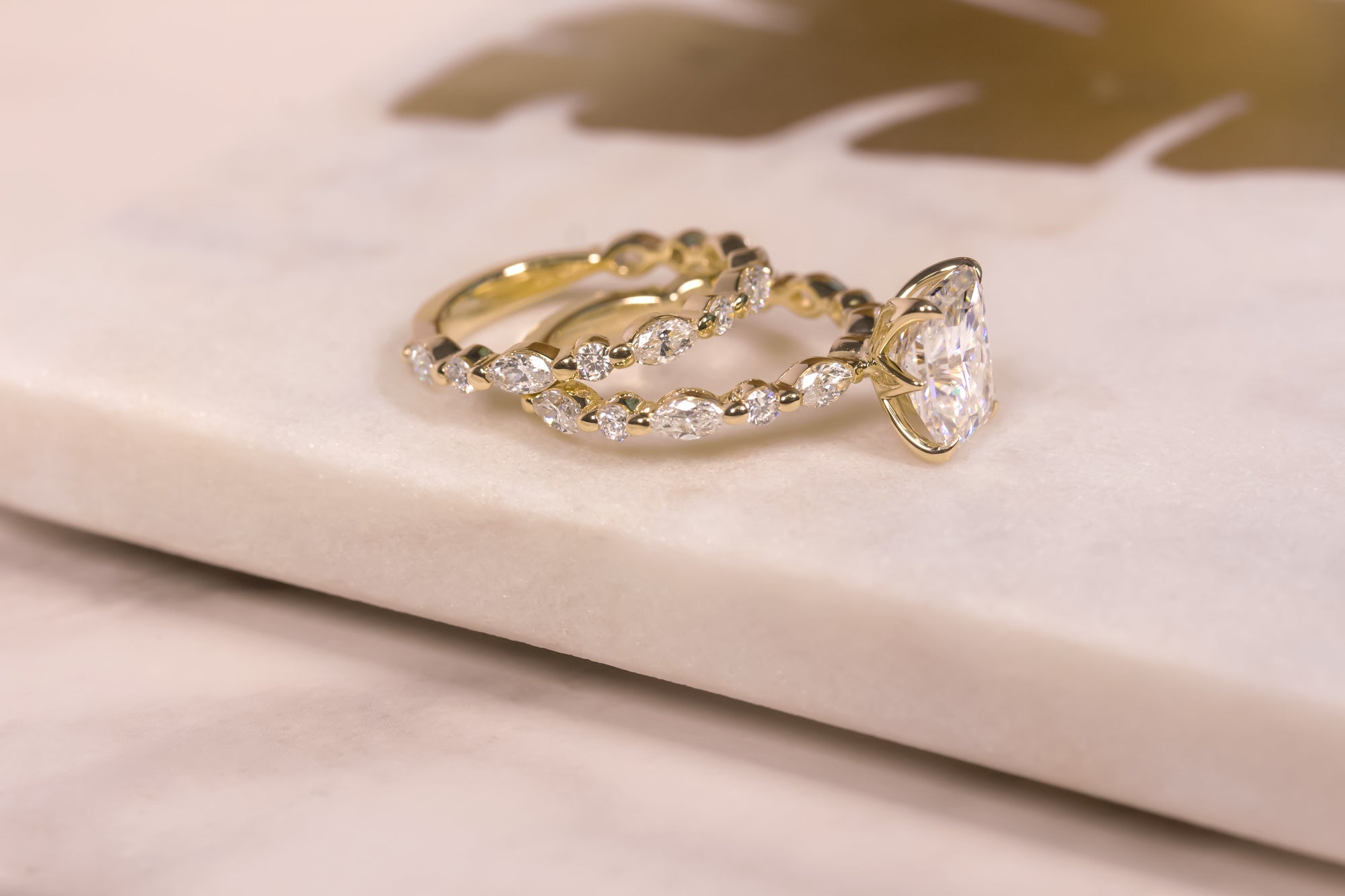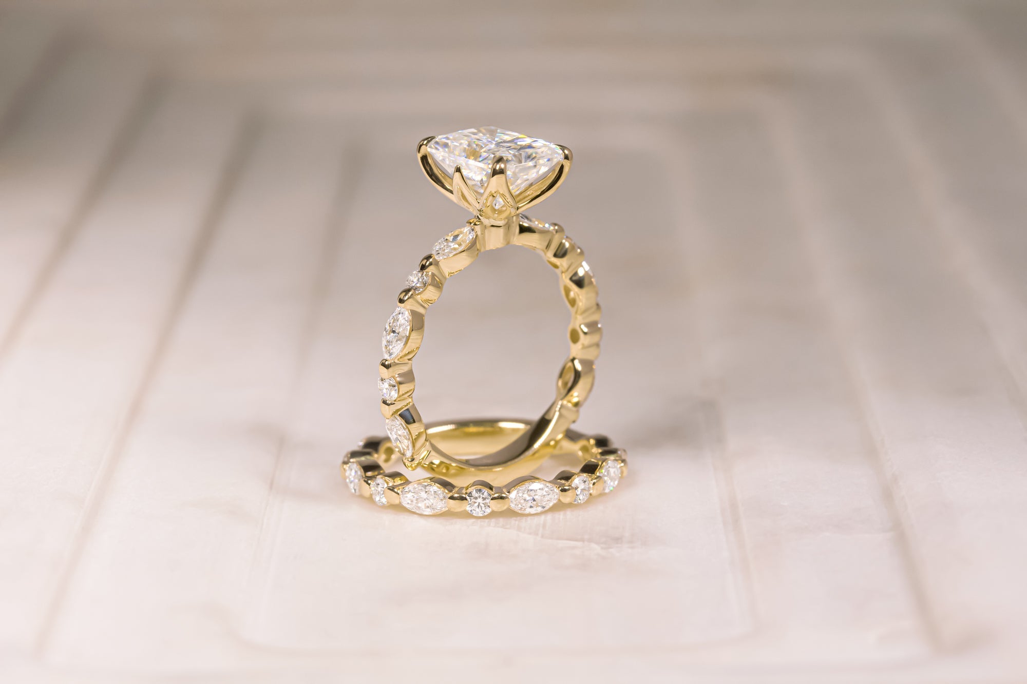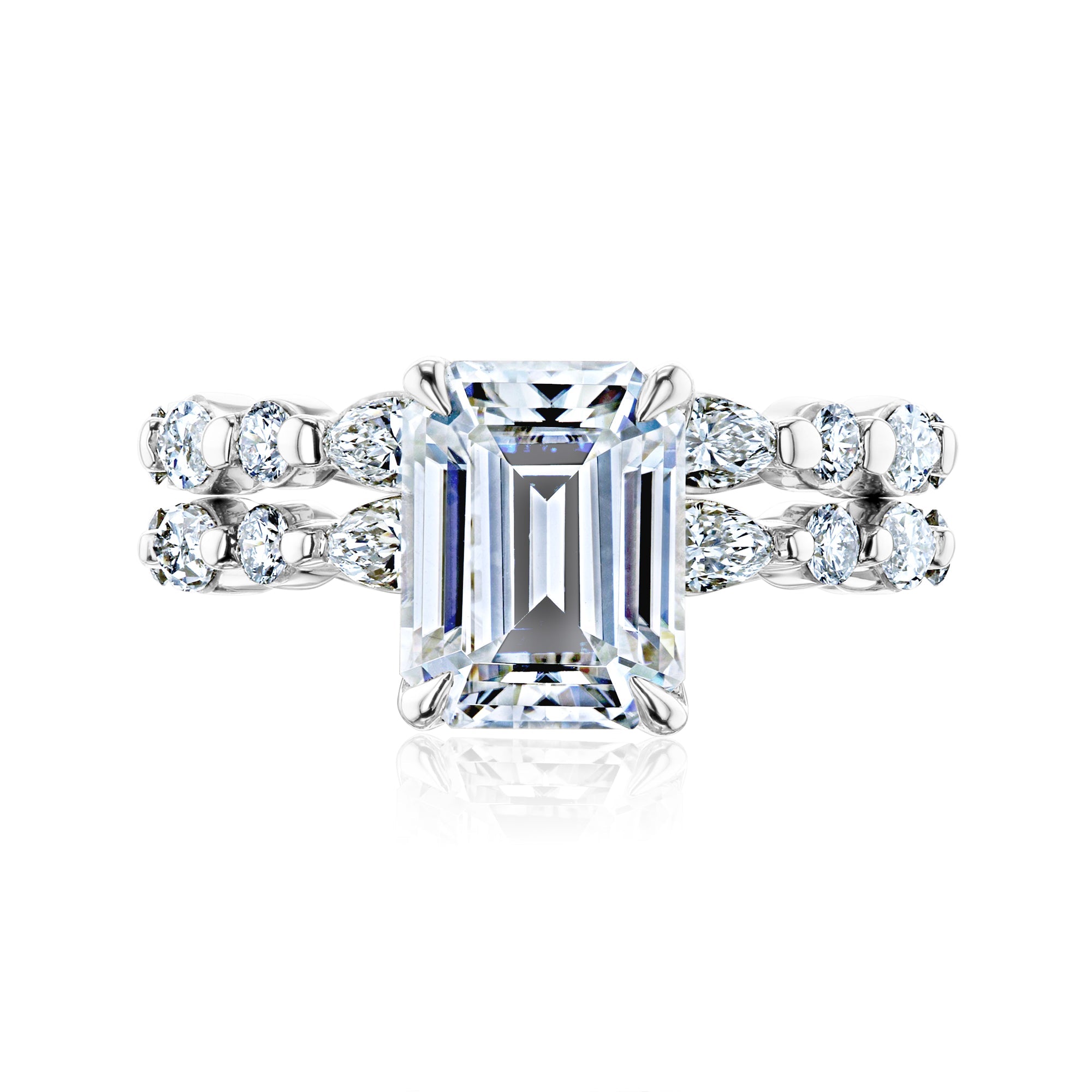 Bringing multiple design elements together from what we do best, this bubble band bridal set carries a large 2.45 carat moissanite center stone, and a series of lab-grown white diamonds of alternating shapes for an additional 1-1/3 carats gemstone weight. Topping the engagement ring of this 2-piece bridal set are petal shaped blossom prongs with an open girdle.