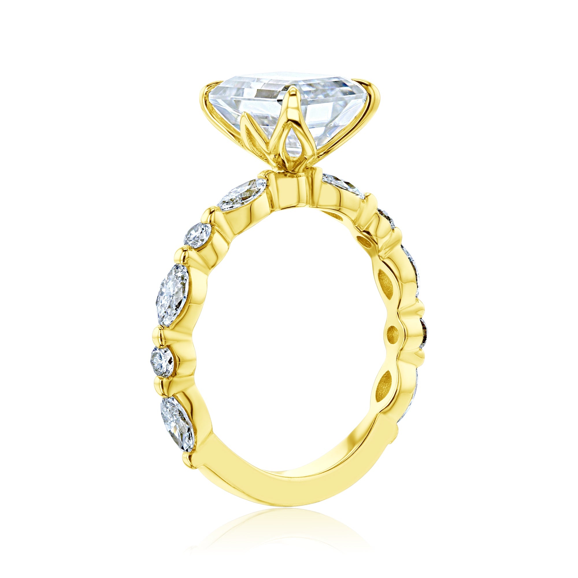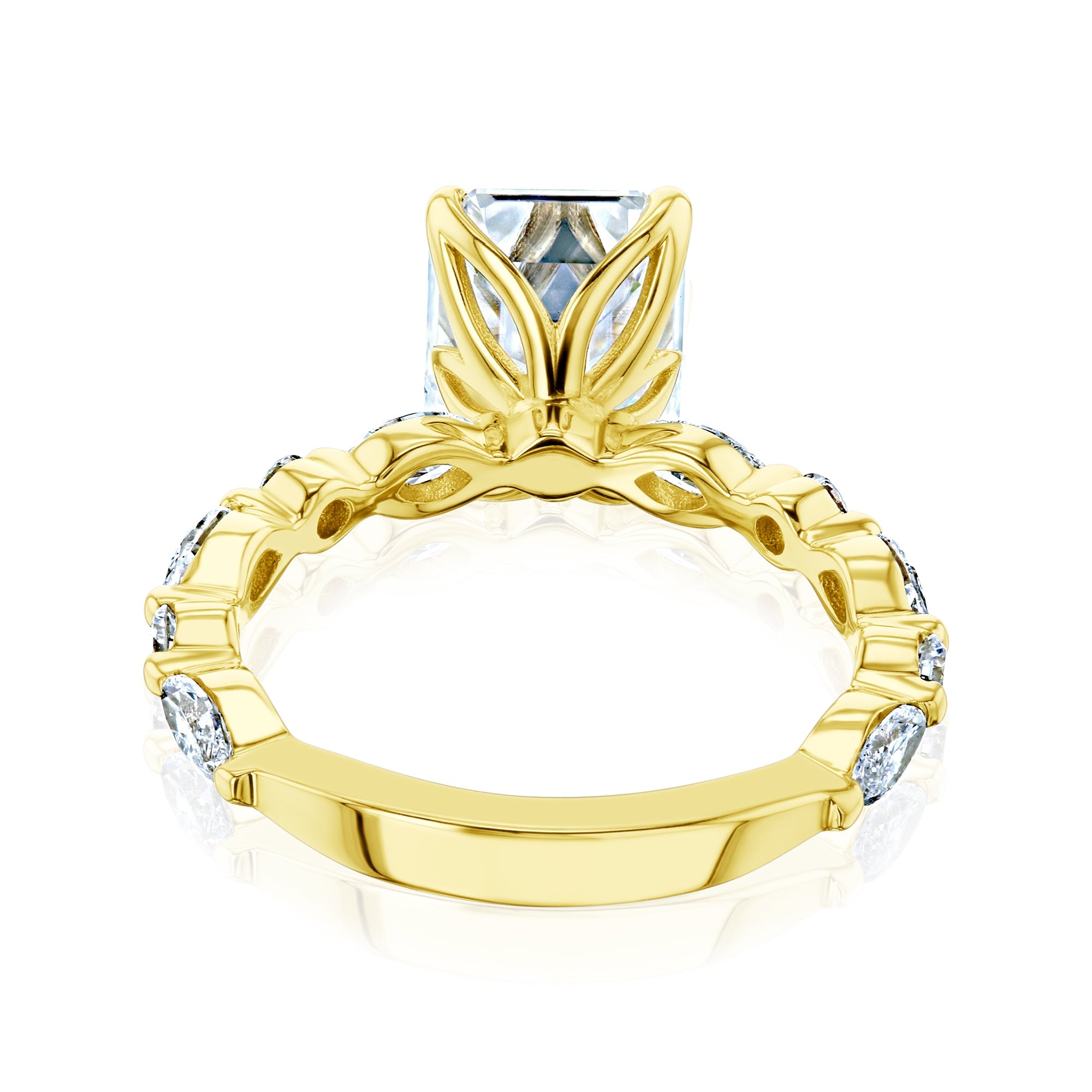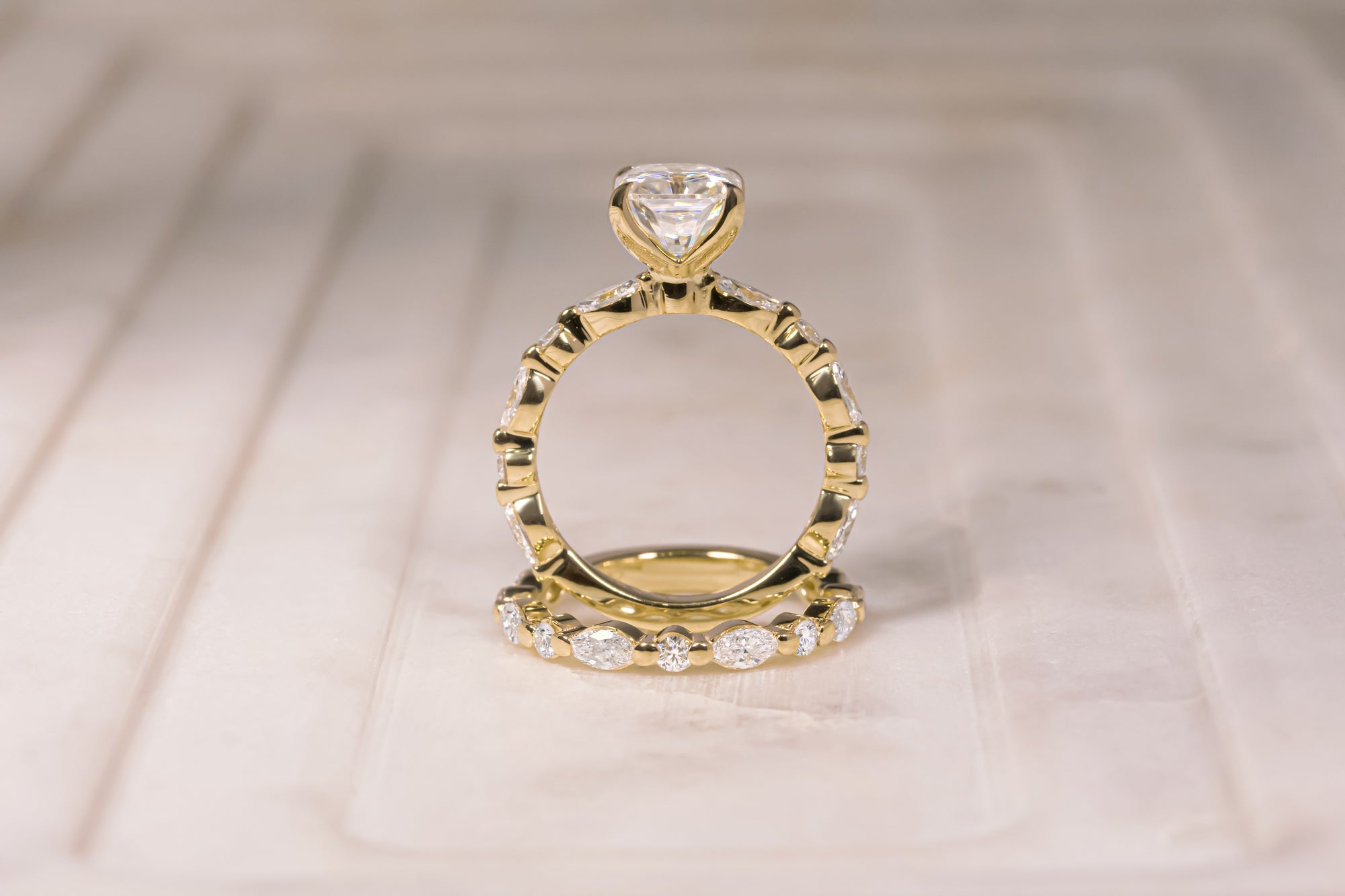 Bringing multiple design elements together from what we do best, this bubble band bridal set carries a large 2.45 carat moissanite center stone, and a series of lab-grown white diamonds of alternating shapes for an additional 1-1/3 carats gemstone weight. Topping the engagement ring of this 2-piece bridal set are petal shaped blossom prongs with an open girdle.