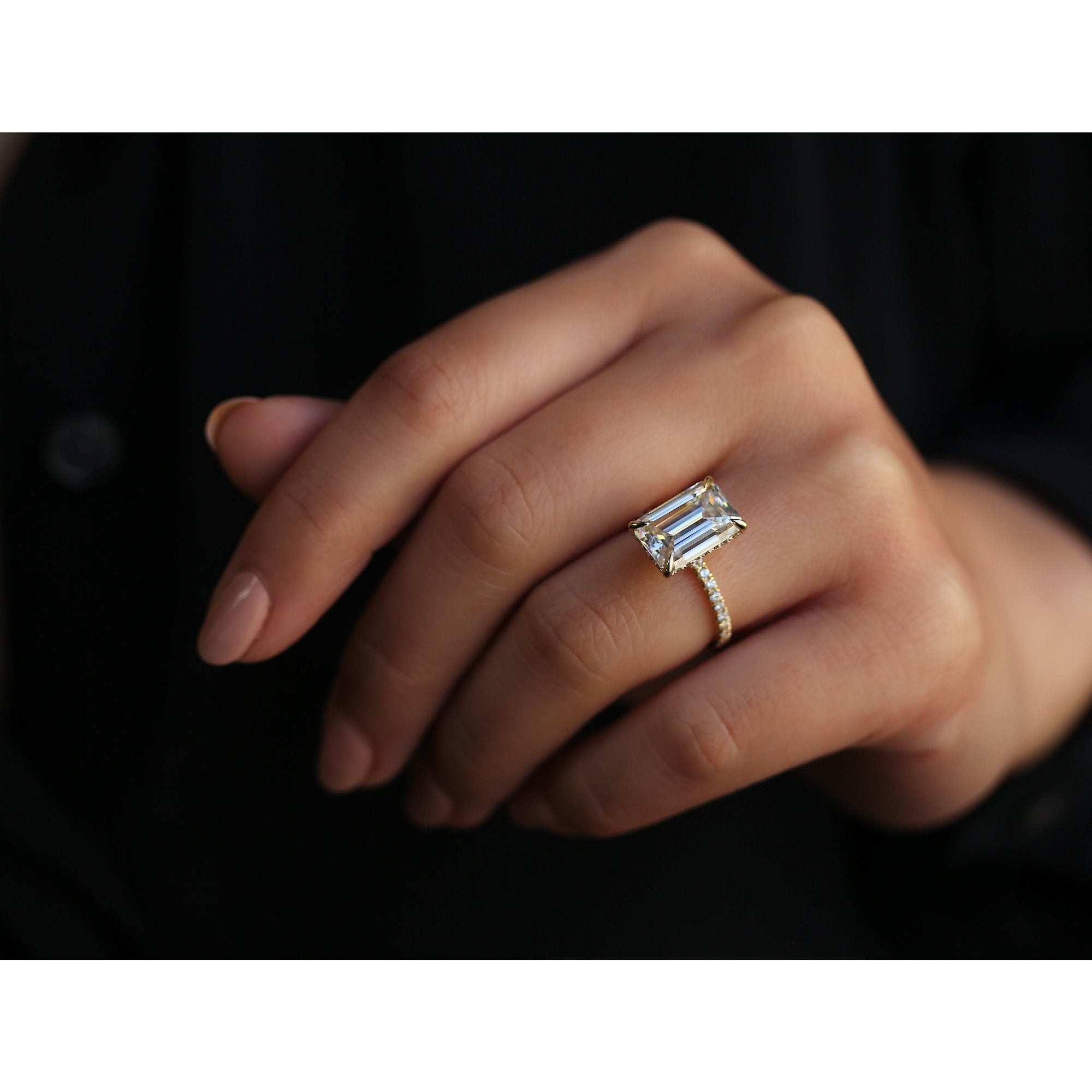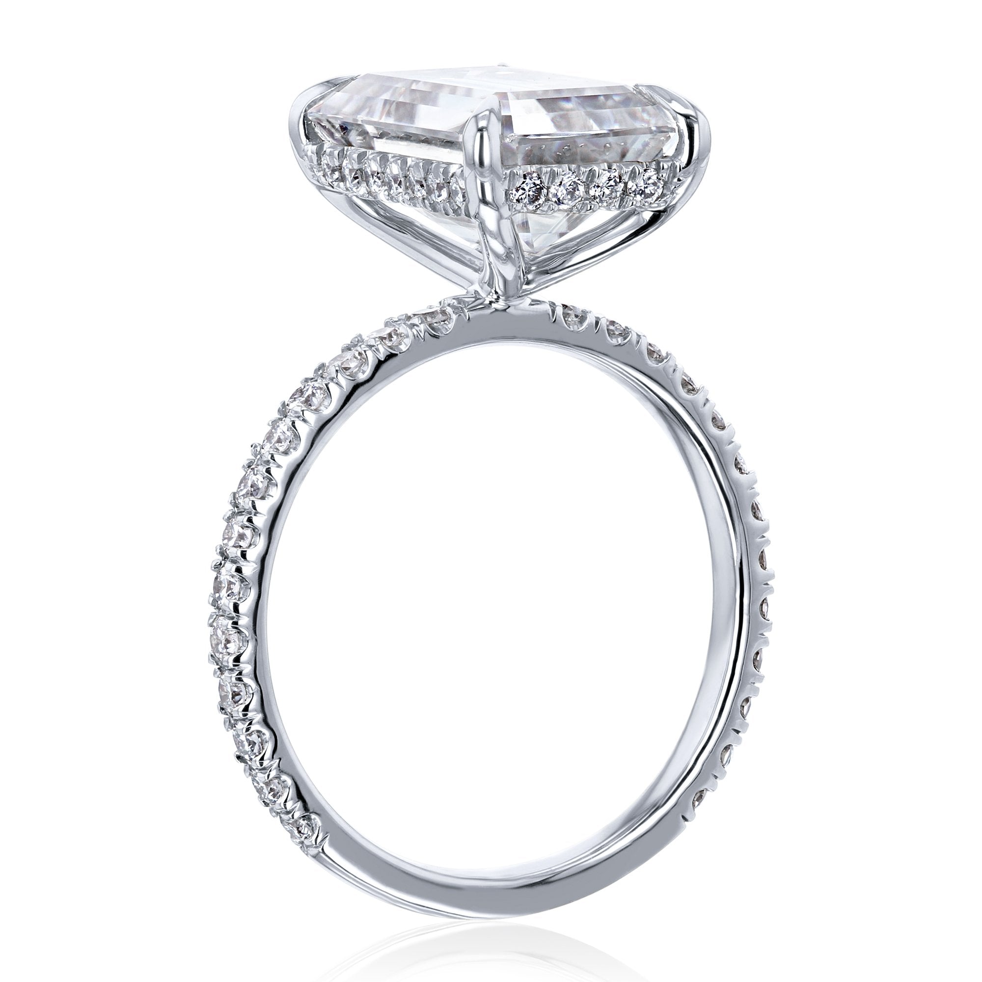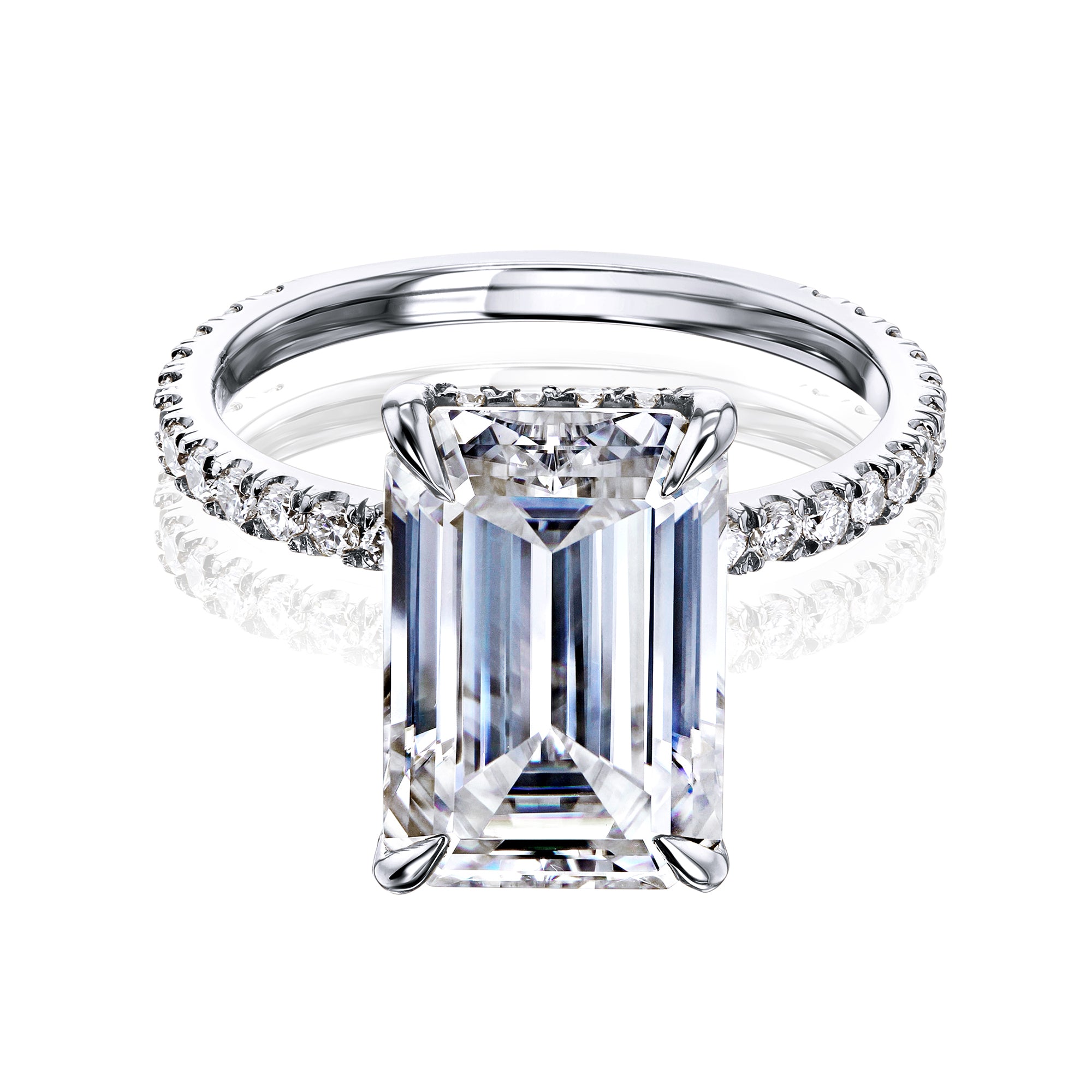The Evie 12x8 engagement ring features a 12x8 mm (5.5 carats diamond equivalent weight) emerald moissanite center stone with a hidden halo of lab-grown diamonds in a slim basket setting. The shank of this ring is illuminated with pavé lab-grown diamonds in a semi-eternity fashion.