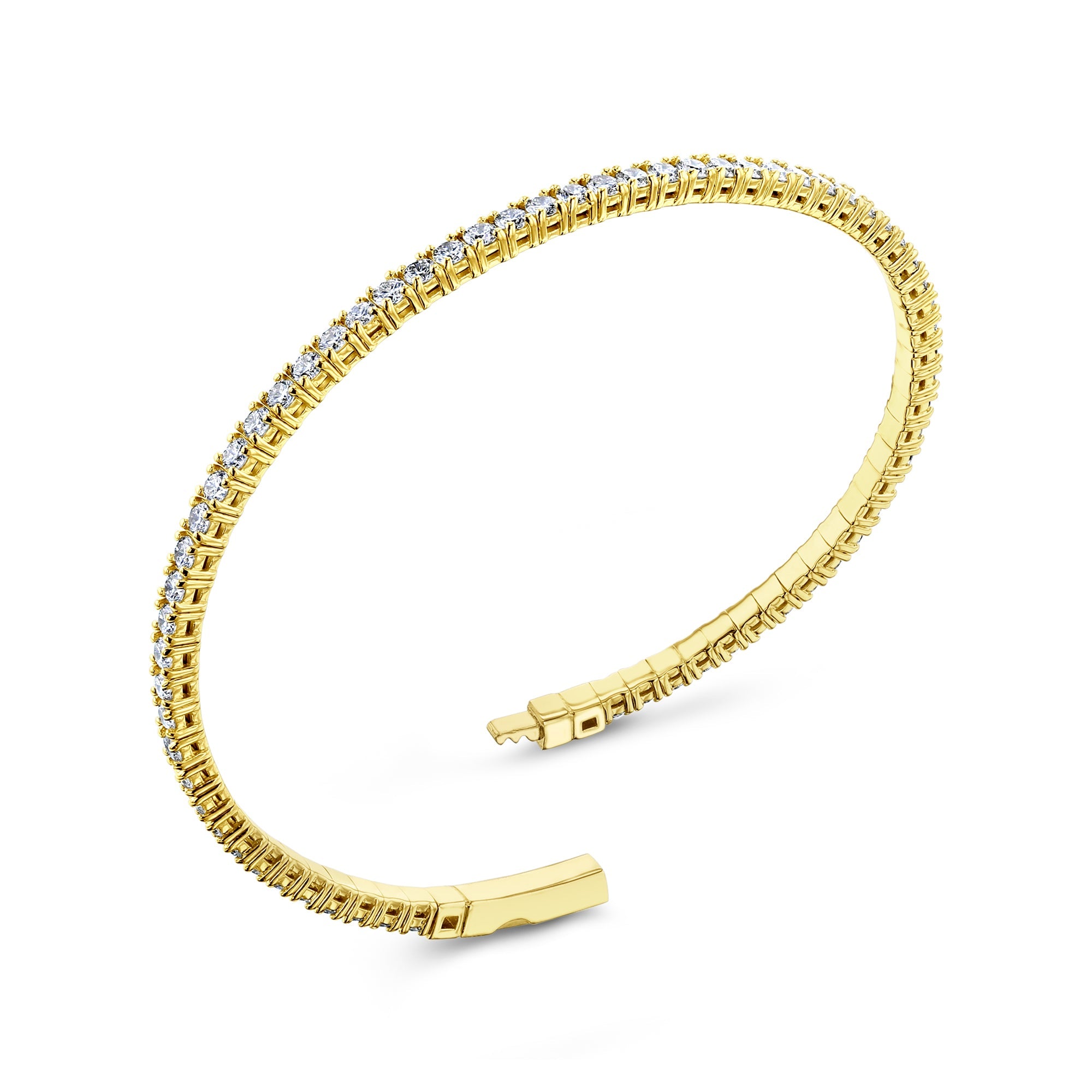 Pure decadence presents itself in bright colorless diamonds and solid gold metal in this showstopping bangle bracelet. Over 60 diamonds circulate the semi-flexible eternity bangle. Each 2.3 mm lab-grown diamond is held individually with 4 micro prongs and lined uniformly to a tee to the next sparkling stone creating an endless glitter around your entire wrist.