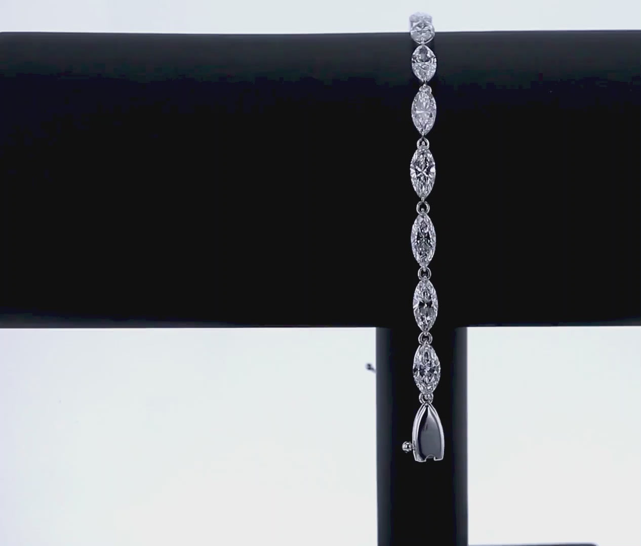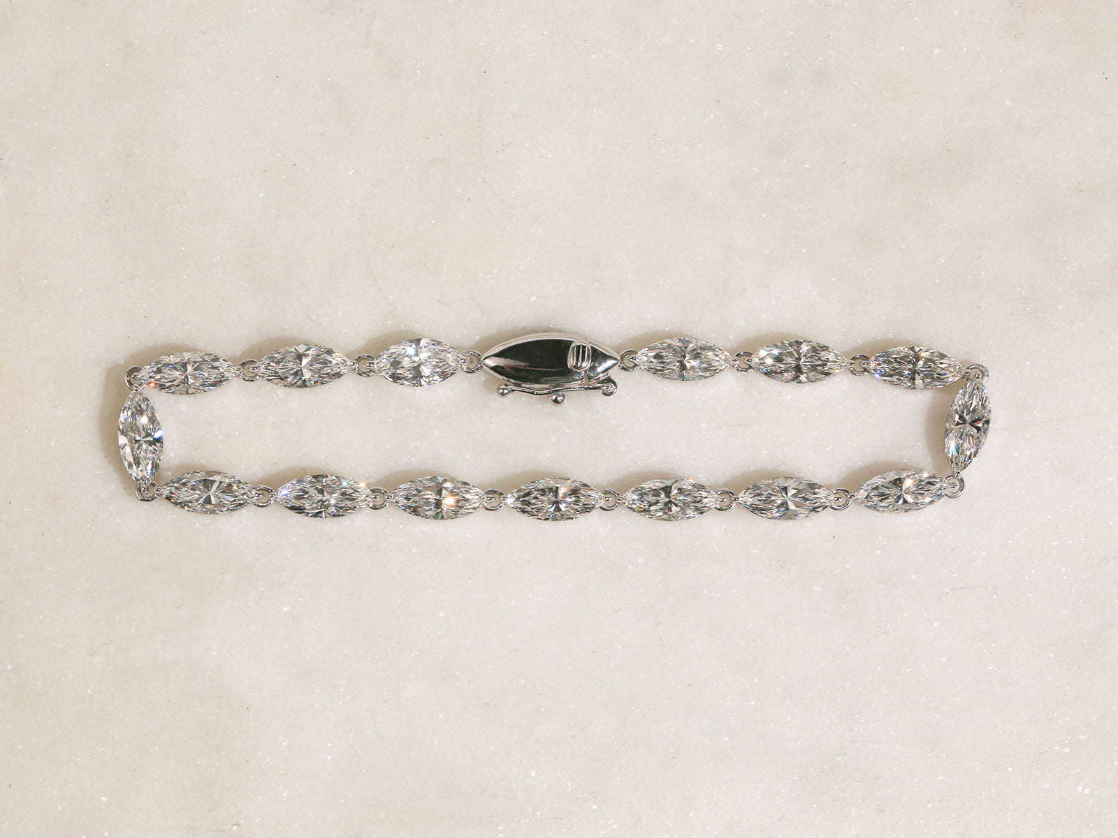 Fifteen brilliant marquise-cut diamonds cascade along this exquisite solid gold tennis bracelet, creating an unmistakable statement of refined elegance. Each stone is meticulously positioned to catch and reflect light, delivering the sophisticated sparkle that defines luxury jewelry.