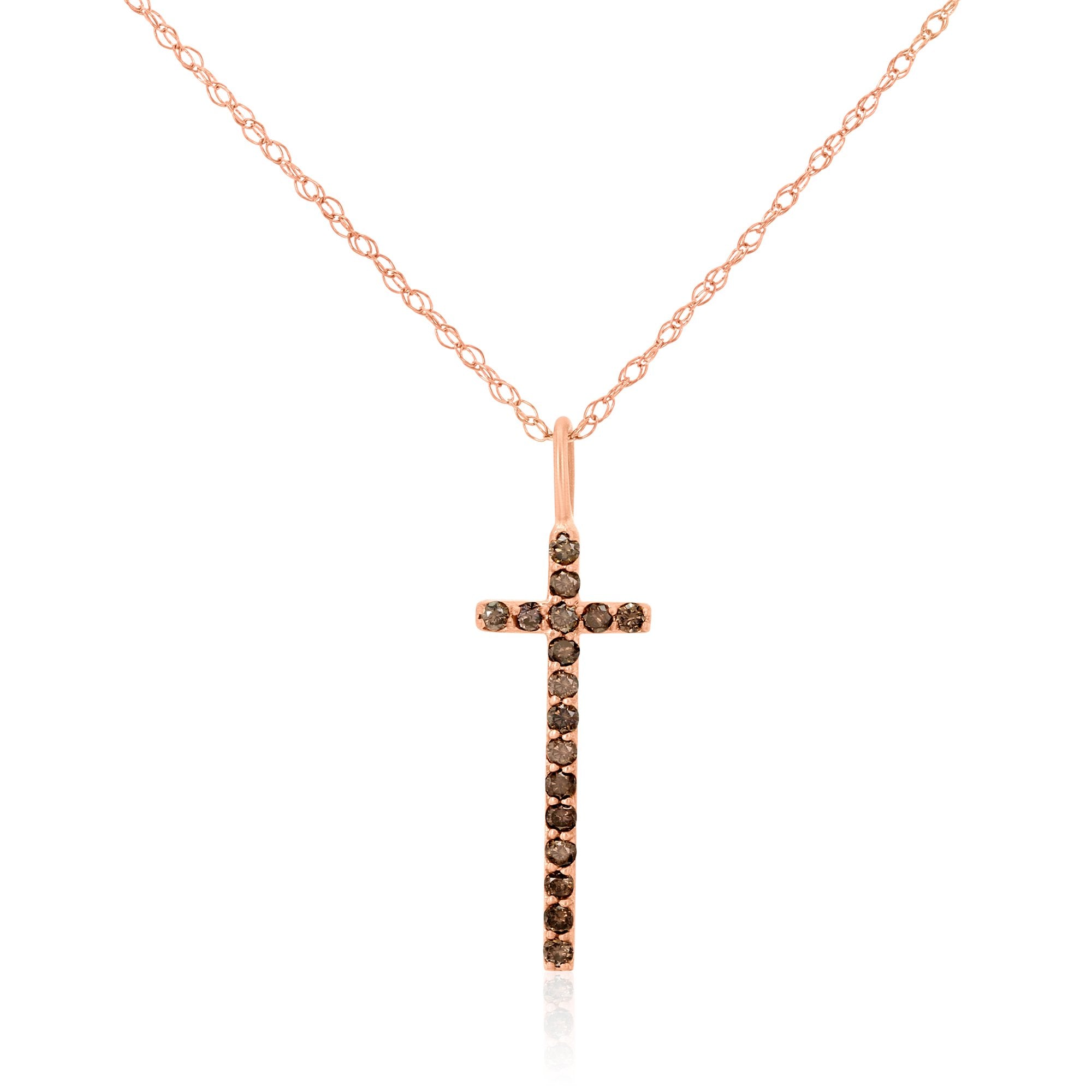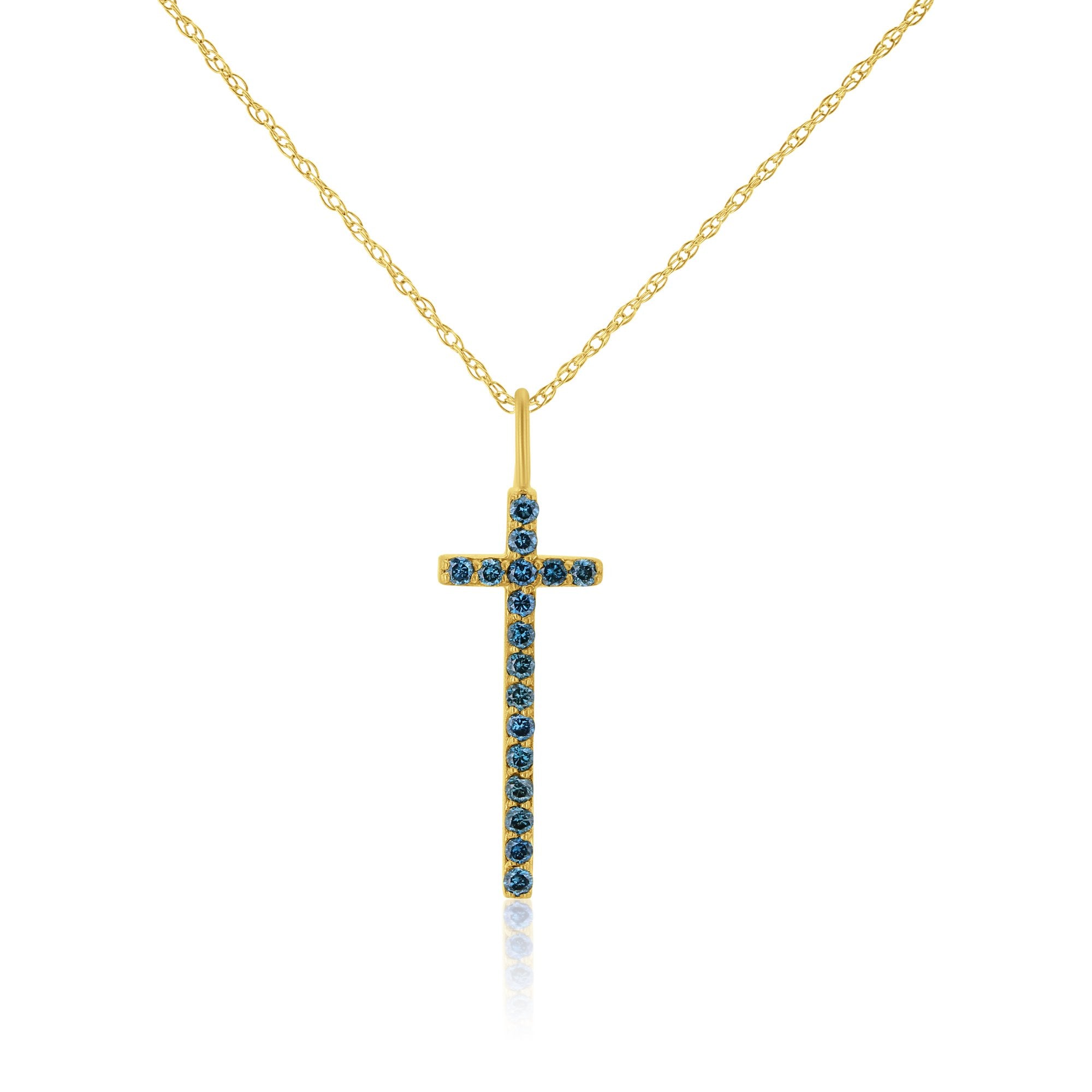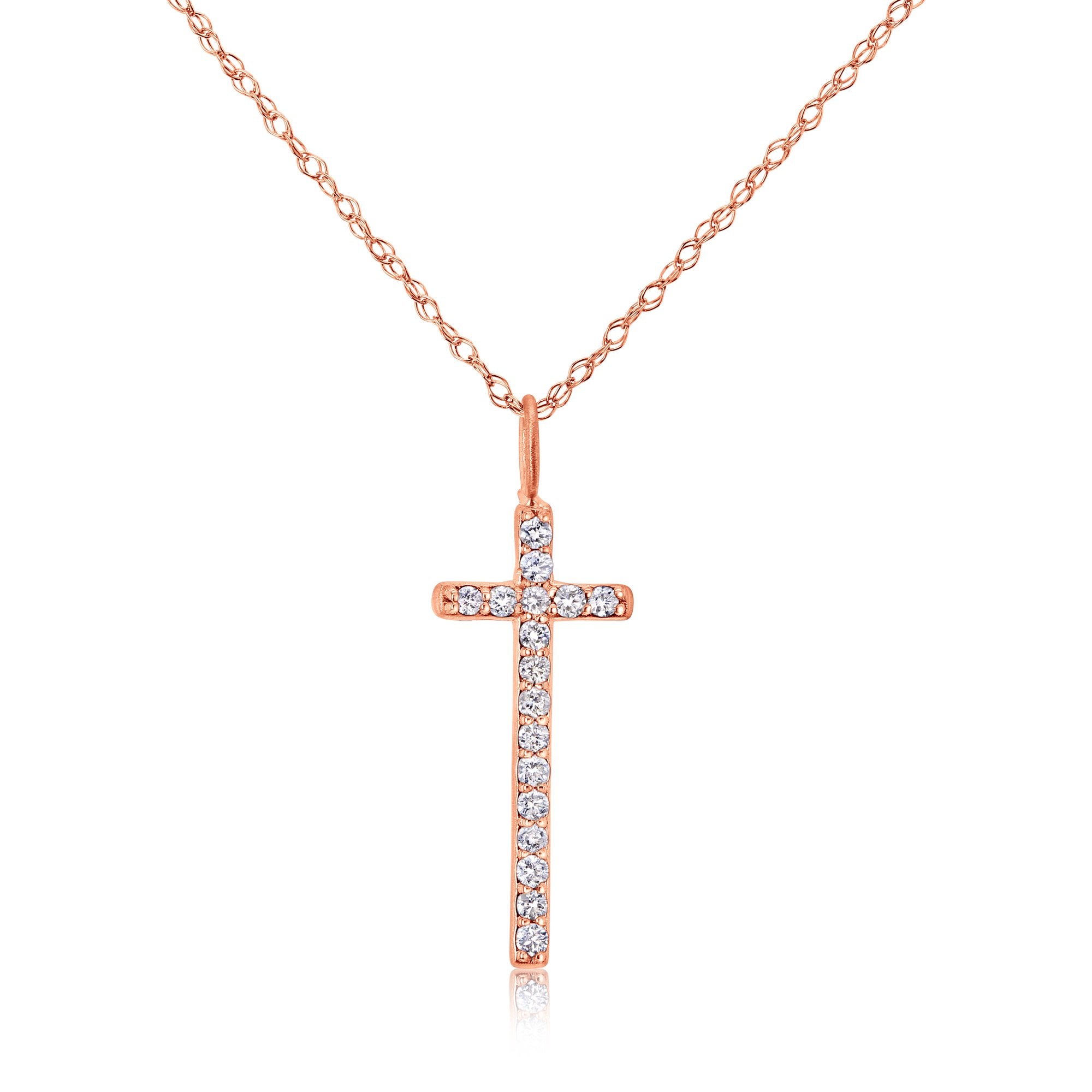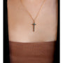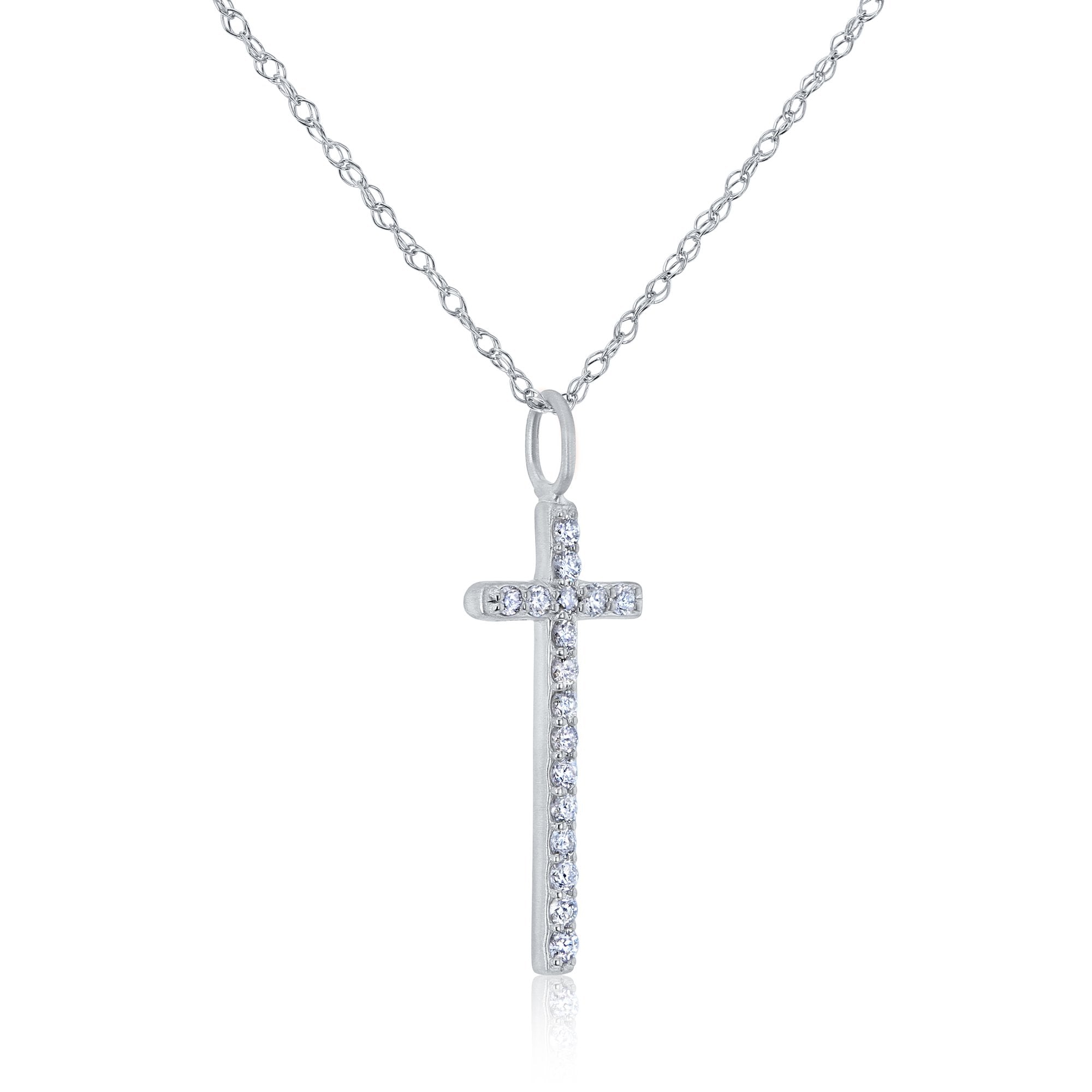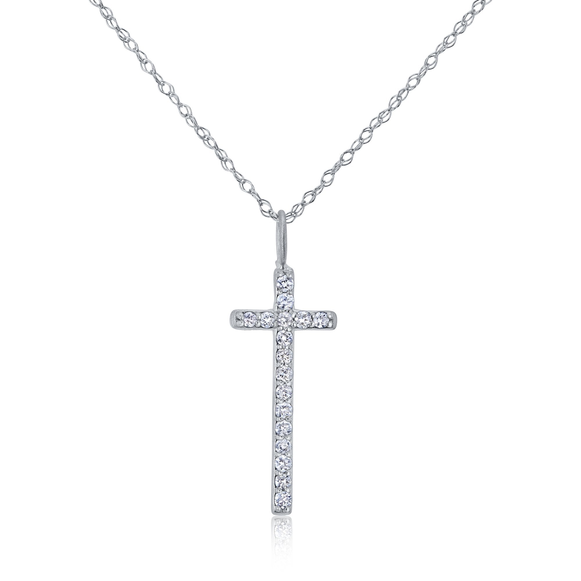 A minimally designed and narrow cross pendant is set with 17 round gemstones suspended by an 18 inch long light chain.