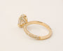Completing the glimmering design, the center setting is held with a diamond basket and diamond hidden halo, for a full-on diamond decked mounting. The wrap-around hidden halo tucks just under the surface of the center moissanite allowing for light to hop right onto that center stone and bring out its overflowing fire.