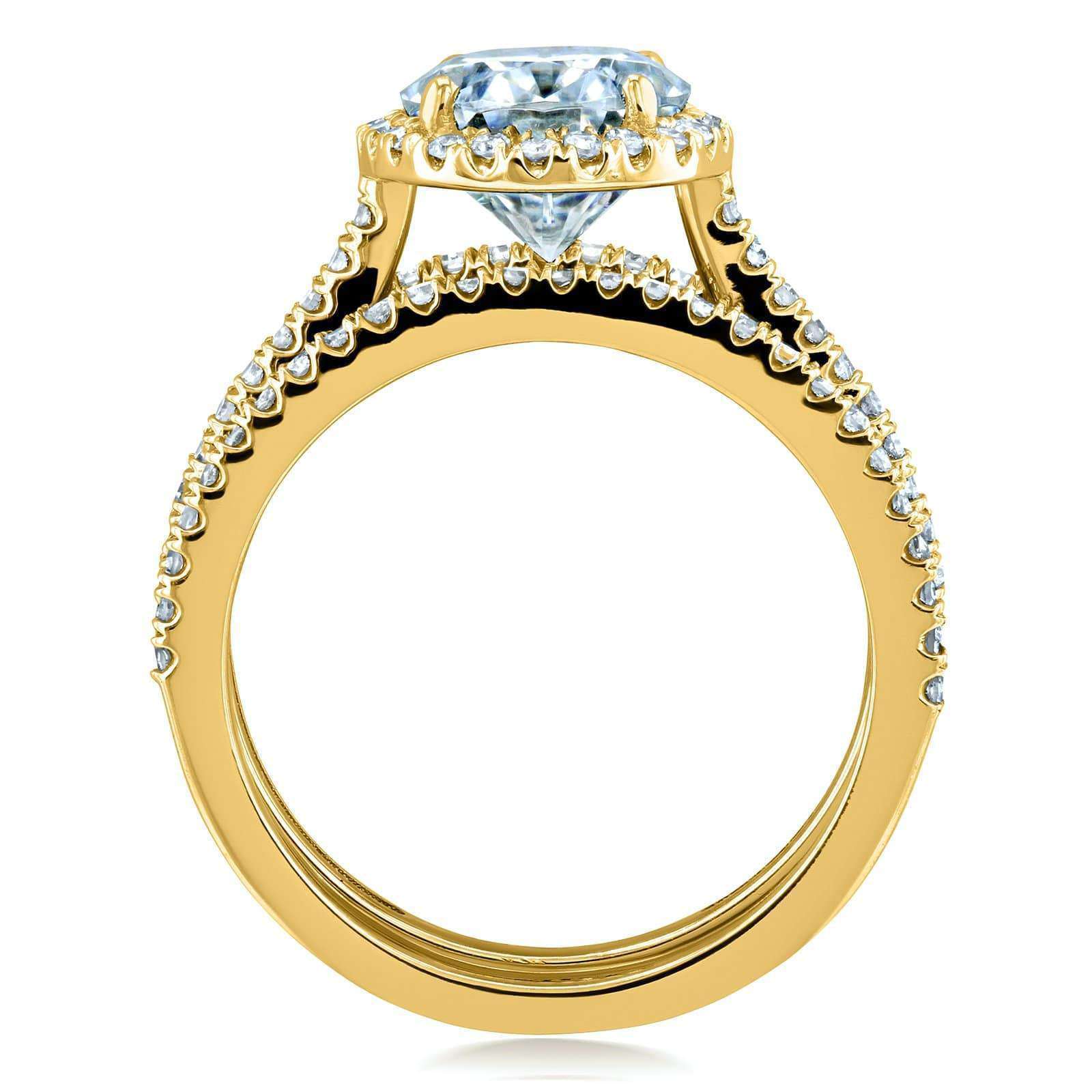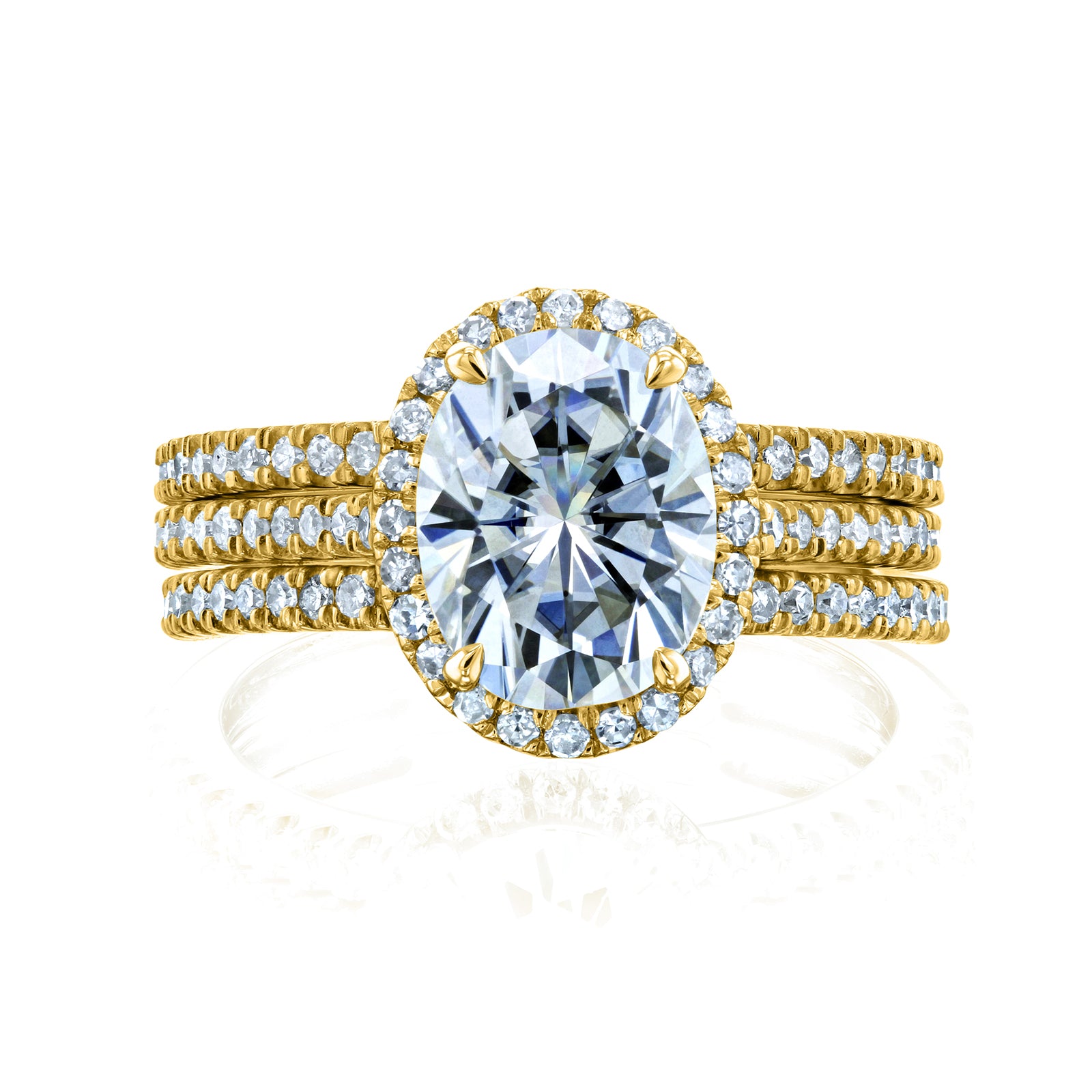 A two carat oval-cut moissanite captures the most brilliant of sparkles over this diamond and gold 3-piece bridal rings set. Decorating this moissanite center stone are entirely natural earth mined diamonds for a perfect mix of contemporary and tradition. The moissanite showcases pristine clarity whereas the diamonds showcase shimmering luxury. The 3 rings are made with 14-karat yellow gold and are finished with a beautiful high polish.