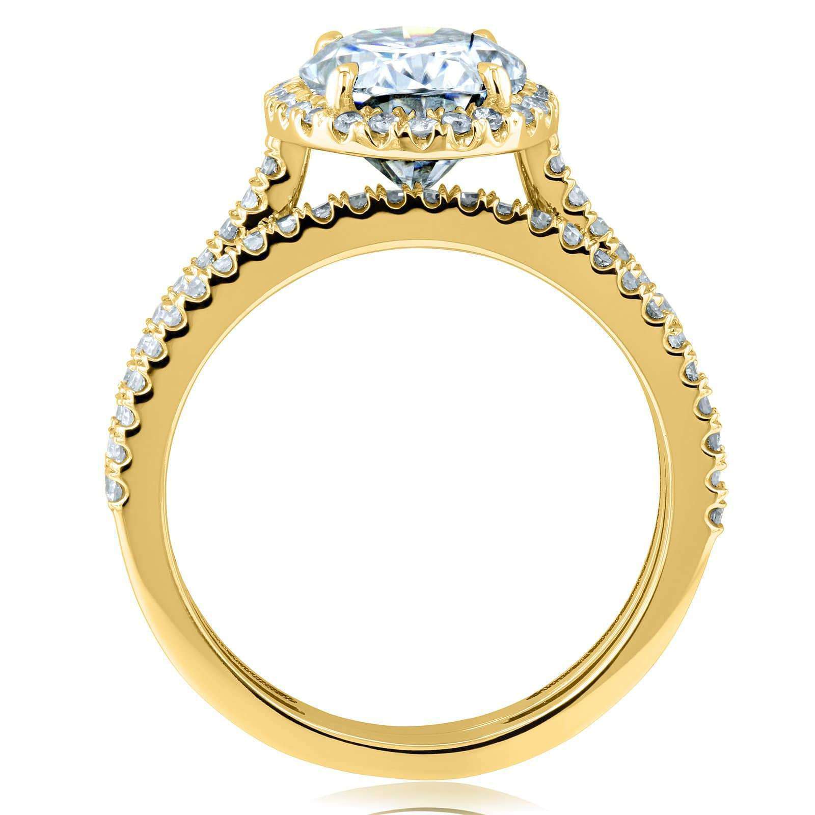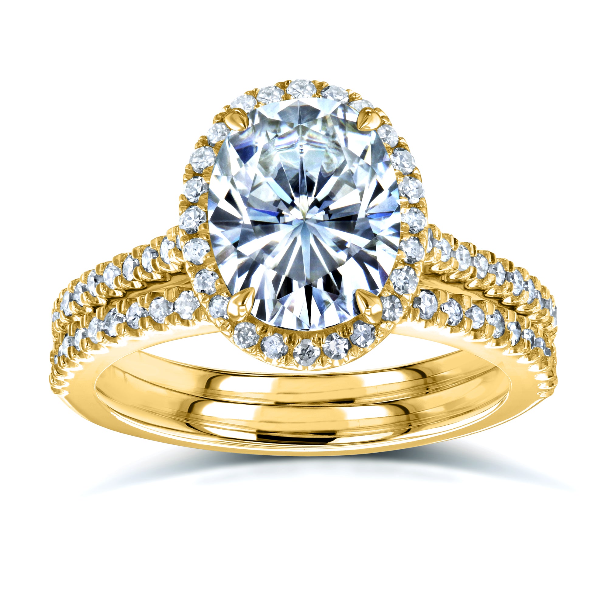 A two carat oval-cut moissanite captures the most brilliant of sparkles over this diamond and gold bridal set. Decorating this moissanite center stone are entirely natural earth mined diamonds for a perfect mix of contemporary and tradition. The moissanite showcases pristine clarity whereas the diamonds showcase shimmering luxury. The rings are made with 14-karat yellow gold and are finished with a beautiful high polish.
