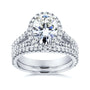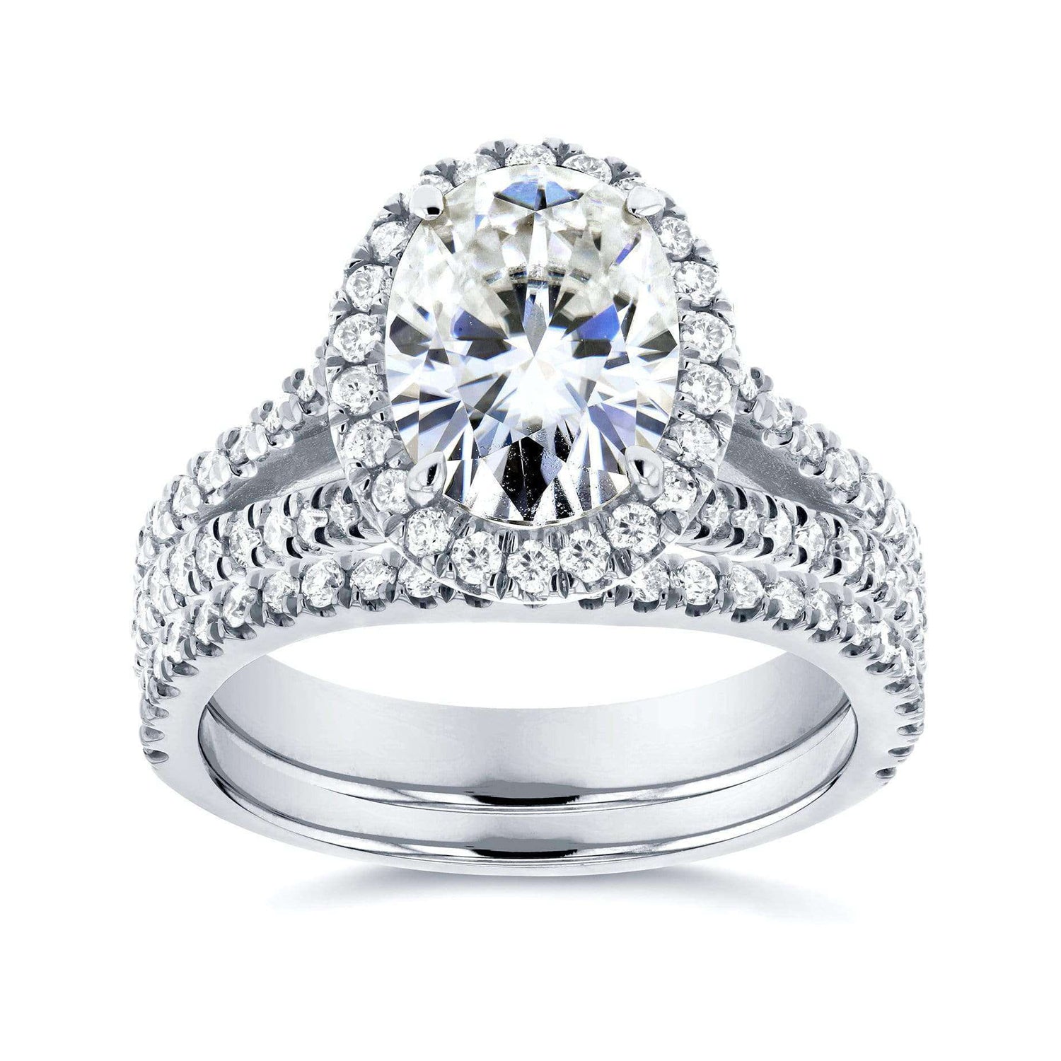 Oval Moissanite Bridal Set with Diamond Halo Split Shank 2 1/5 CTW 14k White Gold