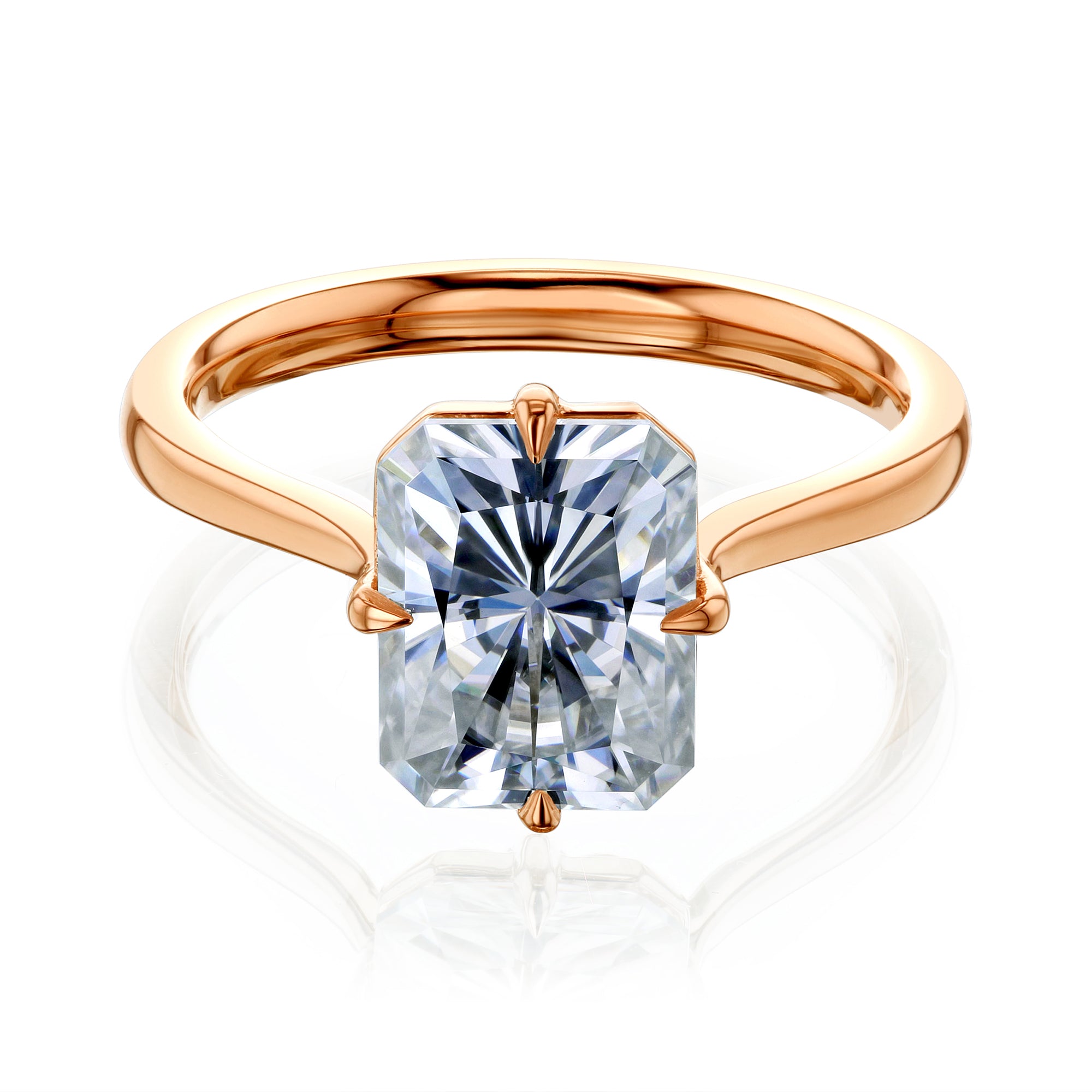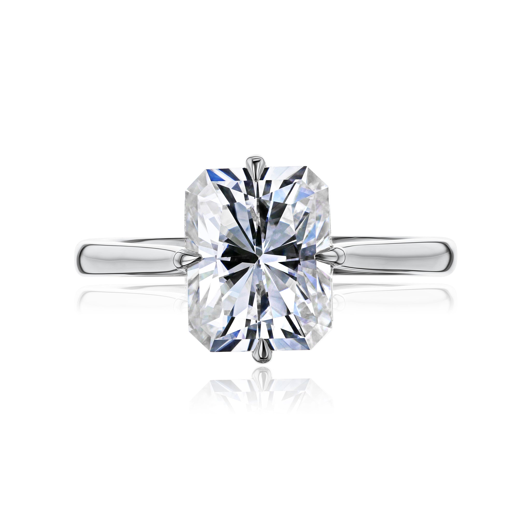 A solitaire 2.7 carat radiant-cut moissanite tops this minimalistic engagement ring in a clean design. The underside of your center hides away an adoring compass motif, taking your boundless quests readily though your journey of never-ending commitment.