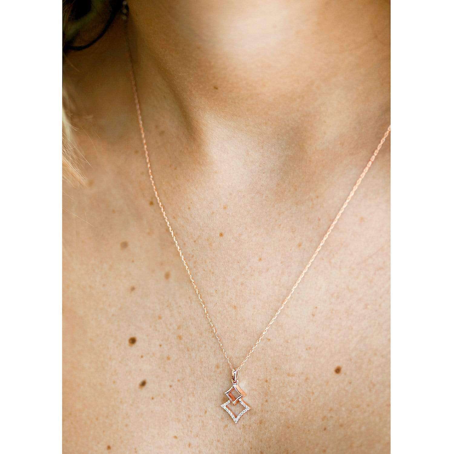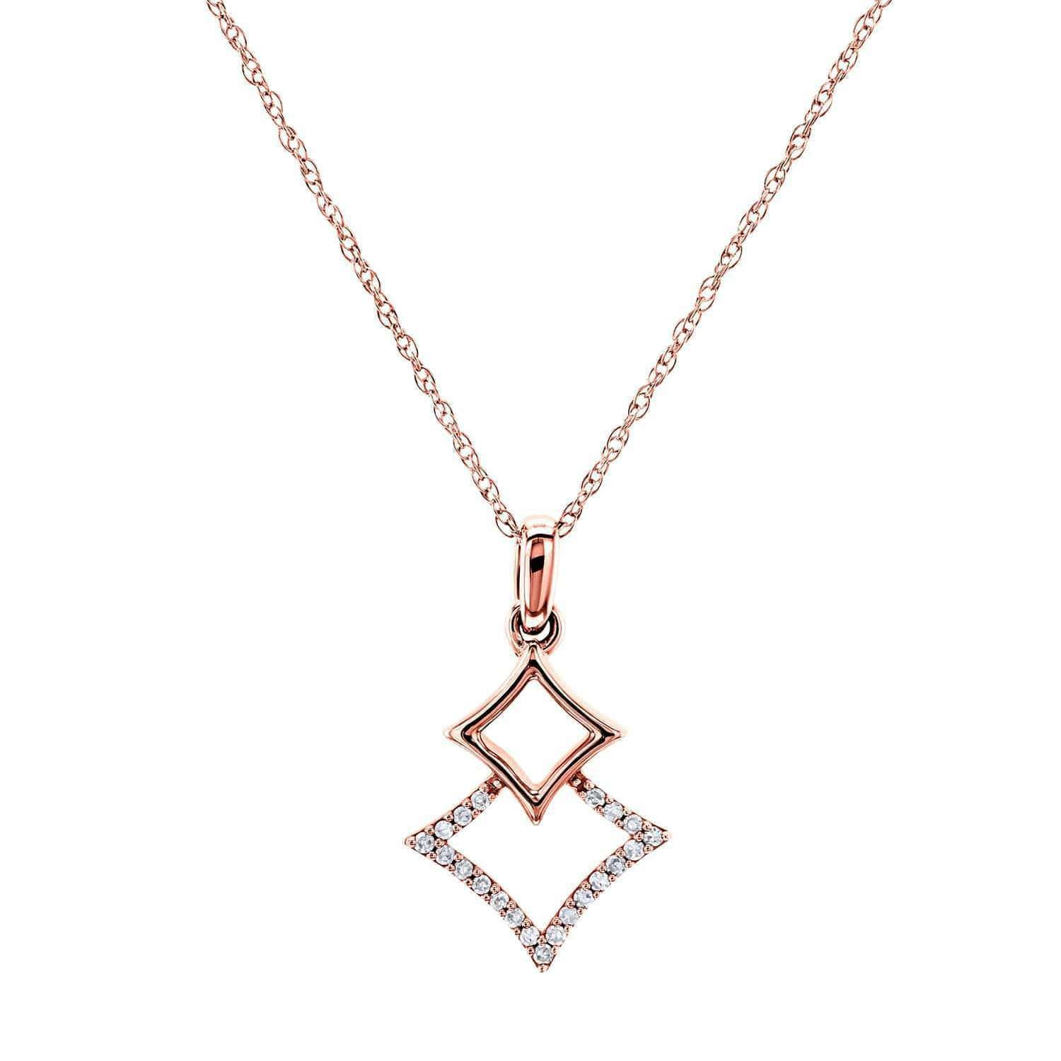 See what all the rave is about for geometric diamond fashion. This trendy necklace is accented with 0.06 carats of natural white diamonds over solid 10-karat rose gold. The pendant is strung to an 18 inch lightweight gold chain.