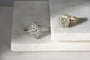 The opulent graduating halo of round lab-grown diamonds takes inspiration from the popular frocks adorned with frills and ruffles that conquered the royal court and beyond, with the setting of the rings emulating the gilded palace gates of Versailles.