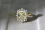 An enhanced one-of-a-kind version of previous August rings, this ring features entirely natural diamond gemstones. It features a 4.19 carat genuine cut corner rectangular modified brilliant diamond illuminated with a halo of 20 additional round diamonds prong-set in a stunning 14-karat solid yellow gold metal with a high polish finish.