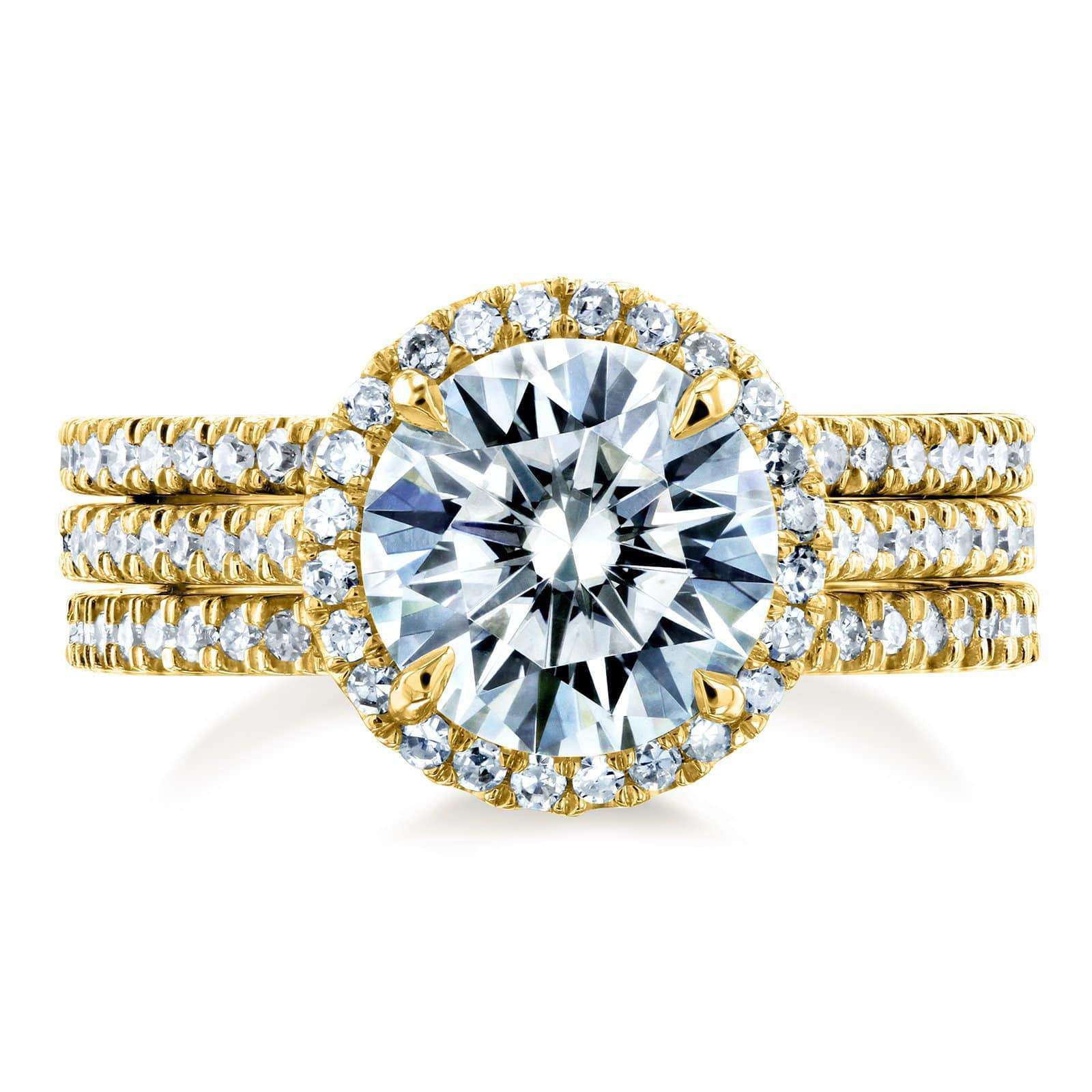 An 8mm round brilliant-cut moissanite captures a spectacle of sparkles over this diamond and gold 3-piece bridal rings set. Decorating this moissanite center stone are entirely natural earth mined diamonds for a perfect mix of contemporary and tradition. The moissanite showcases pristine clarity whereas the diamonds showcase shimmering luxury. The 3 rings are made with 14-karat yellow gold and are finished with a beautiful high polish.