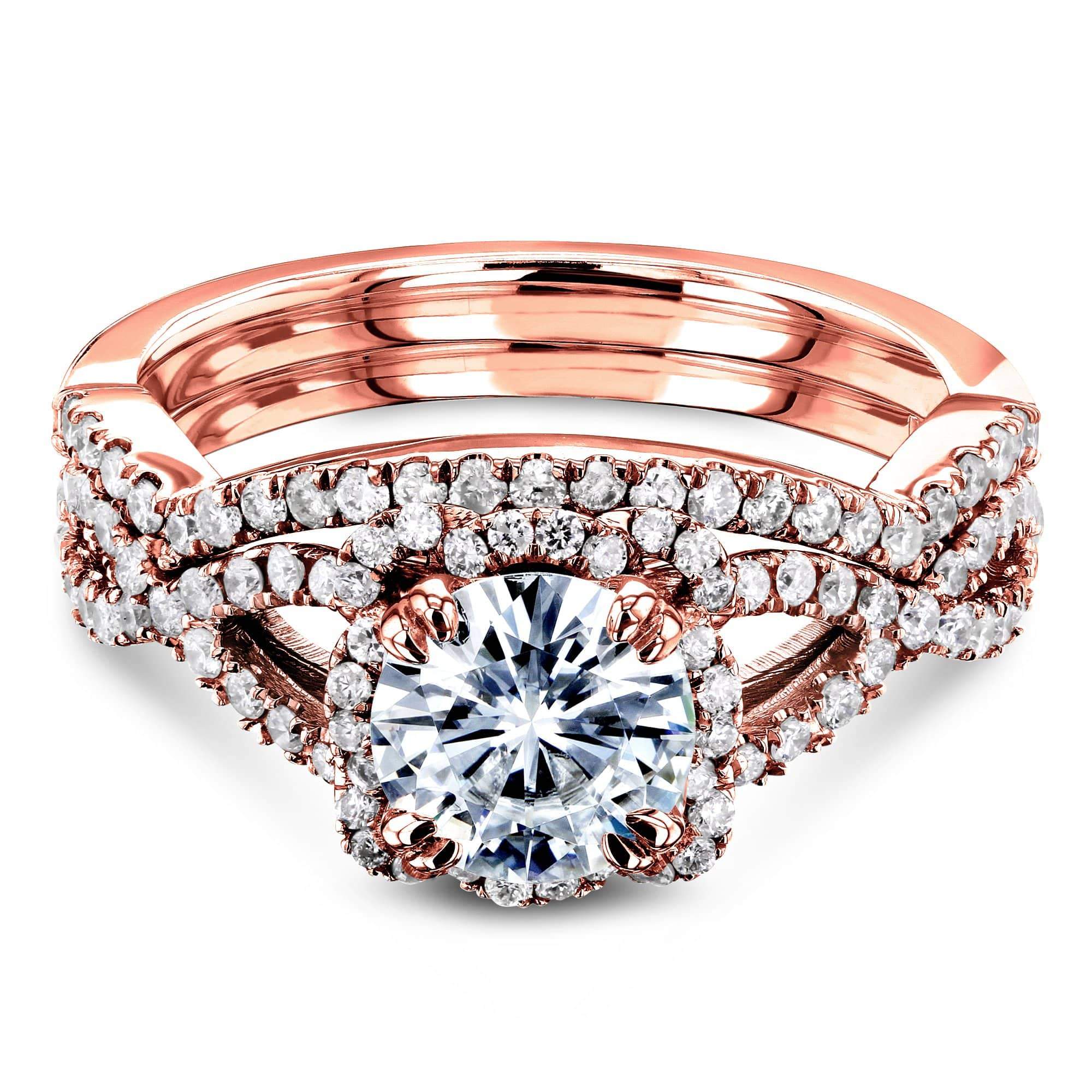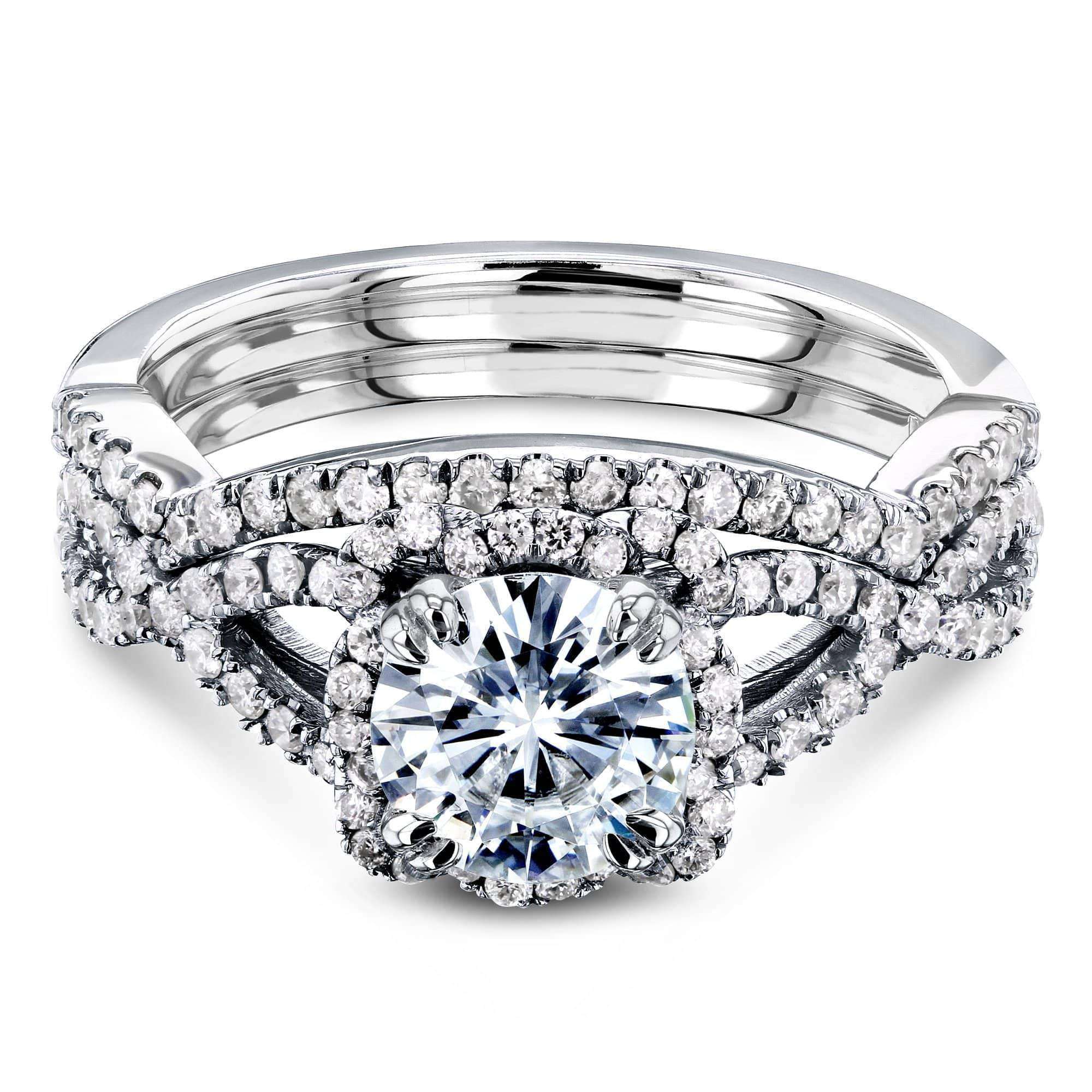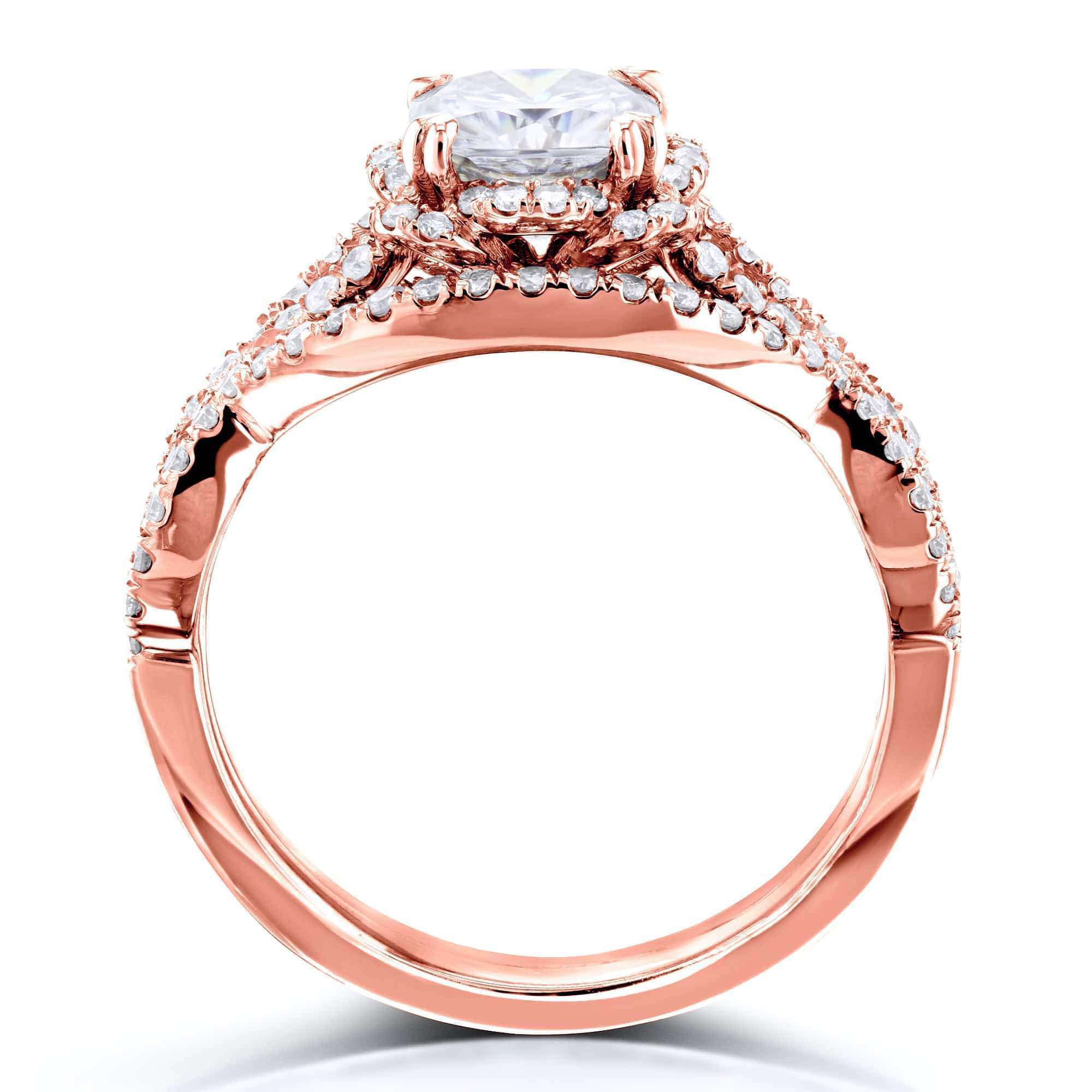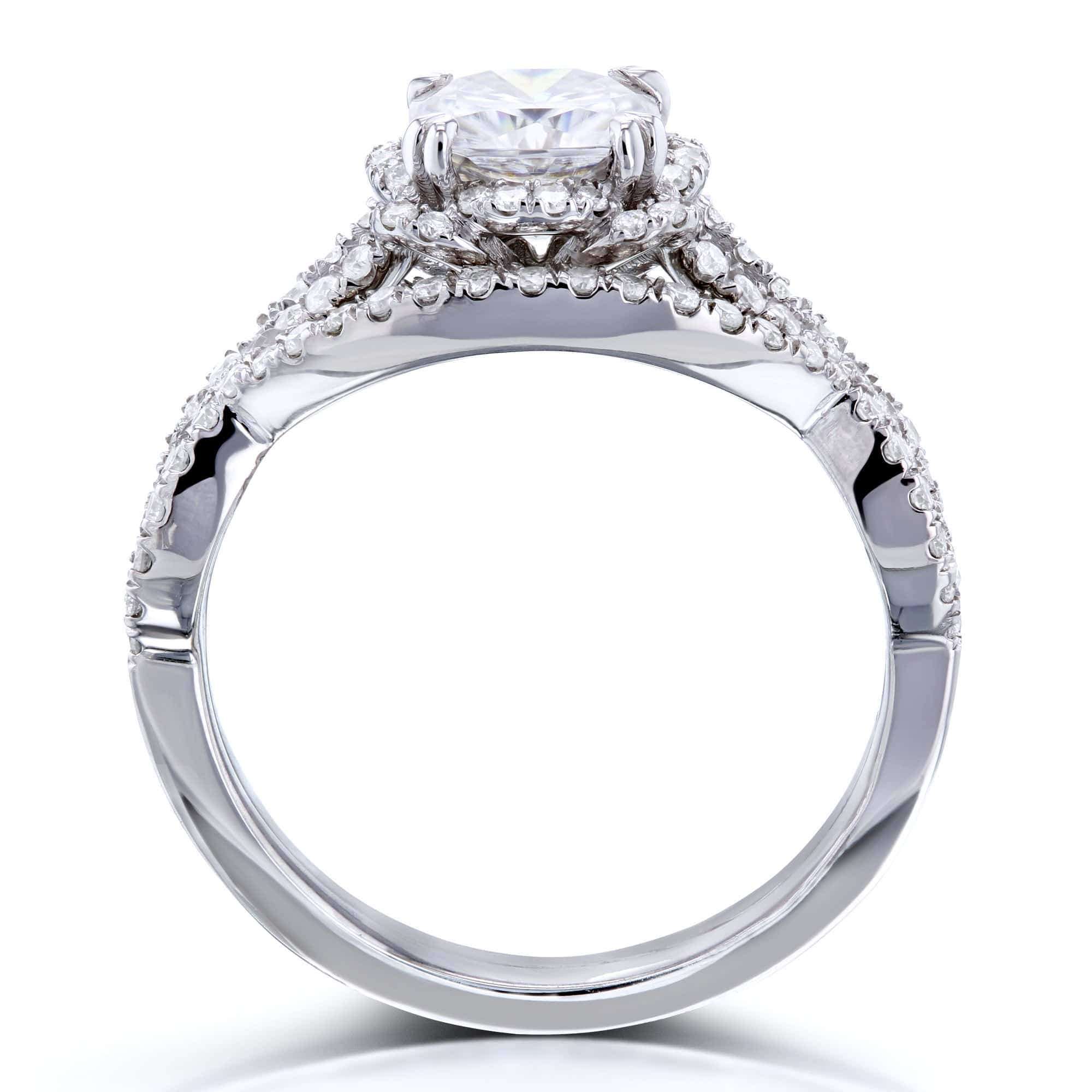 Real white diamonds wrap around a lab-grown moissanite center stone on this 14k gold bridal set. The ring twists into an open cross shank. Four loops along the bridge of the ring lead into the halo for a fancy halo setting.