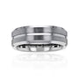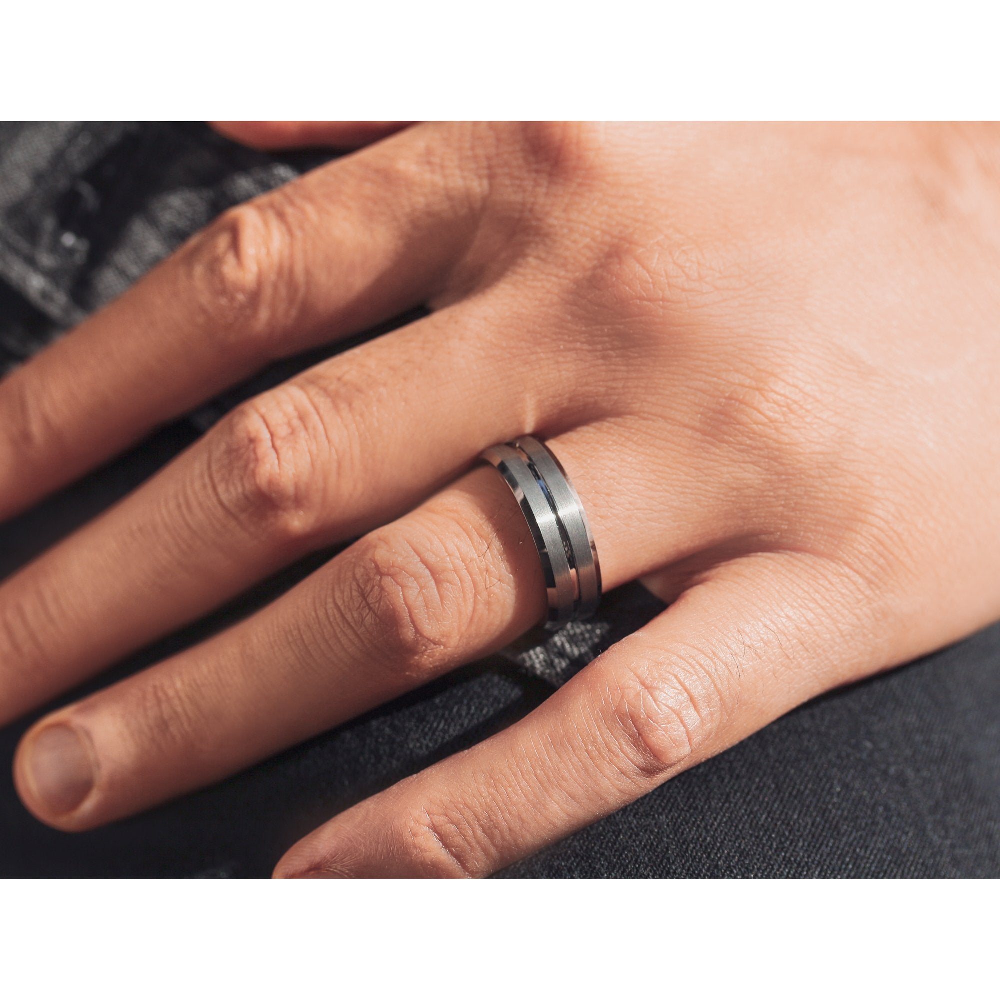 This 7mm band features a shiny grooved center with brushed sides. This scratch resistant ring is highly durable and made to last a lifetime.