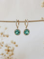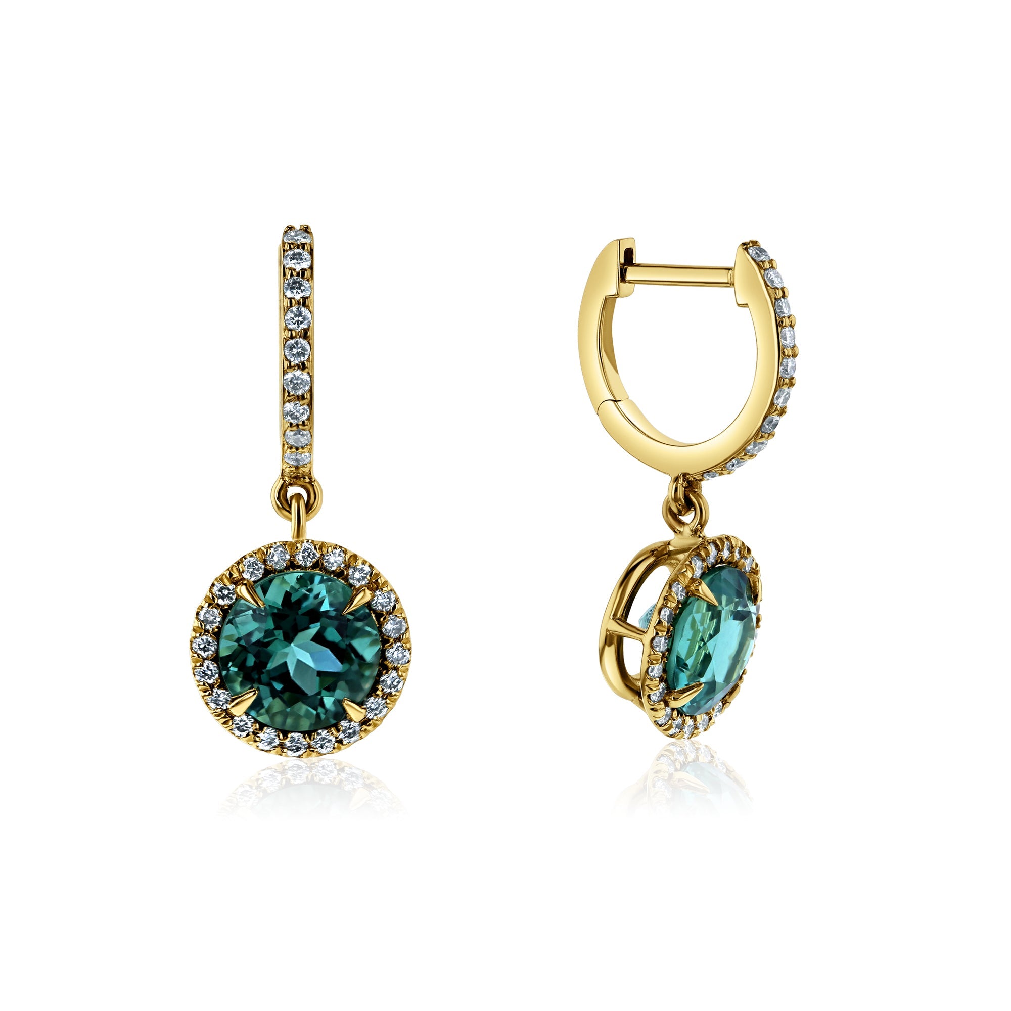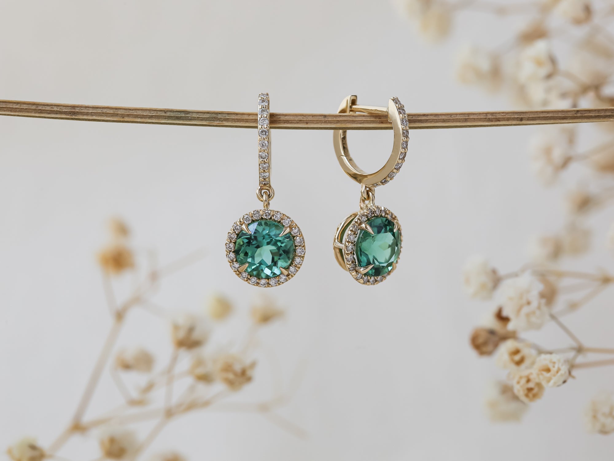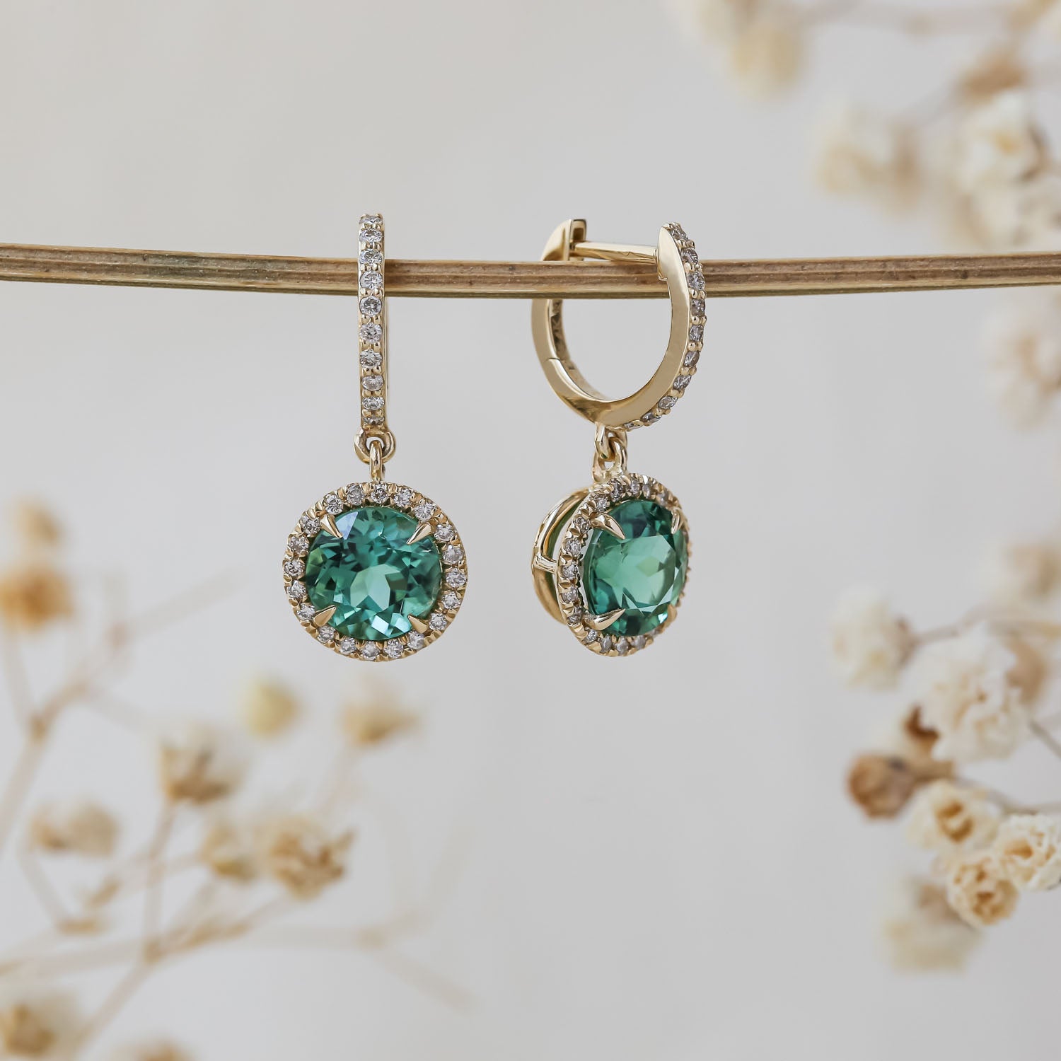 Seafoam green tourmaline gemstones situate in a halo of diamonds on each earring of this 2-piece set. Genuine natural light brown diamonds line both the hoops and halos in solid 14k yellow gold.